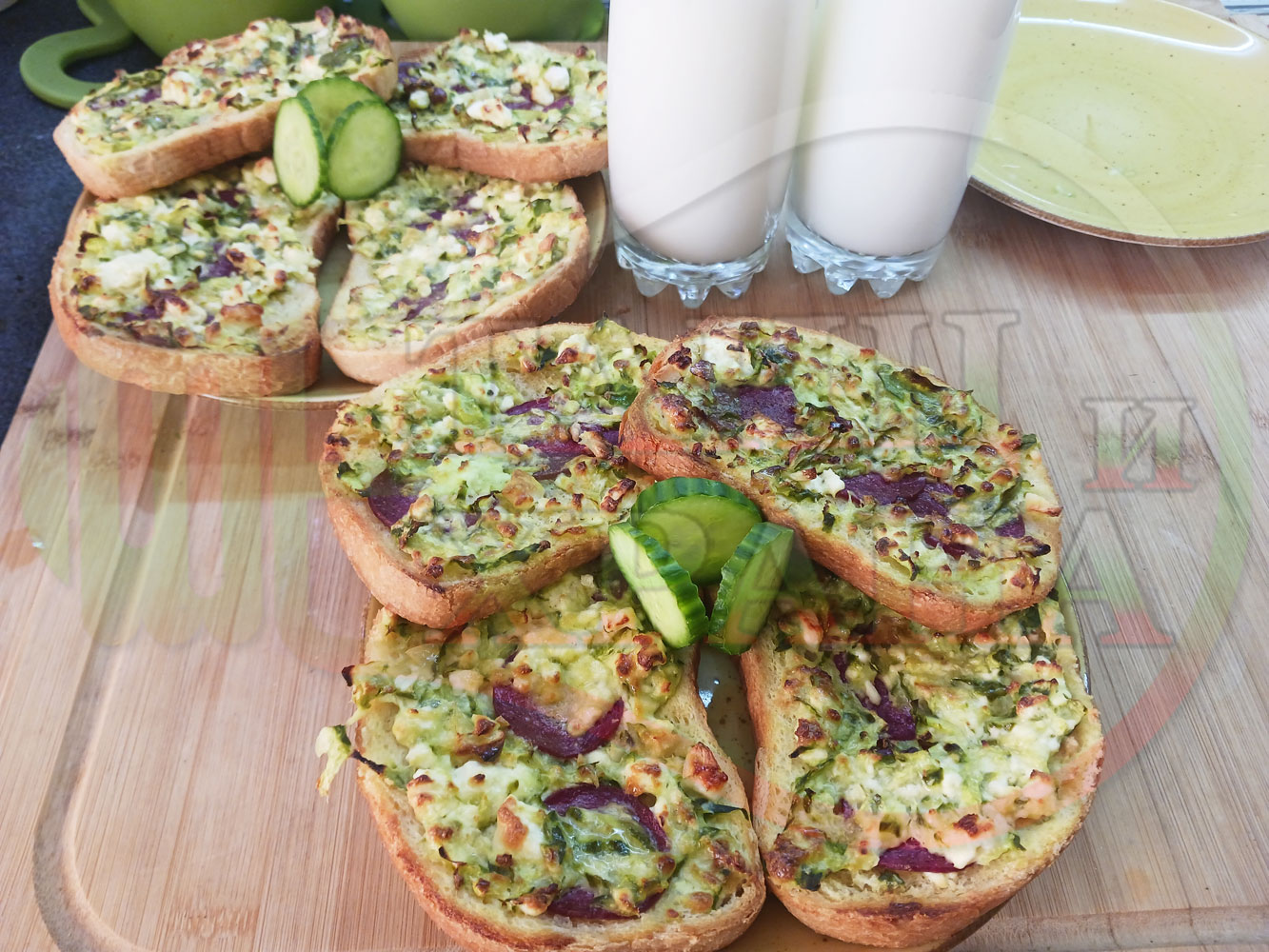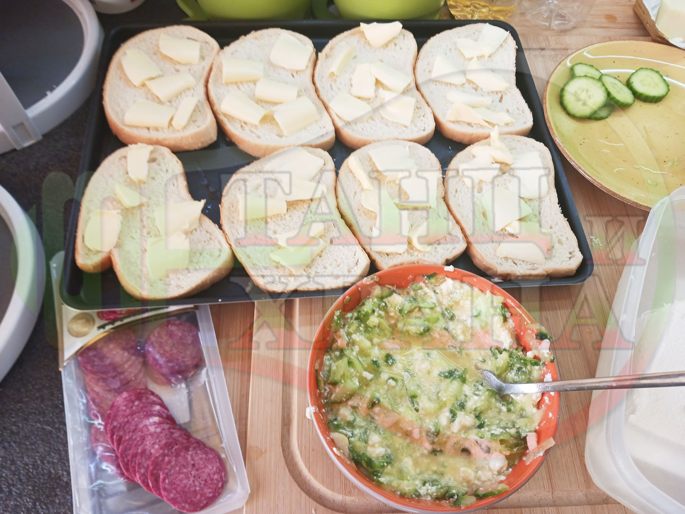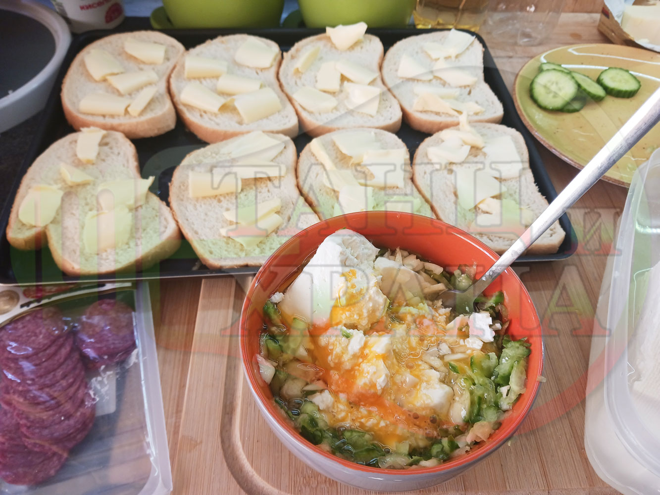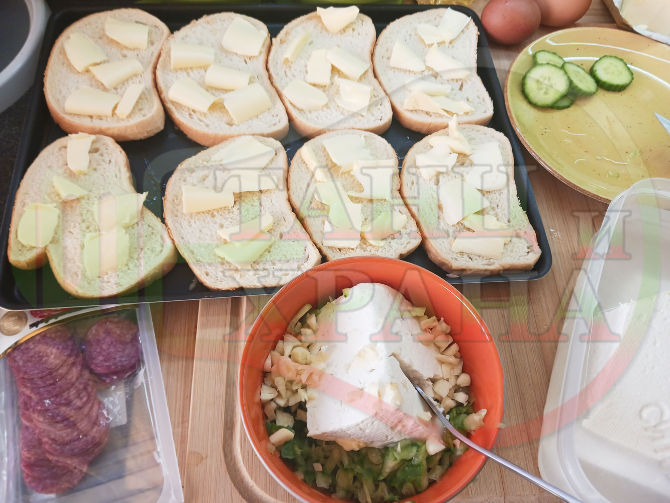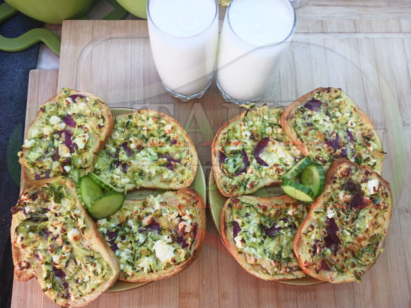 Български филийки "Краставичнояйчени чеснови с БГсирене" запечени на фурна с краве масло, луканков колбас и яйчено сиренова плънка с пресни краставици, яйца, стар чесън и краве бяло сирене (българско, саламурено)