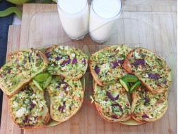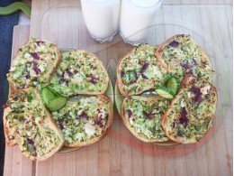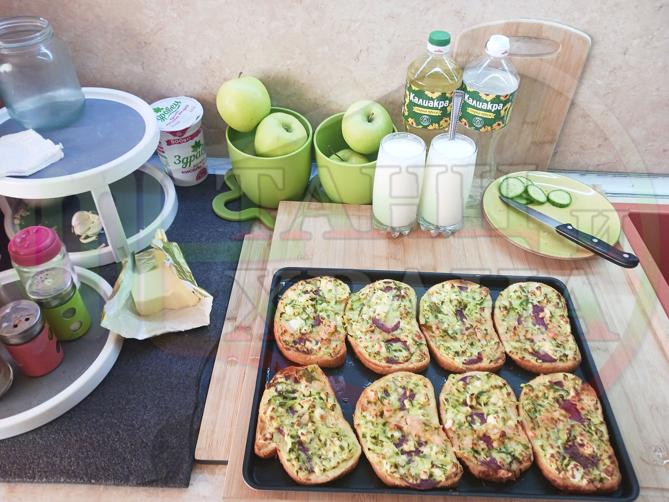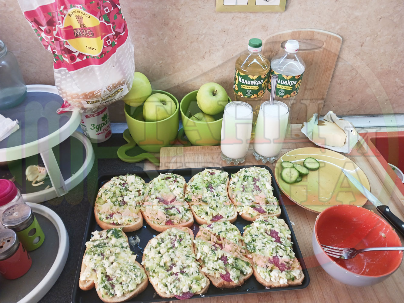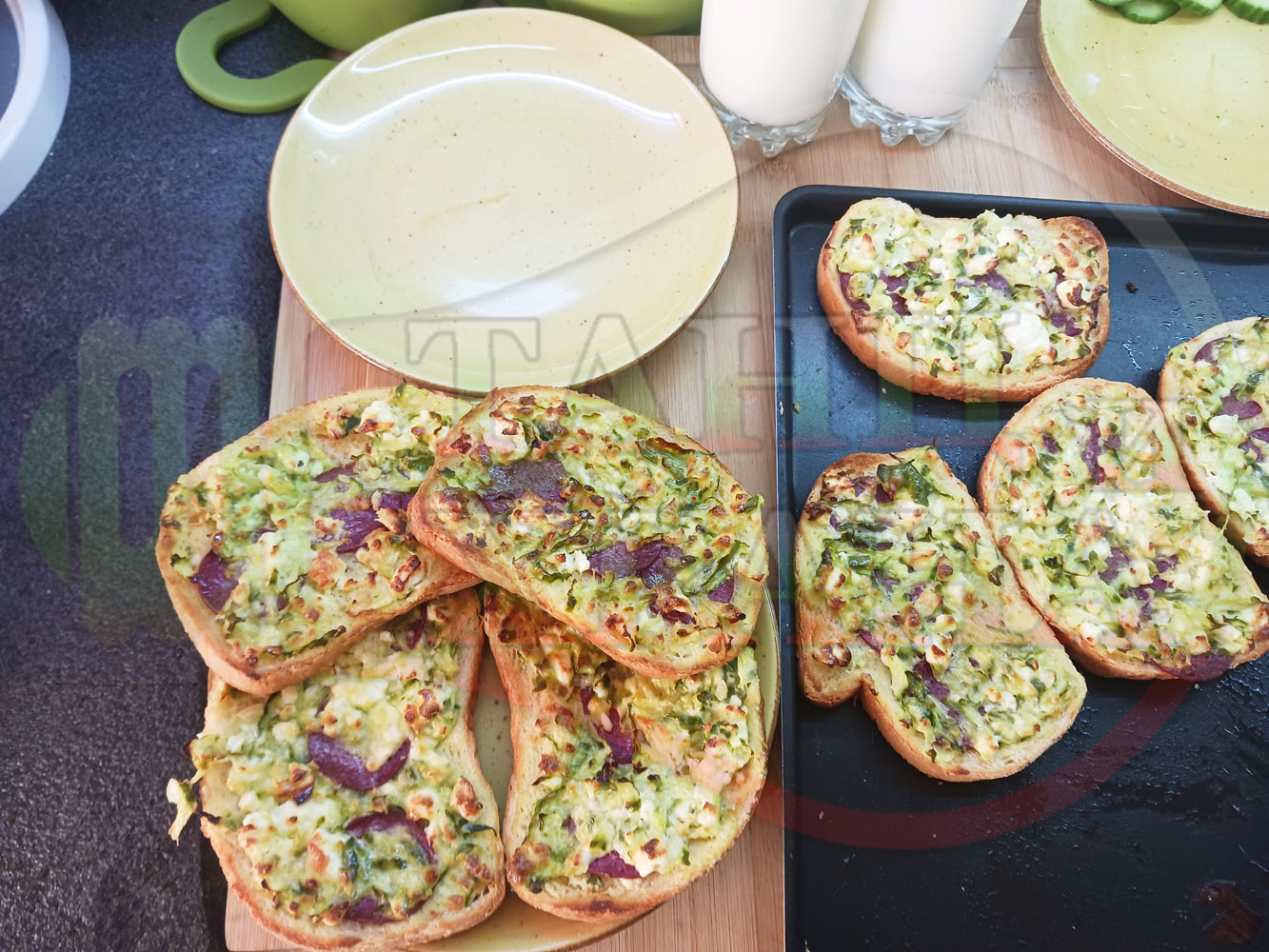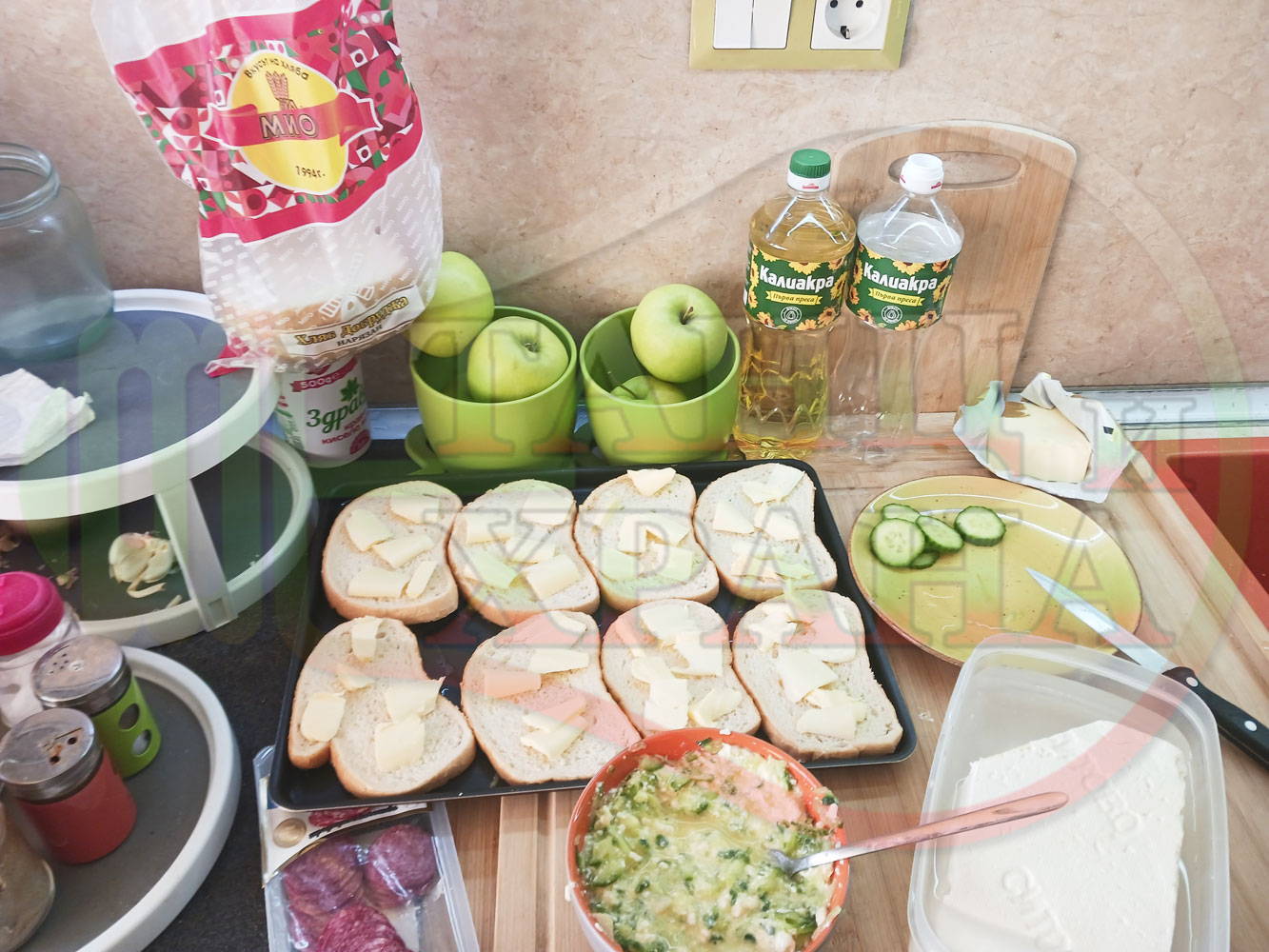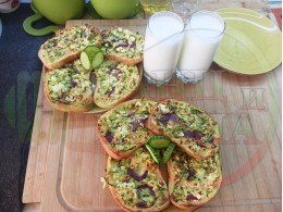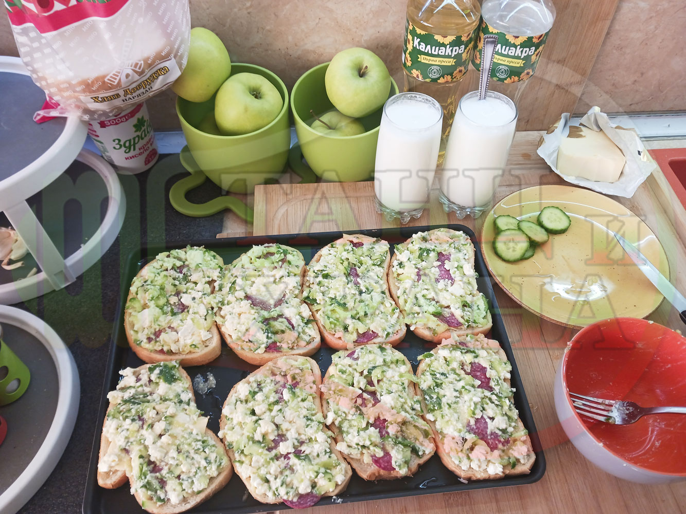 Български филийки "Краставичнояйчени чеснови с БГсирене" запечени на фурна с краве масло, луканков колбас и яйчено сиренова плънка с пресни краставици, яйца, стар чесън и краве бяло сирене (българско, саламурено)