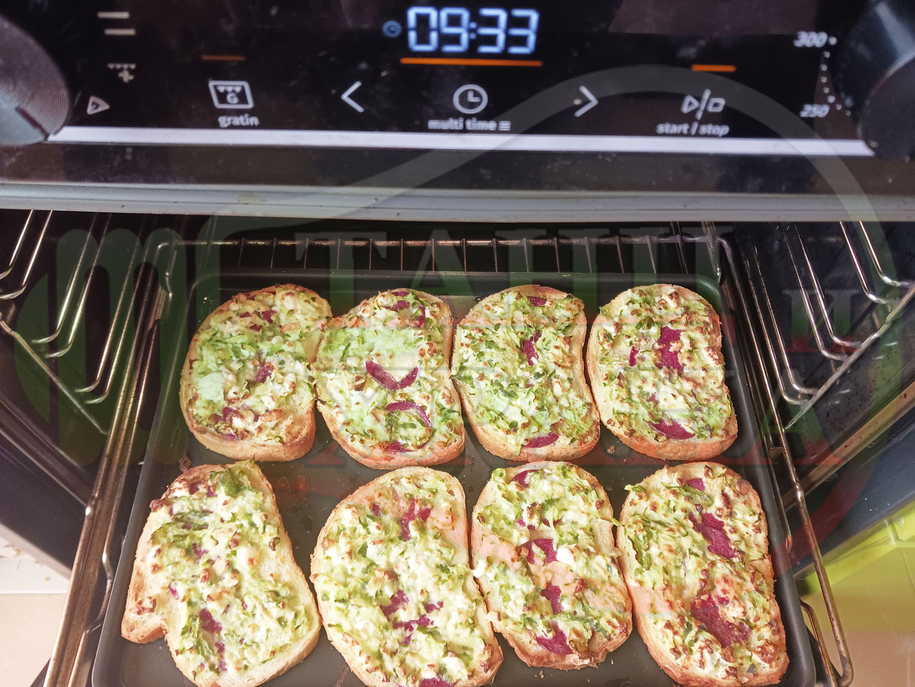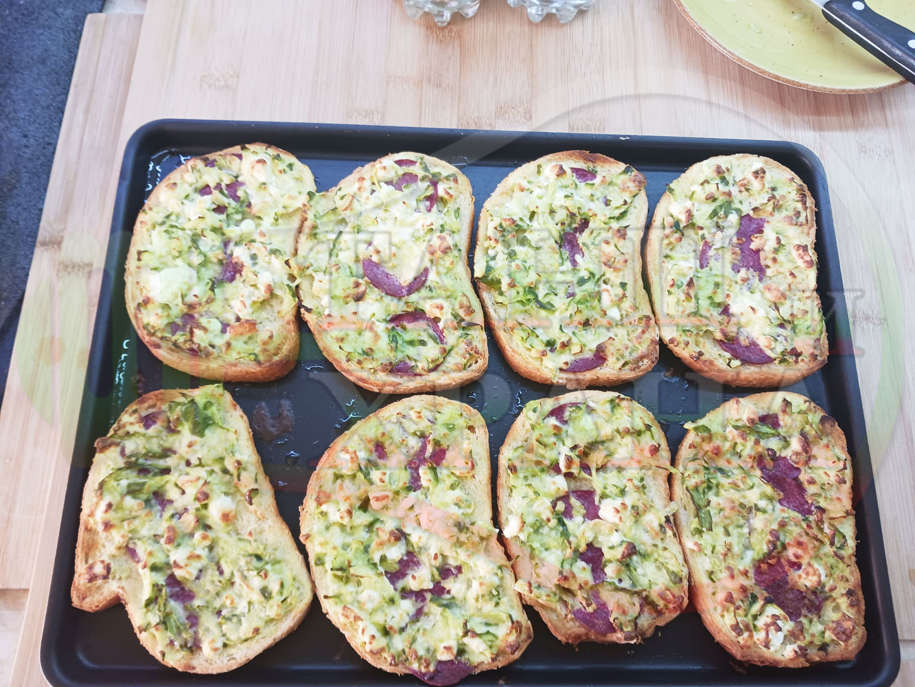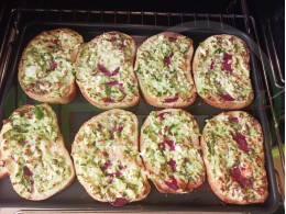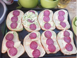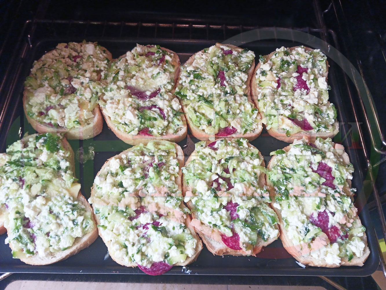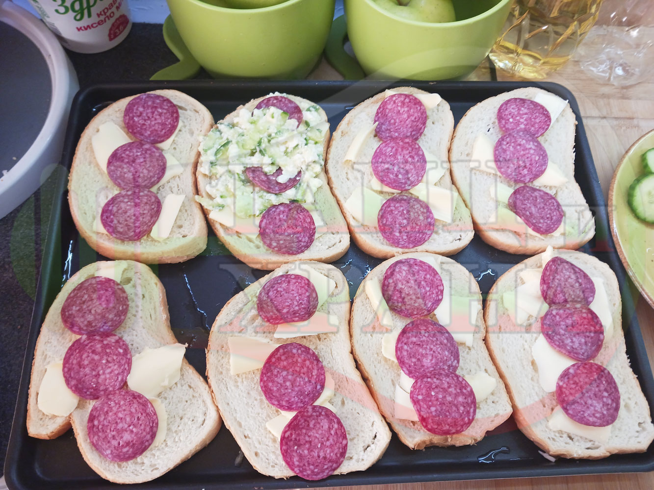 Разпределете равномерно плънката върху луканково колбасовите кръгчета на всяка филийка, така че да покрие коричката на хляба. Поставете тавата в предварително загрятата фурна (загрейте я за поне 5 минути). Запечете на фурна без вентилатор на 180 градуса за около 25 минути.