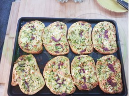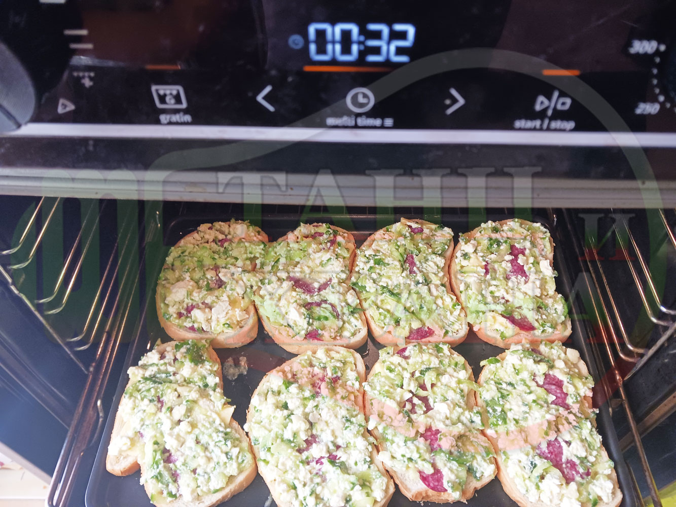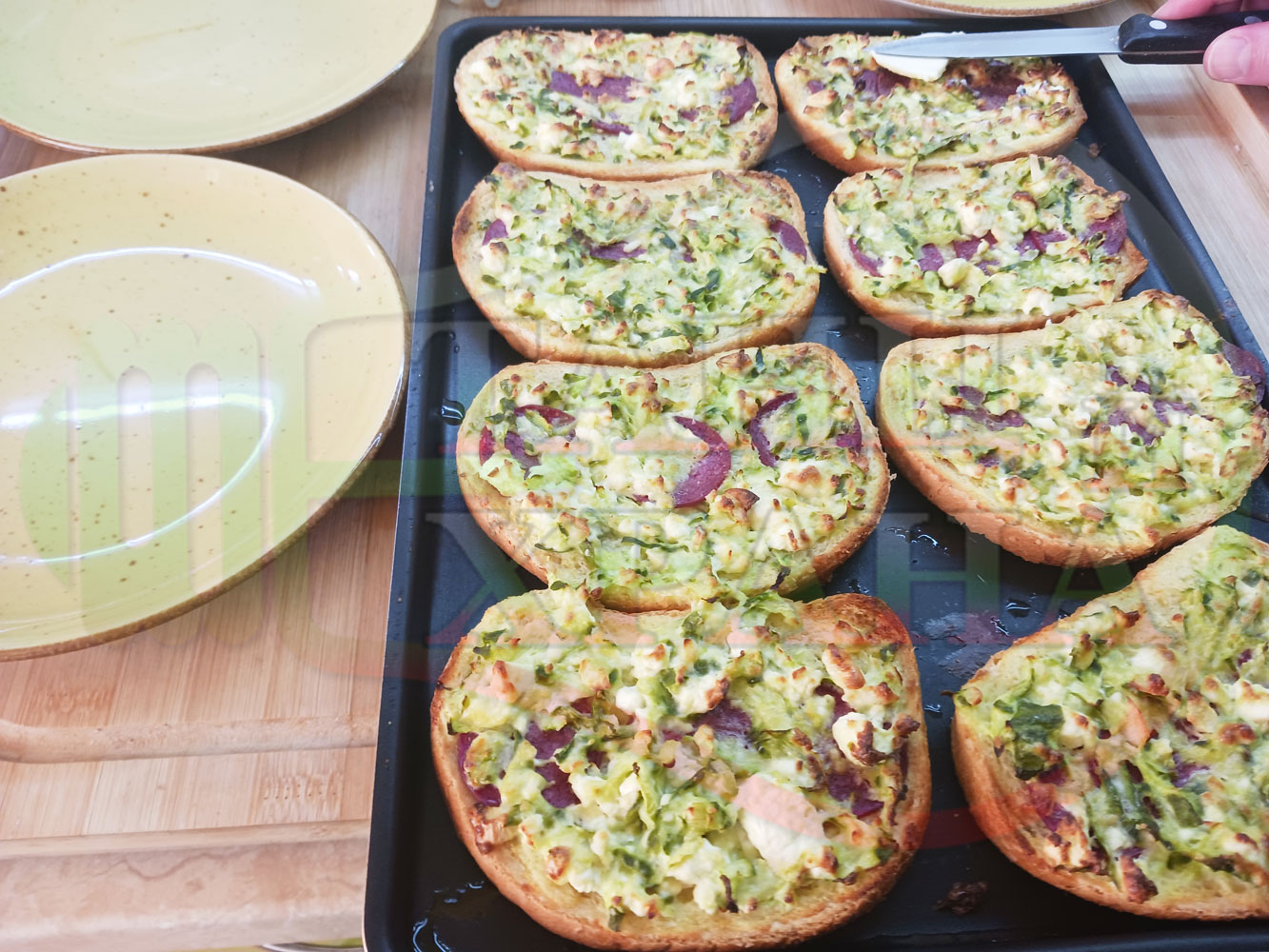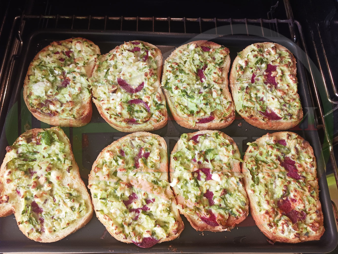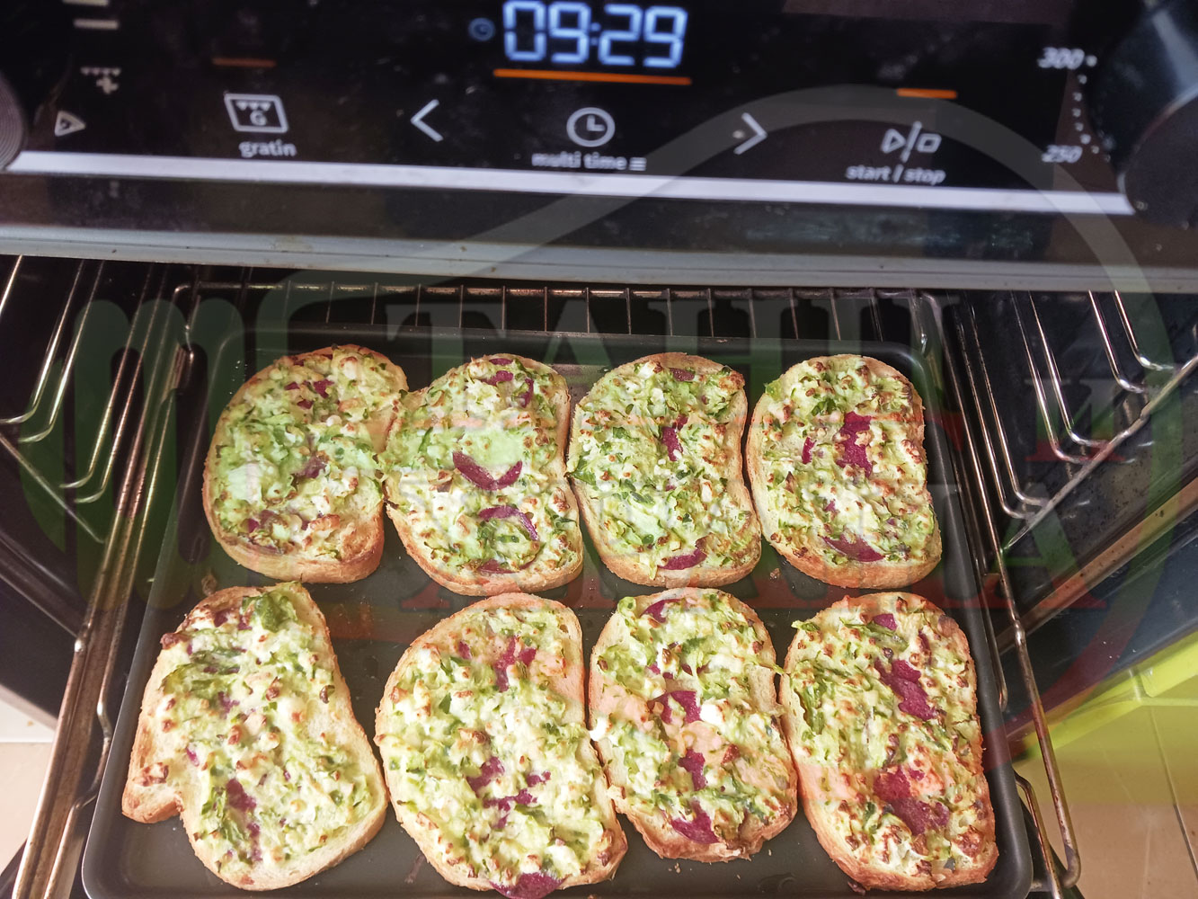 Разпределете равномерно плънката върху луканково колбасовите кръгчета на всяка филийка, така че да покрие коричката на хляба. Поставете тавата в предварително загрятата фурна (загрейте я за поне 5 минути). Запечете на фурна без вентилатор на 180 градуса за около 25 минути.