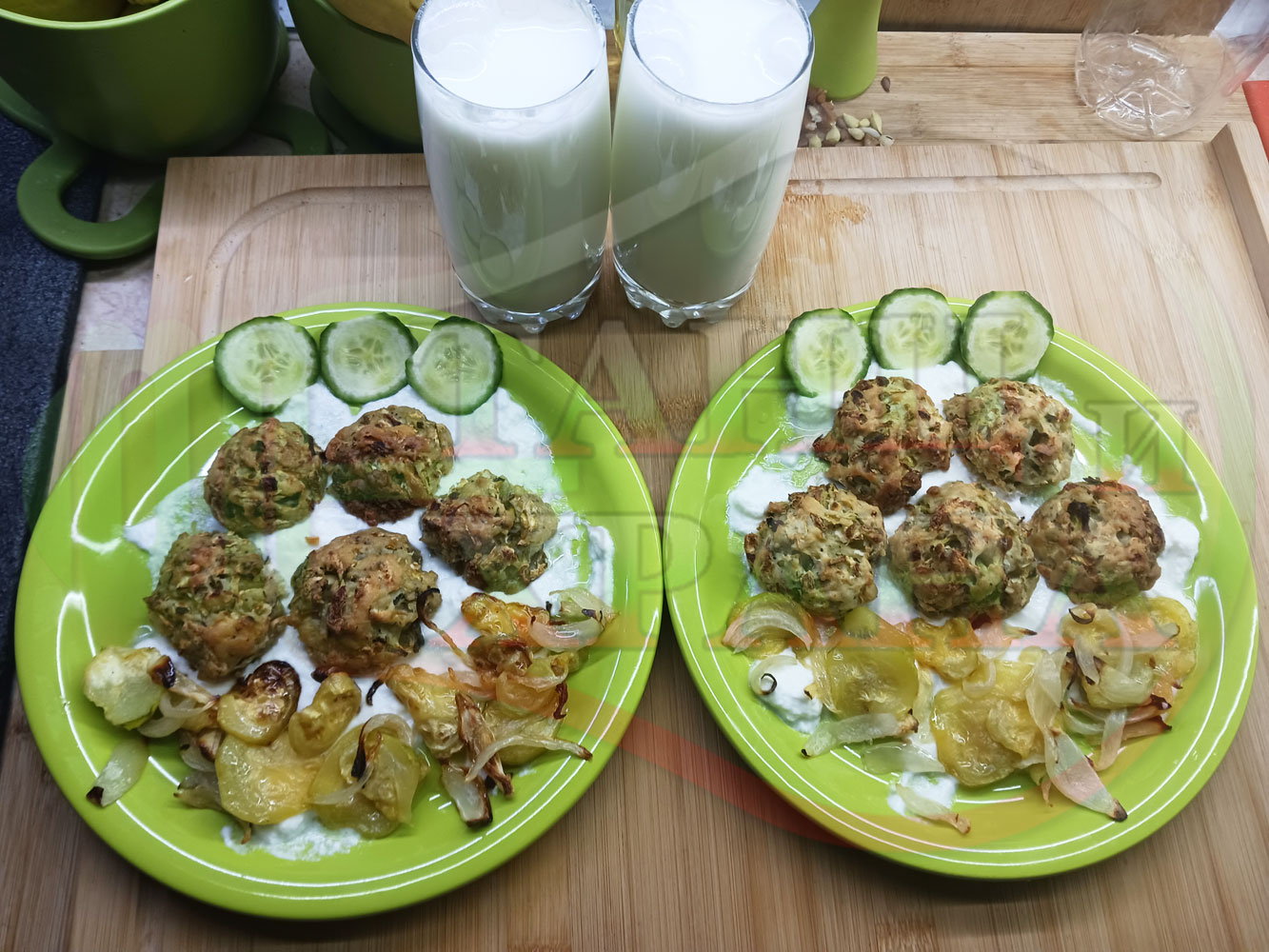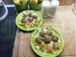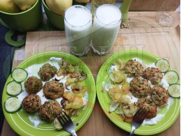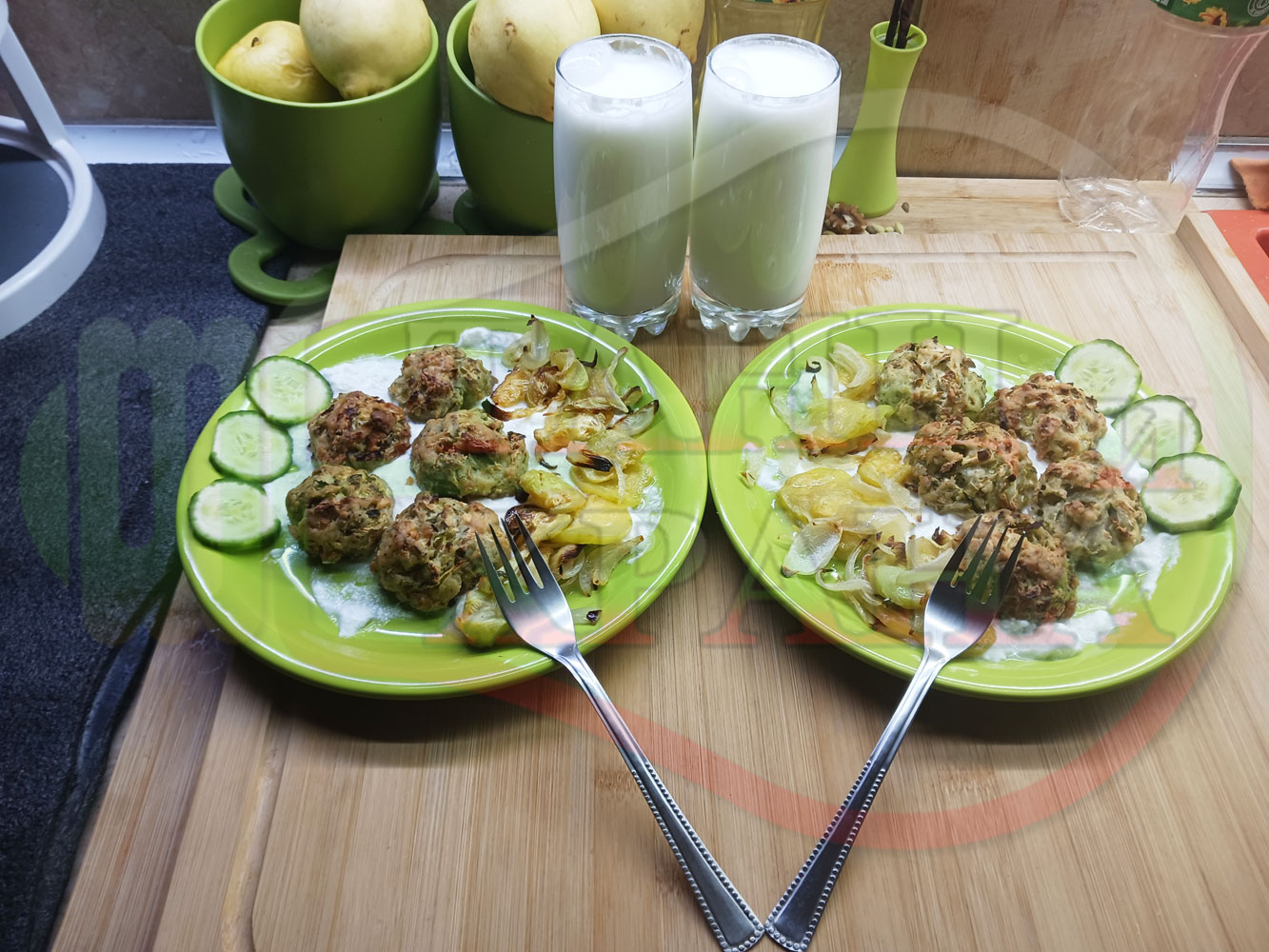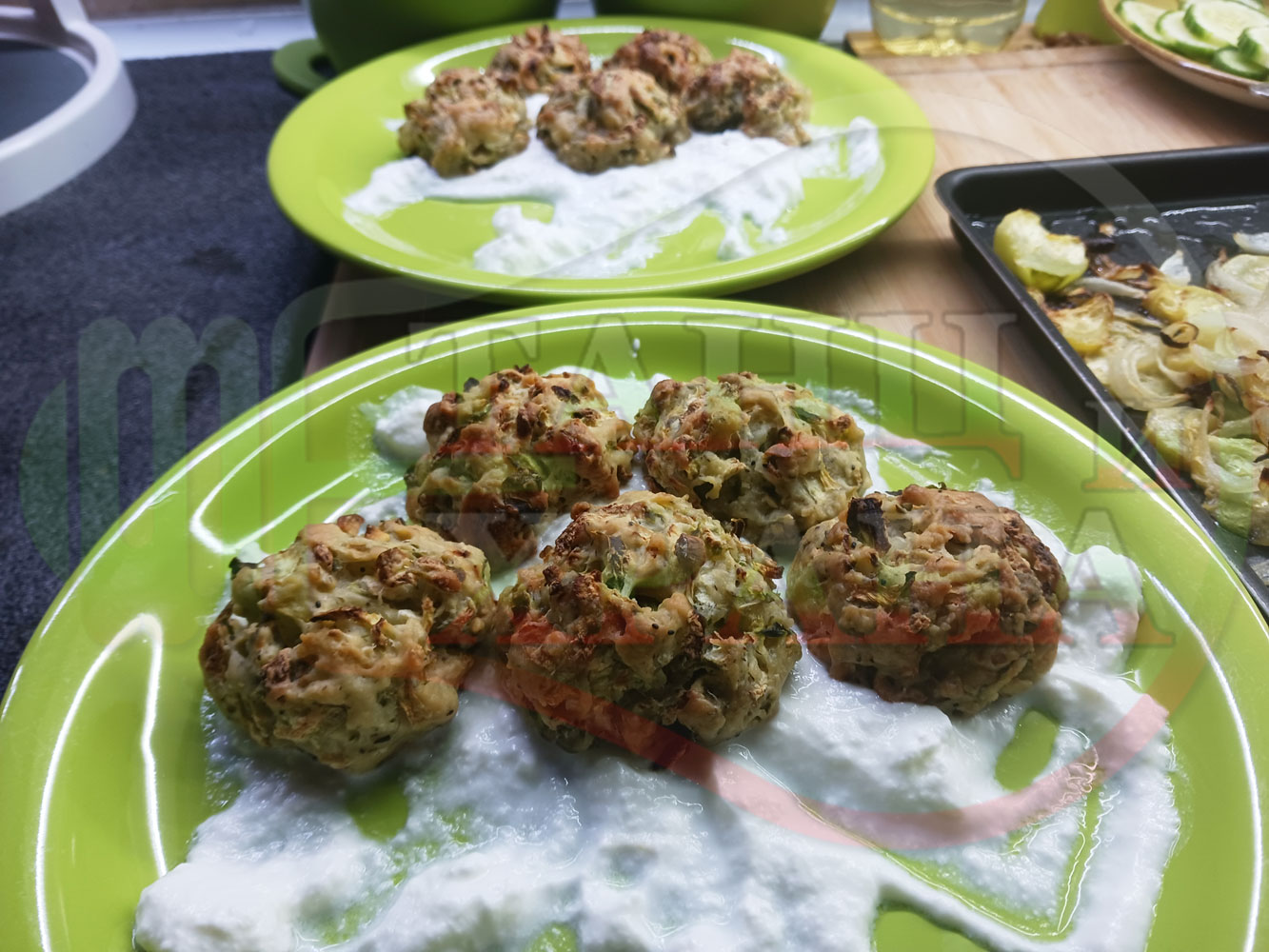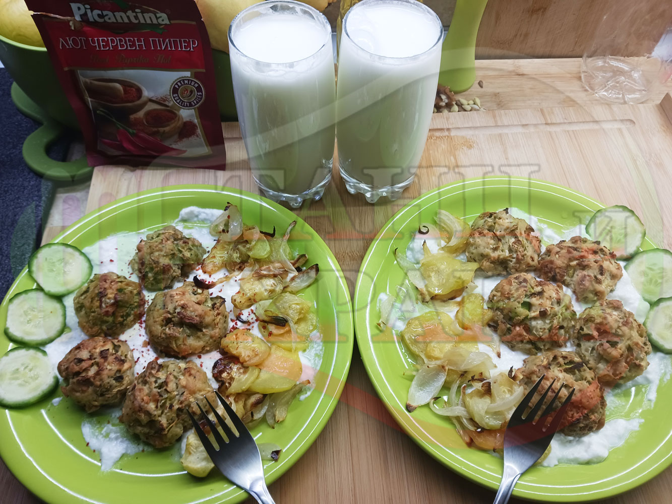 Зеленчукови кюфтенца "Краставичночеснови БГмерудийни" приготвени с пресни краставици, ронена чубрица, слънчогледово олио и стар чесън подходящи за постещи хора гарнирани с млечна основа с кисело мляко от България за непостещи