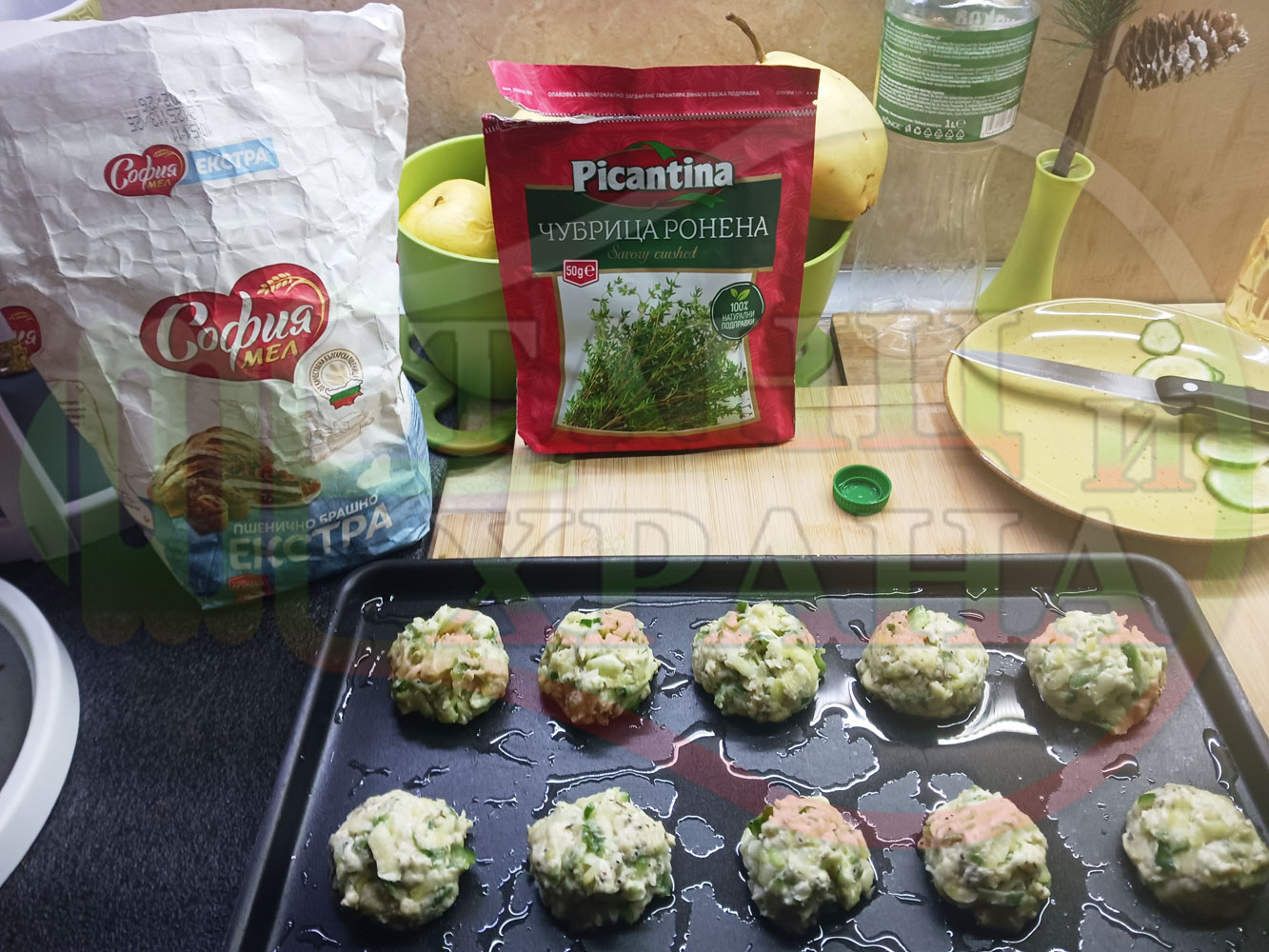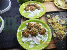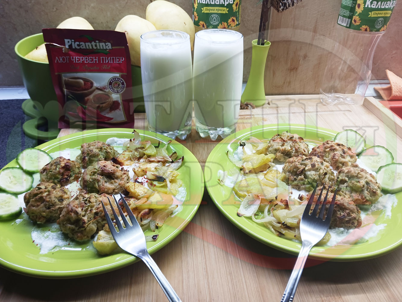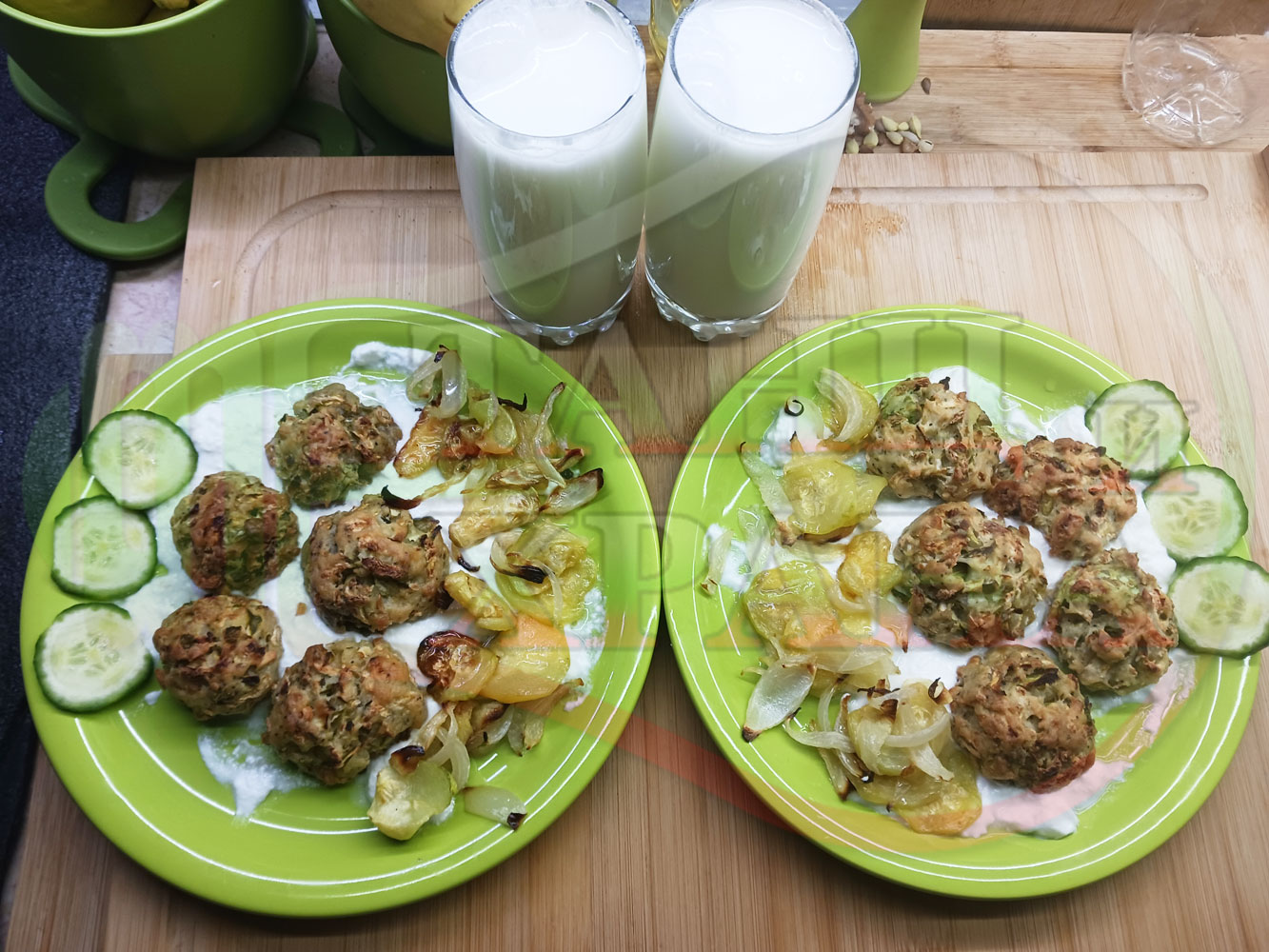 Зеленчукови кюфтенца "Краставичночеснови БГмерудийни" приготвени с пресни краставици, ронена чубрица, слънчогледово олио и стар чесън подходящи за постещи хора гарнирани с млечна основа с кисело мляко от България за непостещи