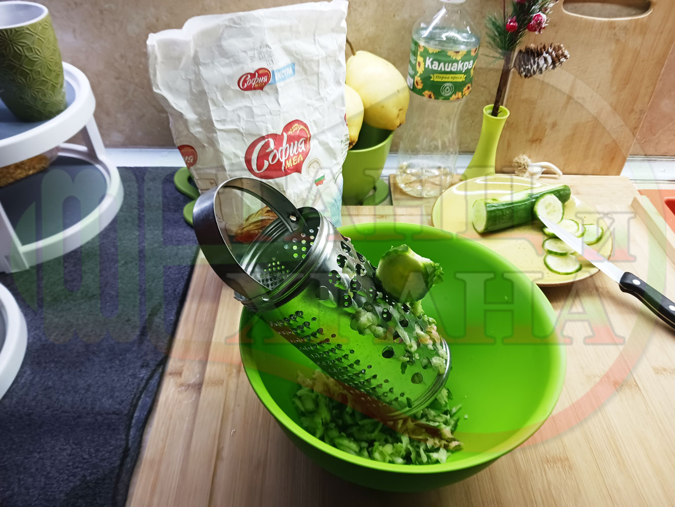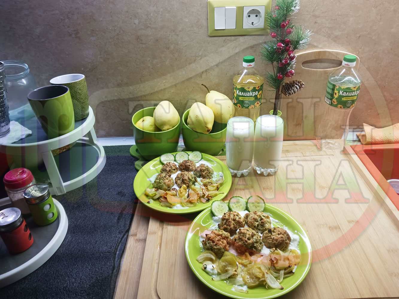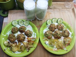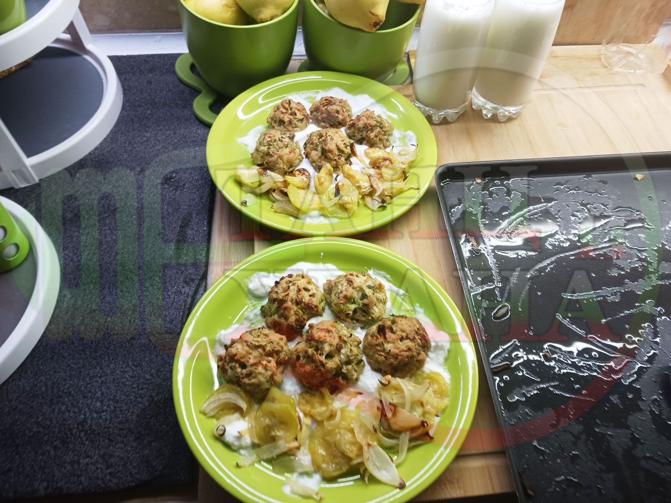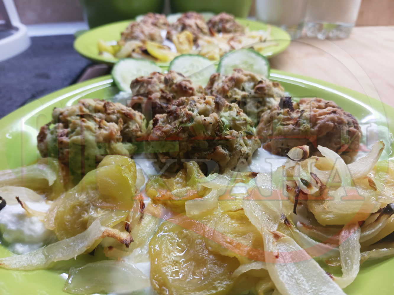 Зеленчукови кюфтенца "Краставичночеснови БГмерудийни" приготвени с пресни краставици, ронена чубрица, слънчогледово олио и стар чесън подходящи за постещи хора гарнирани с млечна основа с кисело мляко от България за непостещи