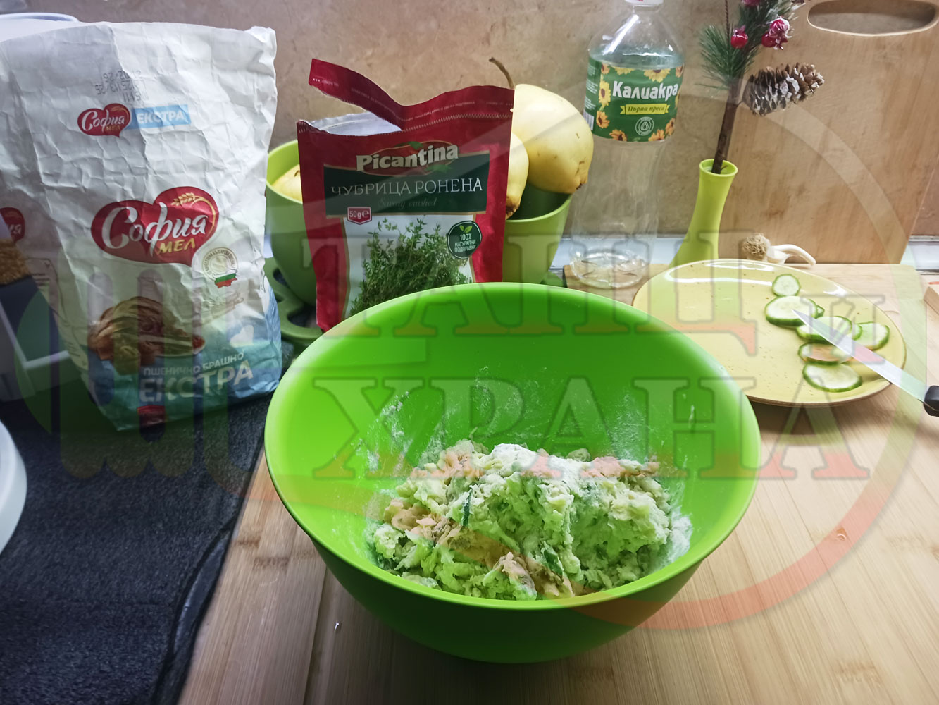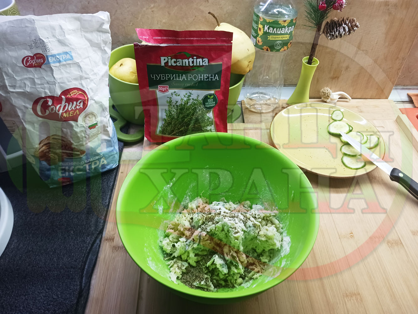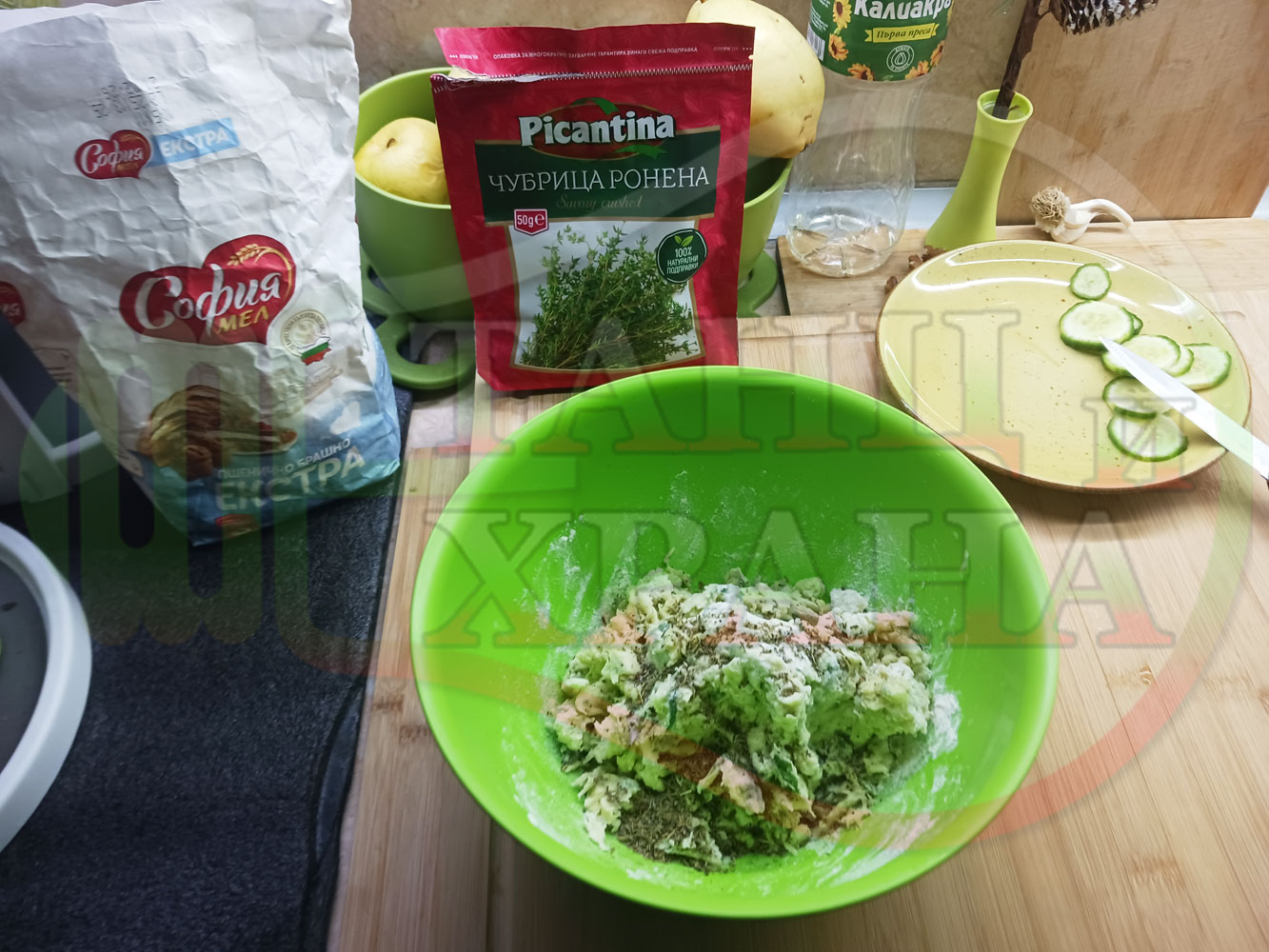 Измийте краставицата, настържете я на едро в купа, сипете слънчогледовото олио, брашното и ронената чубрица и добавете обеления и нарязан на едро стар чесън (нарежете част от краставицата на кръгчета за украса). Започнете да замесвате тестото и поръсвайте с брашно при необходимост до пълното отлепяне на тестото от купата (готовото тесто се отлепя лесно от купата). Оформете топка от тестото и го разпределете на малки топчета според броя на кюфтенцата, които искате да приготвите (от описаните количества се получават 10 малки към средно големи кюфтенца).