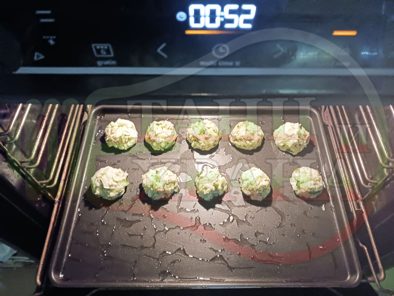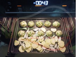 Сипете слънчогледово олио в тава за печене и го размажете равномерно по тавата чрез накланяне или с четка. Оформете от топчетата средни към големи кюфтенца и ги подредете в тавата с отстояние между тях. Поставете тавата в предварително загрятата фурна (загрейте я за поне 5 минути). Запечете на фурна без вентилатор на 180 градуса за около 35 минути.