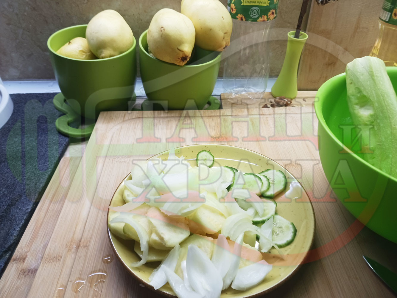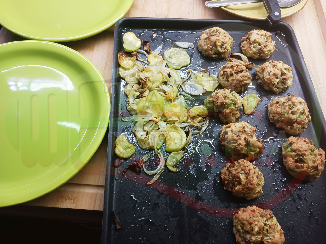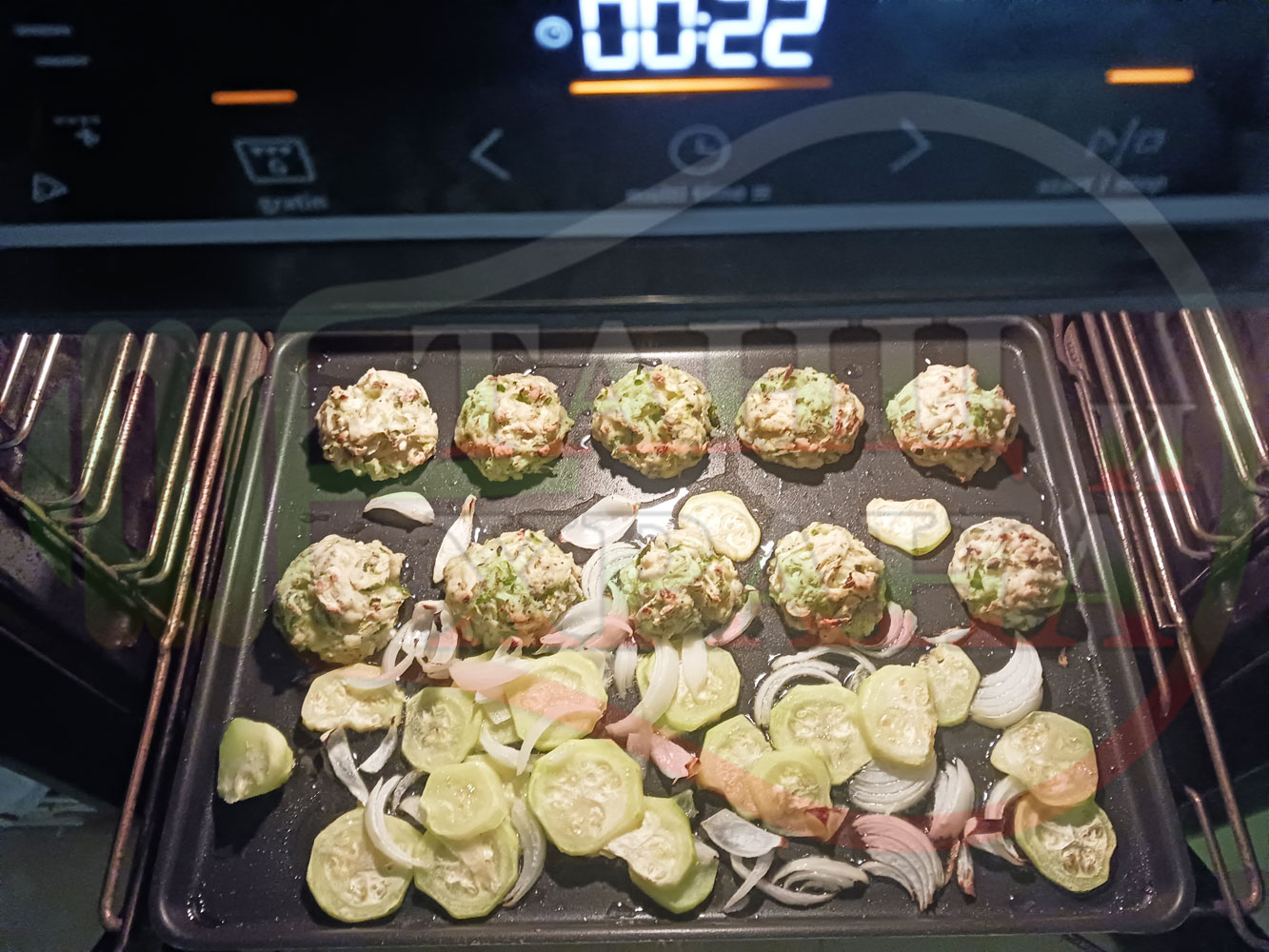 Измийте тиквичката, обелете кората, в случай че има по-големи нарянявания, нарежете я на кръгчета и я добавете към краставичните кюфтенца заедно с обеления, измит и нарязан на ивички кромид лук около 20 минути преди края на зададеното време. Дозапечете краставичните кюфтенца и гарнитурата до желаната от вас степен (средно запечени кюфтенца, тиквички и лук или по-запечени).