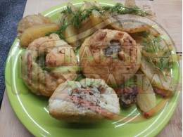 Картофите с мини кюфтенцата ги пека заедно с кошничките. Кошничките ги поднасям с гарнитура от картофи с мини кюфтенца. За украса може да сложите копър или магданоз. Преди напълно да се запекат картофите, заедно с маслото може да сложите нарязан на дребно магданоз и копър с чесън.