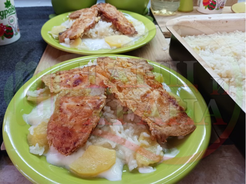 ПРОДУКТИ: Приблизителни количества за ориз с картофи с панирано филе "Филежареново яйченопане" приготвен на фурна с кромид лук гарниран върху млечна основа с кисело мляко от България с панирано жарено филе с яйца и брашно и поднесен с червенопиперкови крутони (производен)