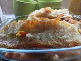 Солена баница "Морковена с БГсирене и яйца" изпечена на фурна с плънка от моркови, кромид лук, краве бяло сирене и яйца оформена без точене по метода на сгъването