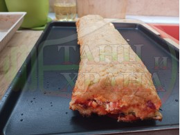 Сипете слънчогледовото олио във форма за печене на рула и намазнете формата. С част от хлебното тесто покрийте дъното на формата. Сипете плънката и я загладете. Покрийте плънката с втората част от тестото. Имайте предвид, че хлебните теста не се разточват лесно и за покриването на плънката може да се наложи да "слепите и споите" тестото чрез малки парченца тесто подобно на мозайка. Поставете тавата във фурната. Запечете на фурна без вентилатор на 180 градуса за около 45 минути.