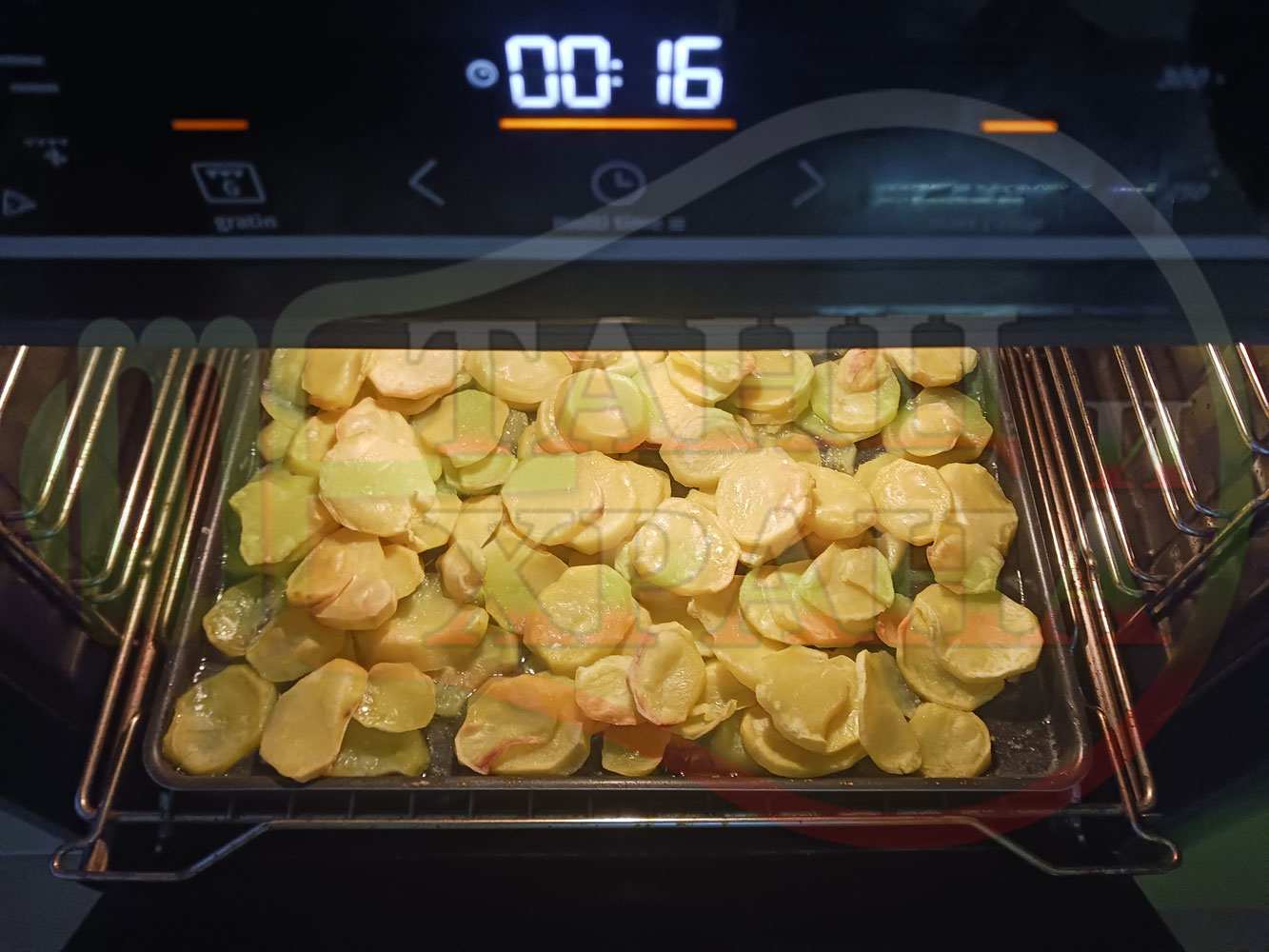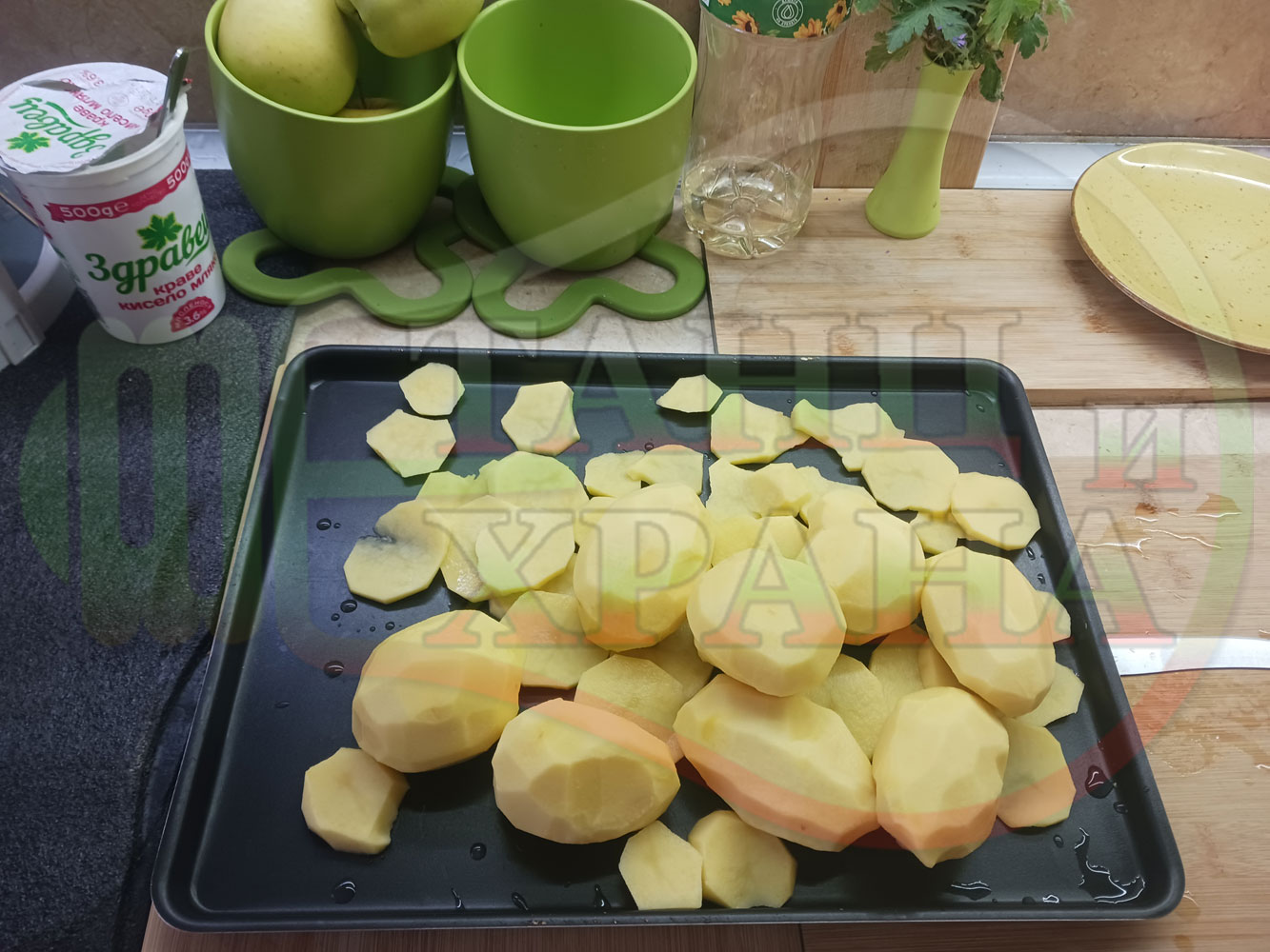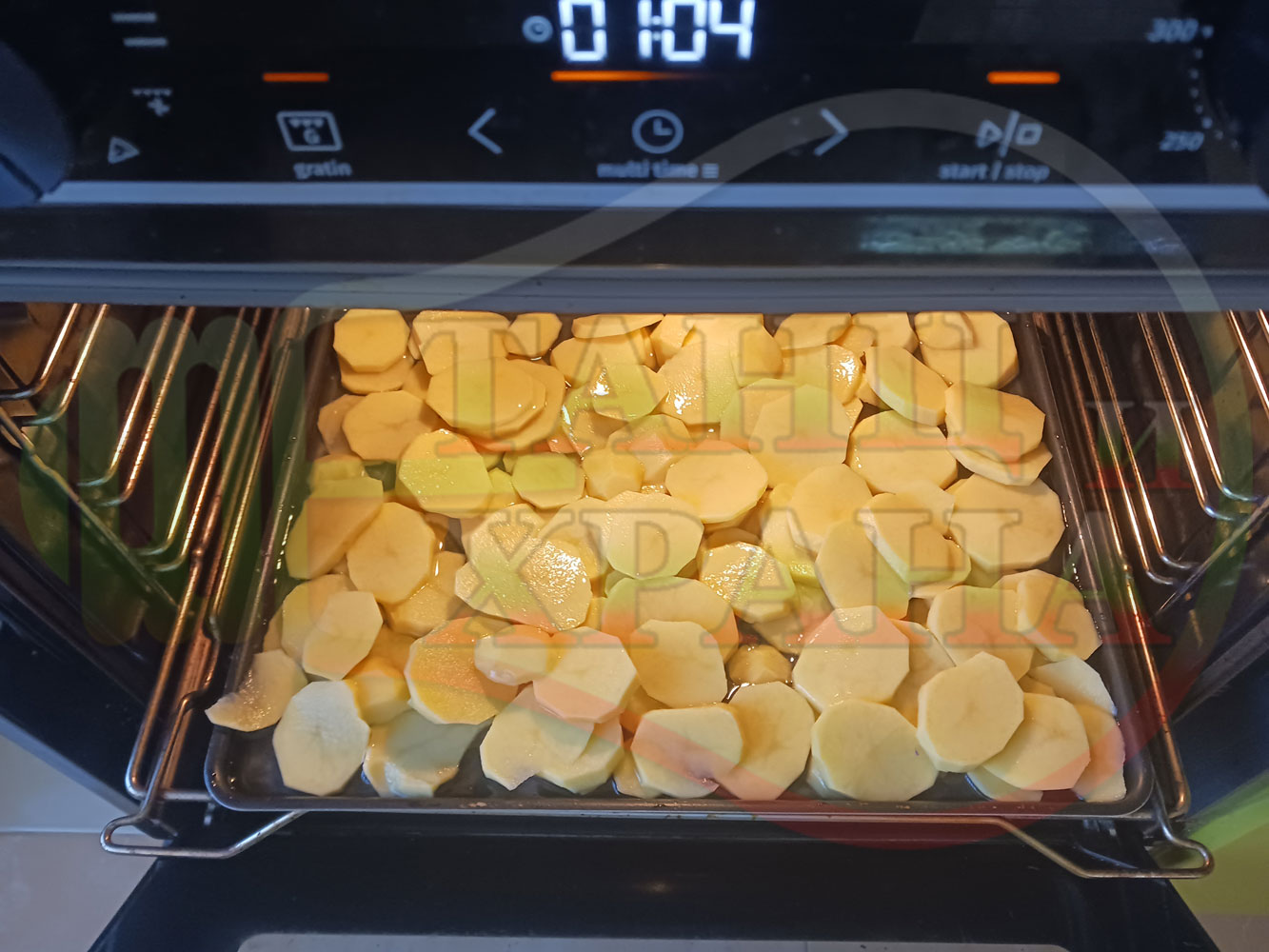 Измийте, обелете, нарежете картофите на кръгчета и ги поставете в тава за печене. Добавете солта, слънчогледовото олио и налейте топла към гореща вода от чешмата. Разбъркайте и поставете тавата в предварително загрятата фурна (загрейте я за поне 5 минути). Сварете и леко запечете на фурна без вентилатор на 180 градуса за около 60 минути.