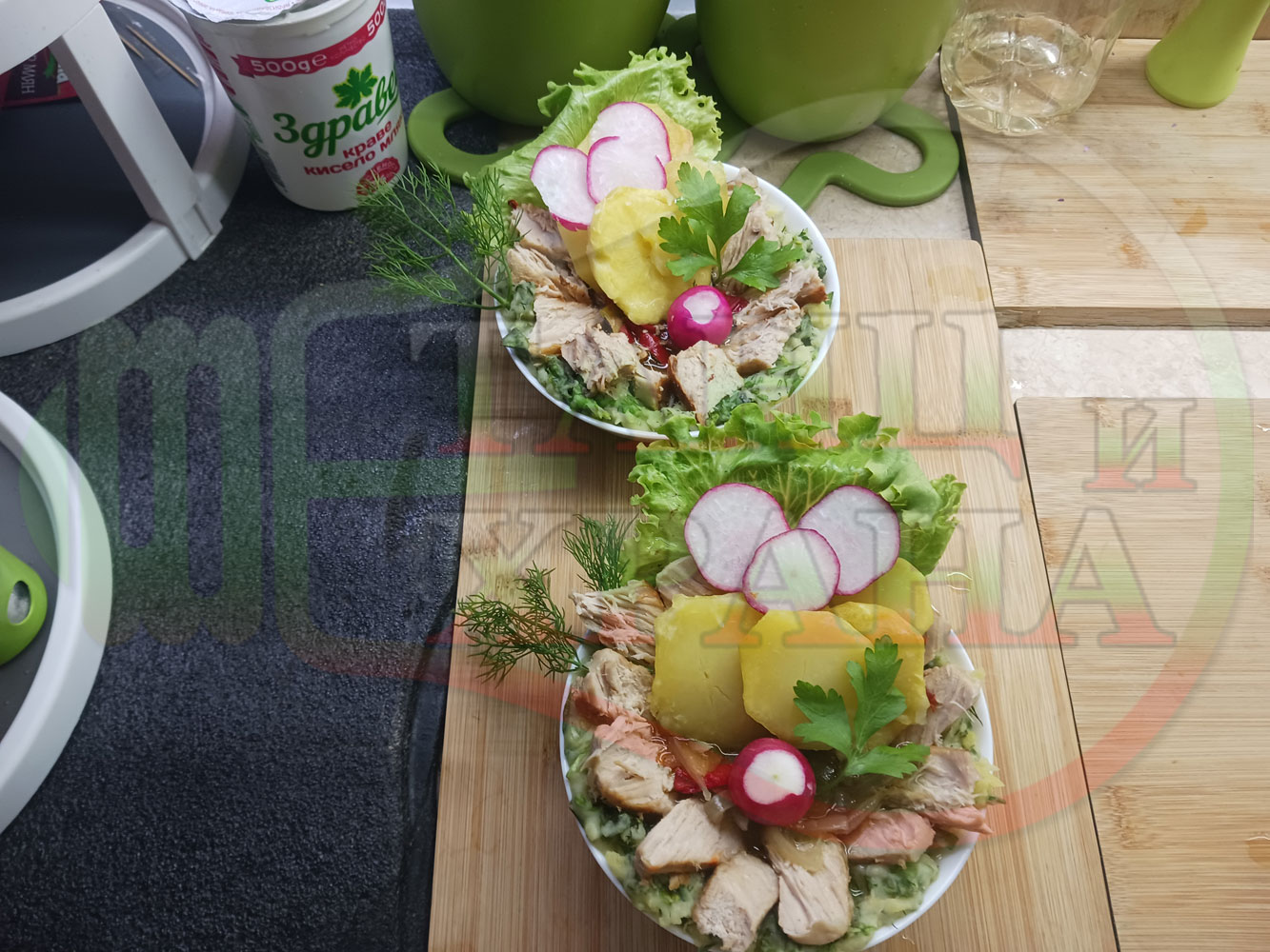 Поставете по 1 марулено листо в средно големи купи, разпределете картофеното марулено пюре и оформете "кладенчета". Нарежете 2 от пържолите на продълговати парчета и ги подредете по диаметъра на кладенчетата. Сипете част от сварените зелени и червени чушки с водния лук, чесън и масло заедно с част от соса в средата на кладенчетата. Гарнирайте и украсете с цели картофени кръгчета, нарязани и ненарязани малки репи и със стръкчета от пресния копър (украсете по ваше желание и усмотрение).