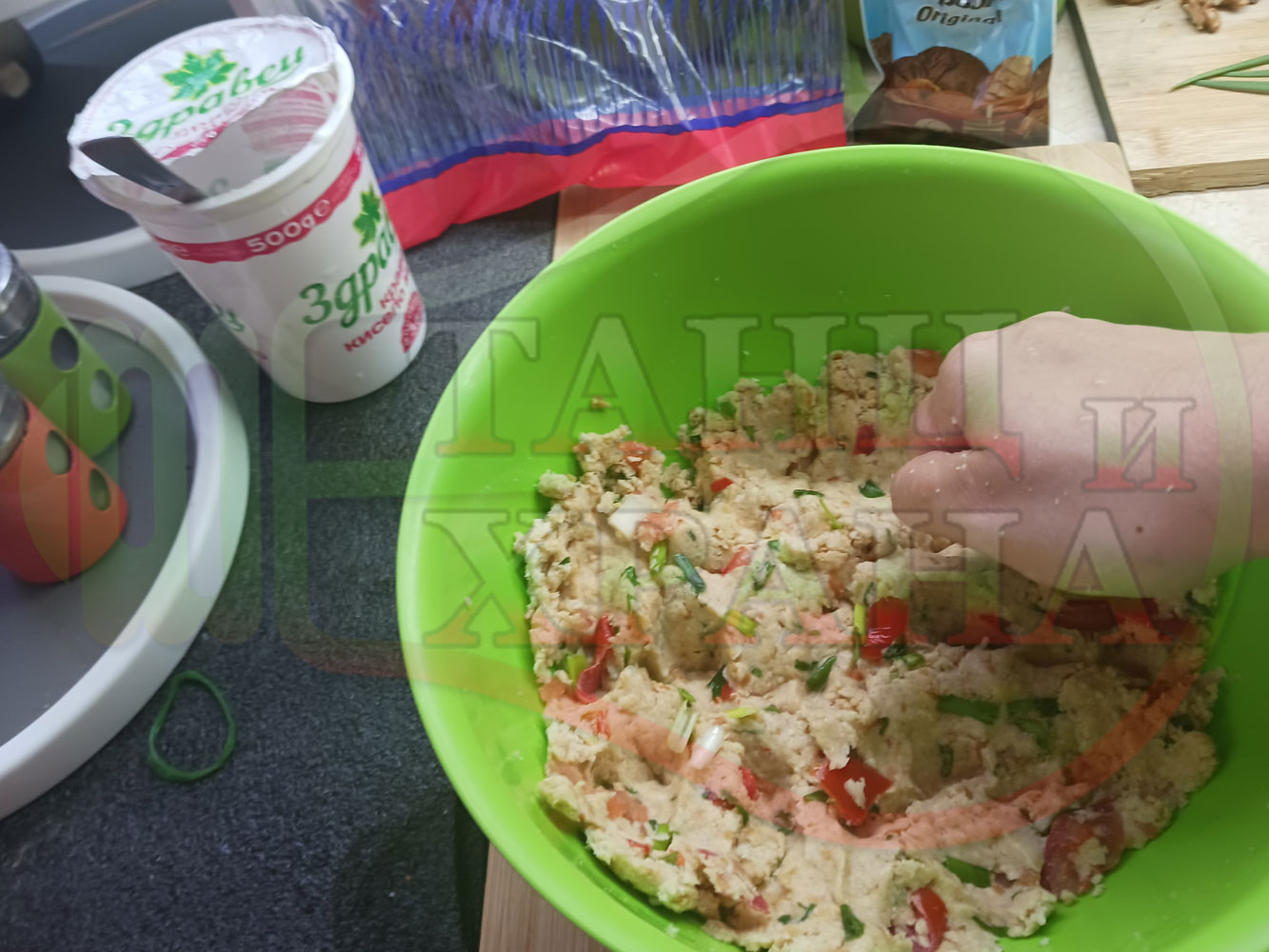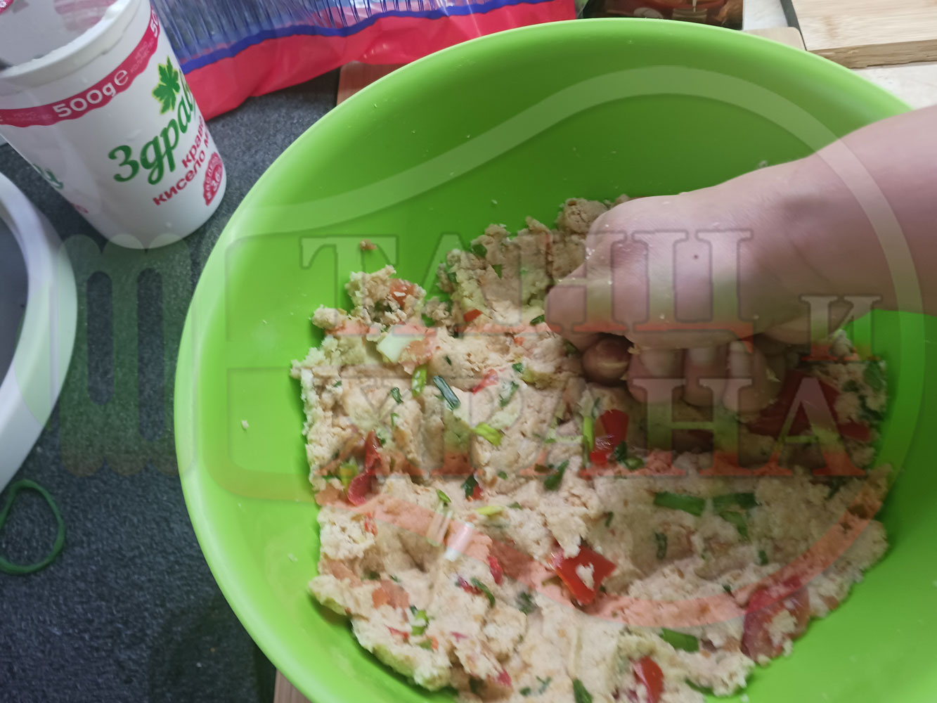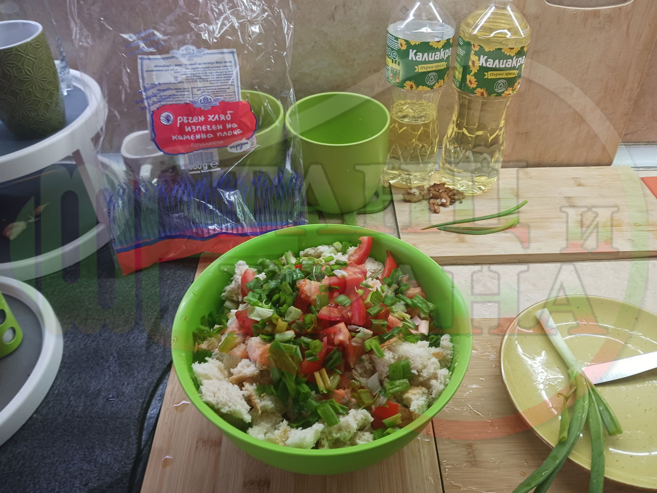 Надробете хляба в купа и добавете измитите и нарязани на едро домат и пресен лук. Разбъркайте и намачкайте с ръка всички продукти и добавете киселото мляко. Сипете содата за хляб в киселото мляко и я разбъркайте до шупване на млякото. Размесете продуктите и добавете слънчогледовото олио. Отново размесете до получаване на сравнително гъсто хлебно, хомогенизирано тесто.