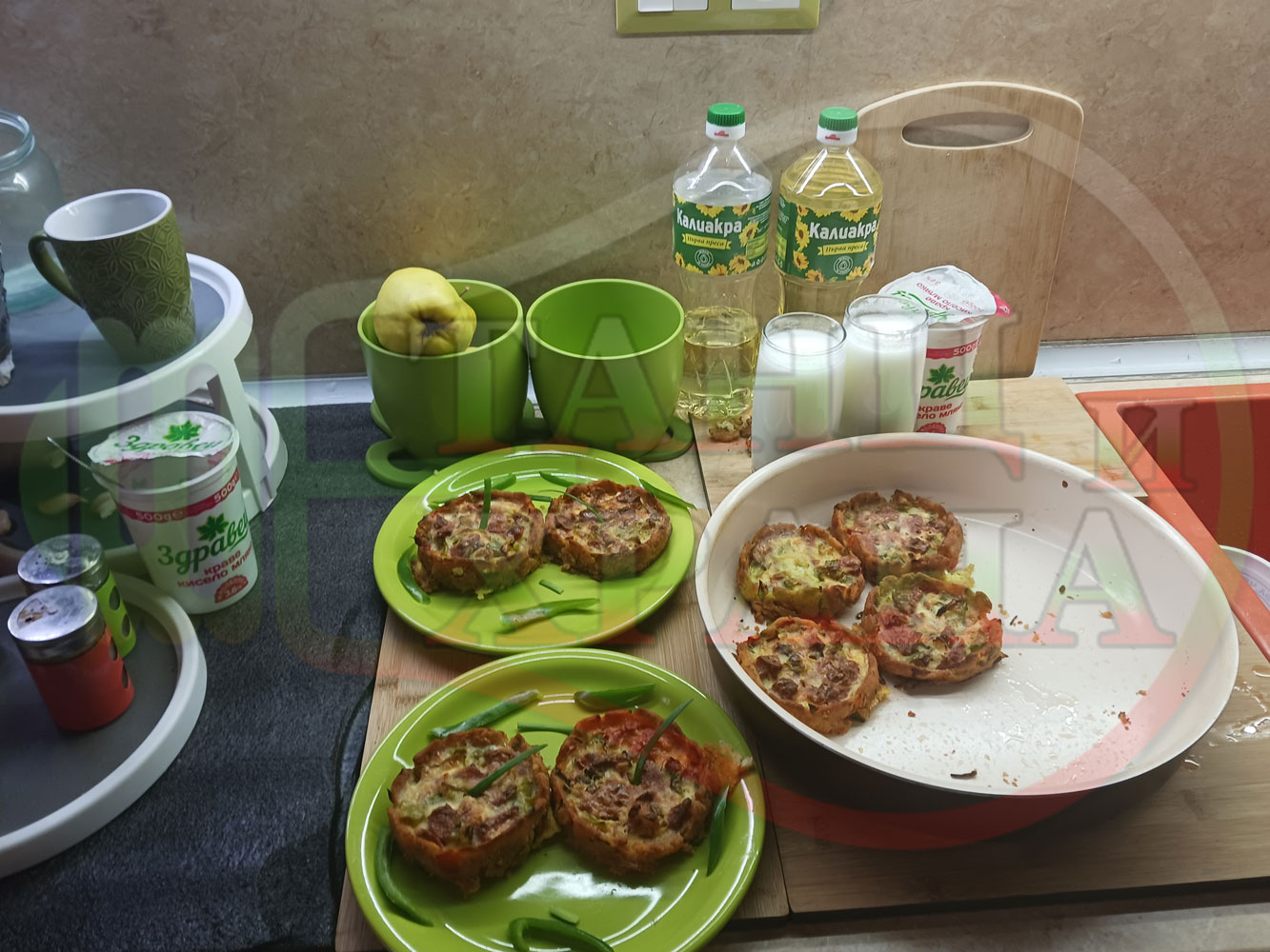 Хлебни солени кошнички "Саламовочушкови с БГсирене" запечени на фурна с плънка от яйца, зелени пресни чушки, пикантен салам и краве бяло сирене омесени от хляб, пресни домати, пресен лук и кисело мляко от България
