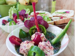 Българска сурова студена супа "Марулена пряснолучена зеленочайна морковена с БГсирене" приготвена от свежа маруля, пресен лук и зелен чай гарнирана с топчета от сиренов крем с моркови и краве бяло сирене (българско, саламурено) - двукомпонентна