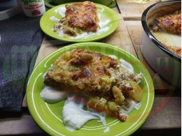 Българска мусака "Дюленокаймяна с кисело" приготвена на фурна с кайма от свинско и телешко, пресни дюли, кромид лук и картофи с яйчено млечна заливка от яйца и кисело мляко от България запечена с кашкавал
