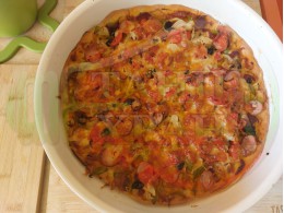 Плоска солена торта "Луканкова с кренвирши" със зелени пресни чушки, домати, луканков колбас, кренвирши, лютеница, кромид лук, маслини и кашкавал