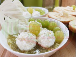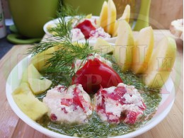 Божествена, просто божествена студена, сурова, сладко-солена ябълкова зелева млечна супа, приготвена с изключително малко продукти. Сътворих най-божествените сурови, авторски супи с изцяло български продукти като българското краве бяло сирене и българското кисело мляко. Гарнирах супата със сиренови топки приготвени от сиреново ябълков крем с пресни ябълки и българско краве бяло, саламурено сирене. Напълних сиреновите топки с по 1 супена лъжица трапезна майонеза и гарнирах с луканка (един от най-обичаните български продукти). Зелето внася едва доловима пикантна доза с характерната за прясното зеле лютивина, балансирайки сладостта на ябълките в идеална хармония със саламурата от сиренето. Майонезата омекотява и обогатява вкуса с животински протеини в превъзходен баланс със животинските протеини от луканката и млечните протеини от сиренето и млякото. Ммммм... божествена млечна супа, в допълнение с пикантната нотка от червения лют, едросмлян пипер... баланс, хармония, палитра от вкусове... просто божествена... вкусно, вкусна, вкусотия (вкуснотия)... ![]()