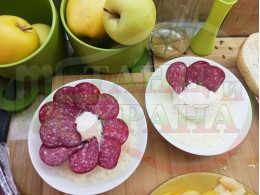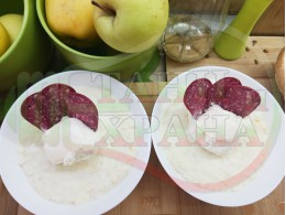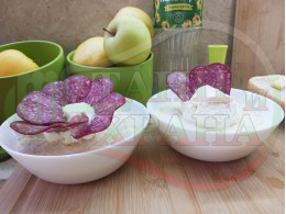 Българска студена сурова сладко солена супа "Ябълкова пряснозелева киселомлечна с БГсирене" приготвена с ябълки и прясно зеле гарнирана със сиренови топки от краве бяло сирене (българско, саламурено), майонеза и луканка - двукомпонентна