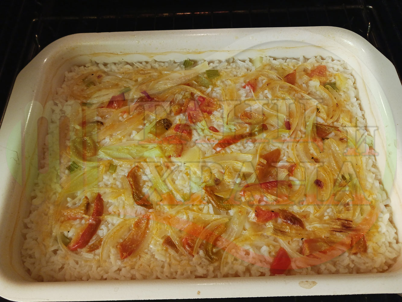 Измийте ориза и го добавете в тавата около 15 минути от началото на зададеното време. Налейте топла вода от чешмата в бурканчето от лютеница, затворете капачката и го разтръскайте за да се разтворят 2-те супени лъжици лютеница. Изсипете разтворената лютеница в тавата заедно с ориза. Досварете и дозапечете ориза до желаната от вас степен (по-сочен или по-запечен).