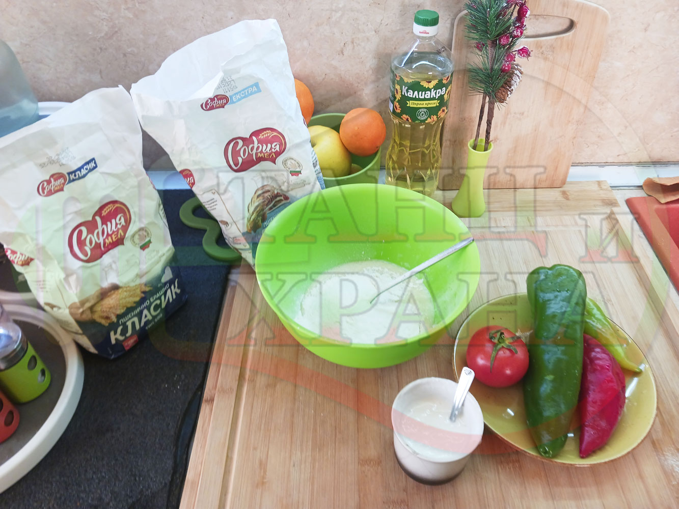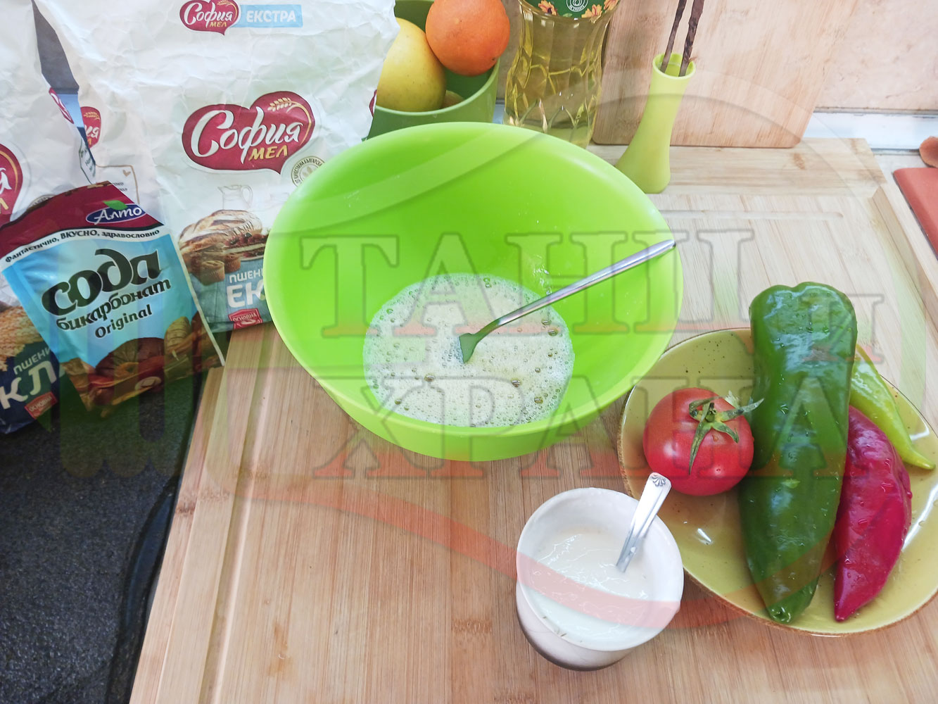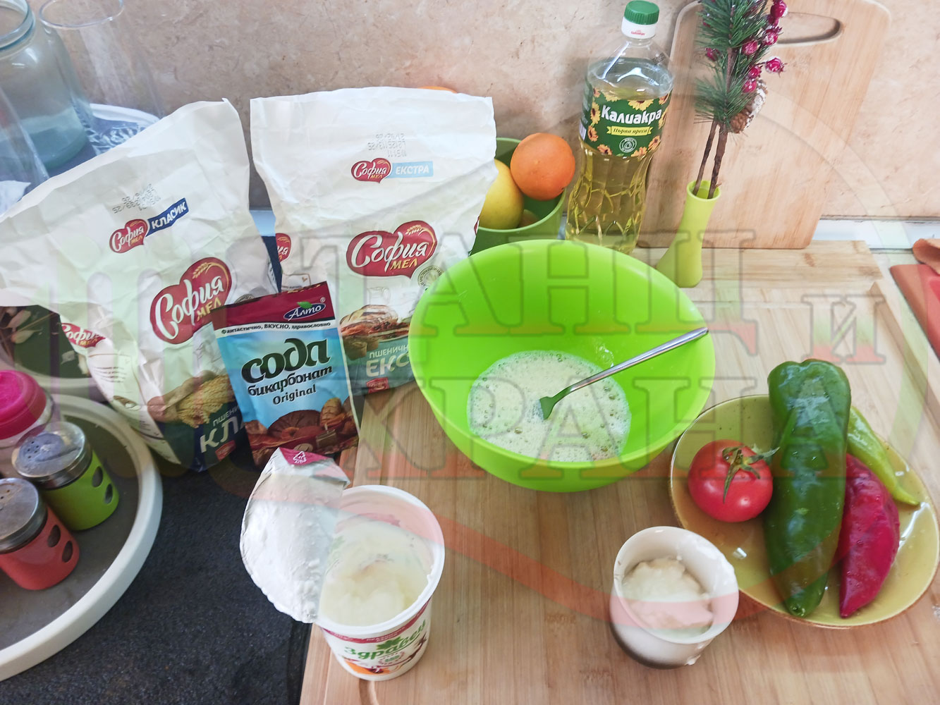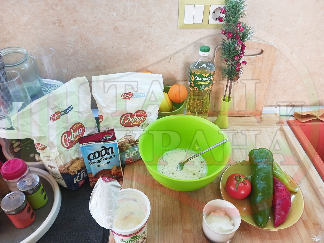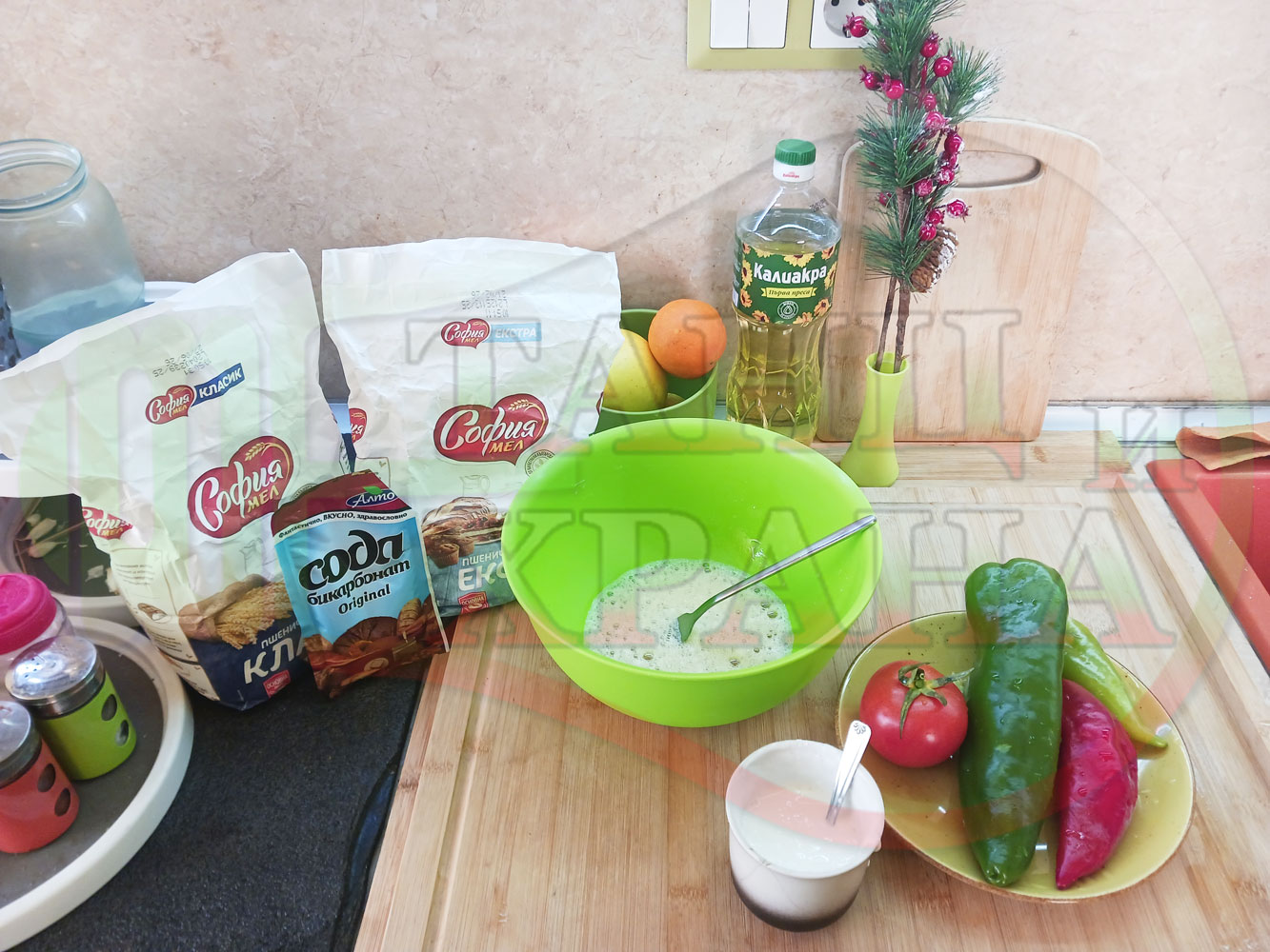 ПРОДУКТИ: Приблизителни количества за българска бухтена пита "Градинарскозеленчукова зеленочервеночушкова киселомлечносодена" изпечена на фурна с червени и зелени пресни чушки и домати омесена с яйца, сода за хляб и кисело мляко от България