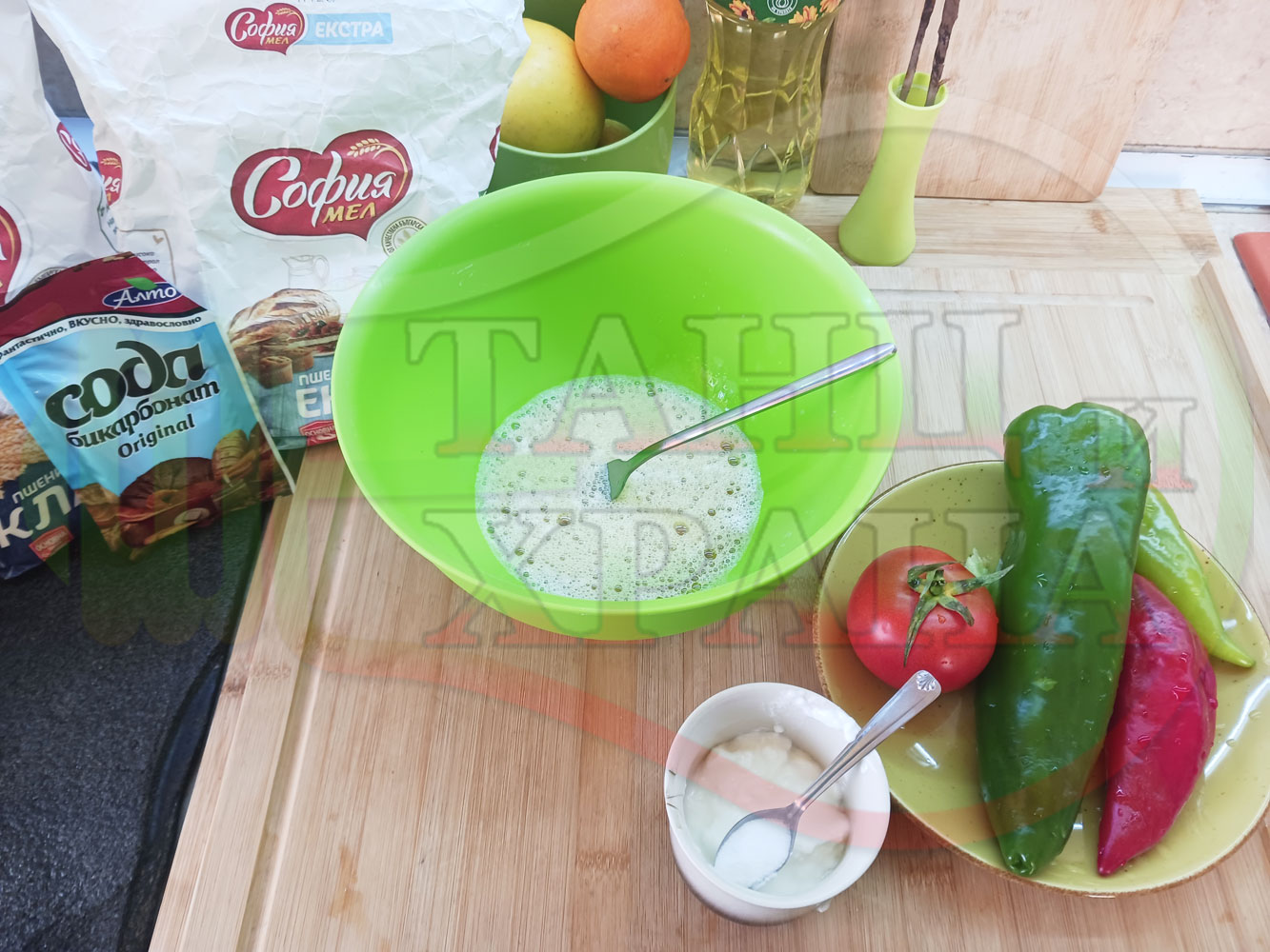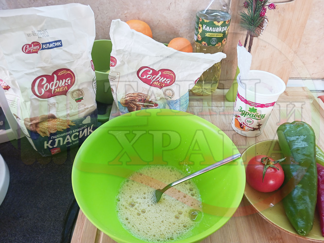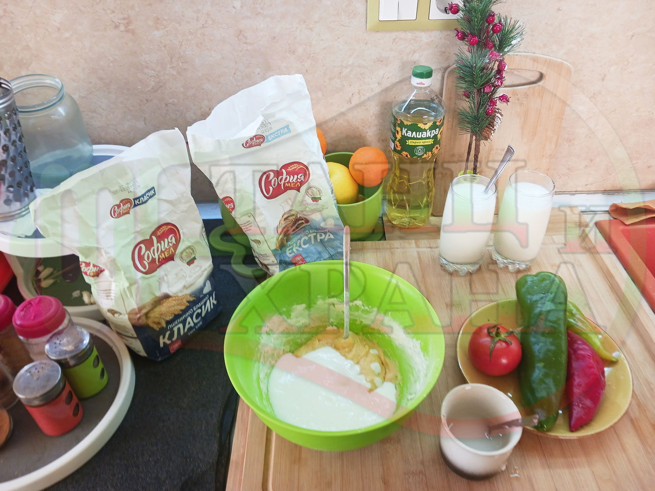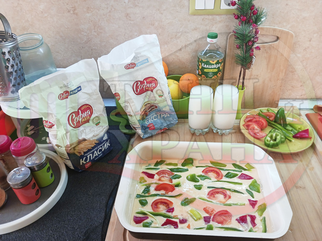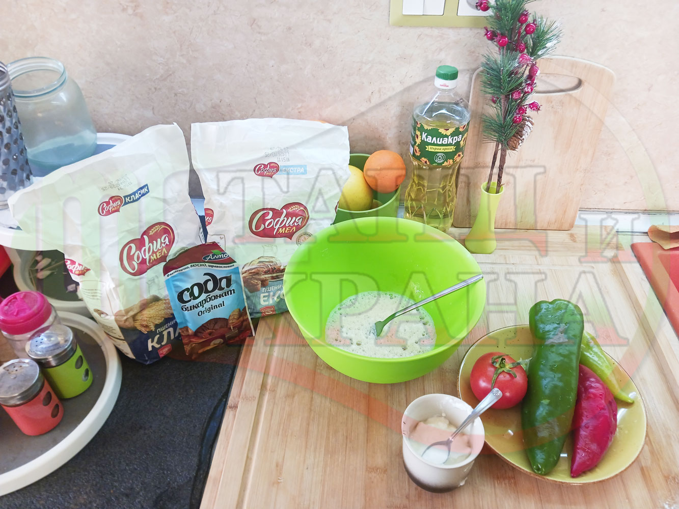 ПРОДУКТИ: Приблизителни количества за българска бухтена пита "Градинарскозеленчукова зеленочервеночушкова киселомлечносодена" изпечена на фурна с червени и зелени пресни чушки и домати омесена с яйца, сода за хляб и кисело мляко от България