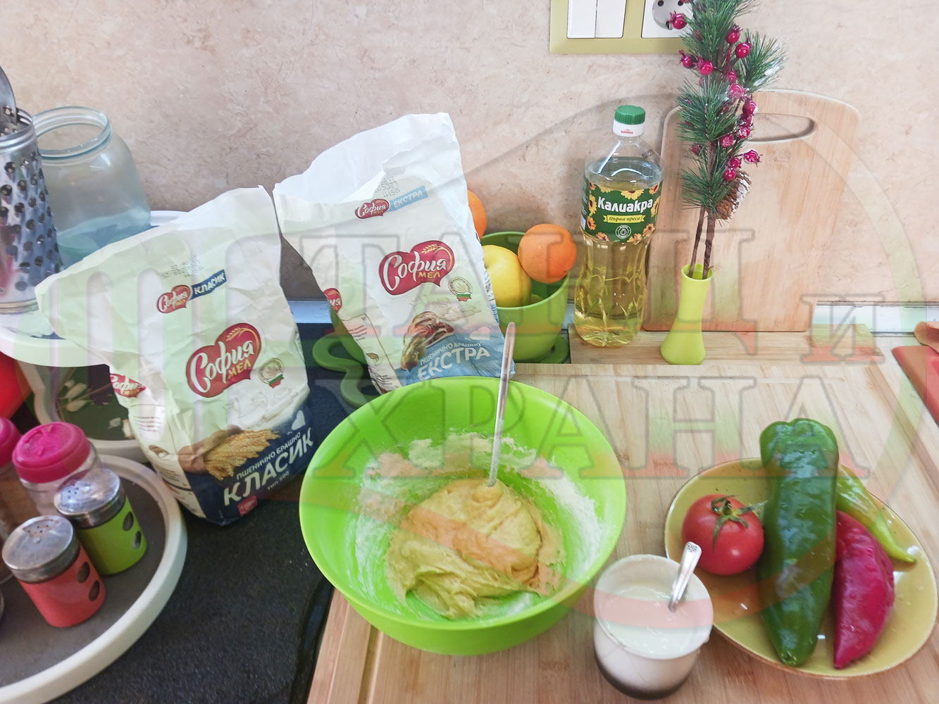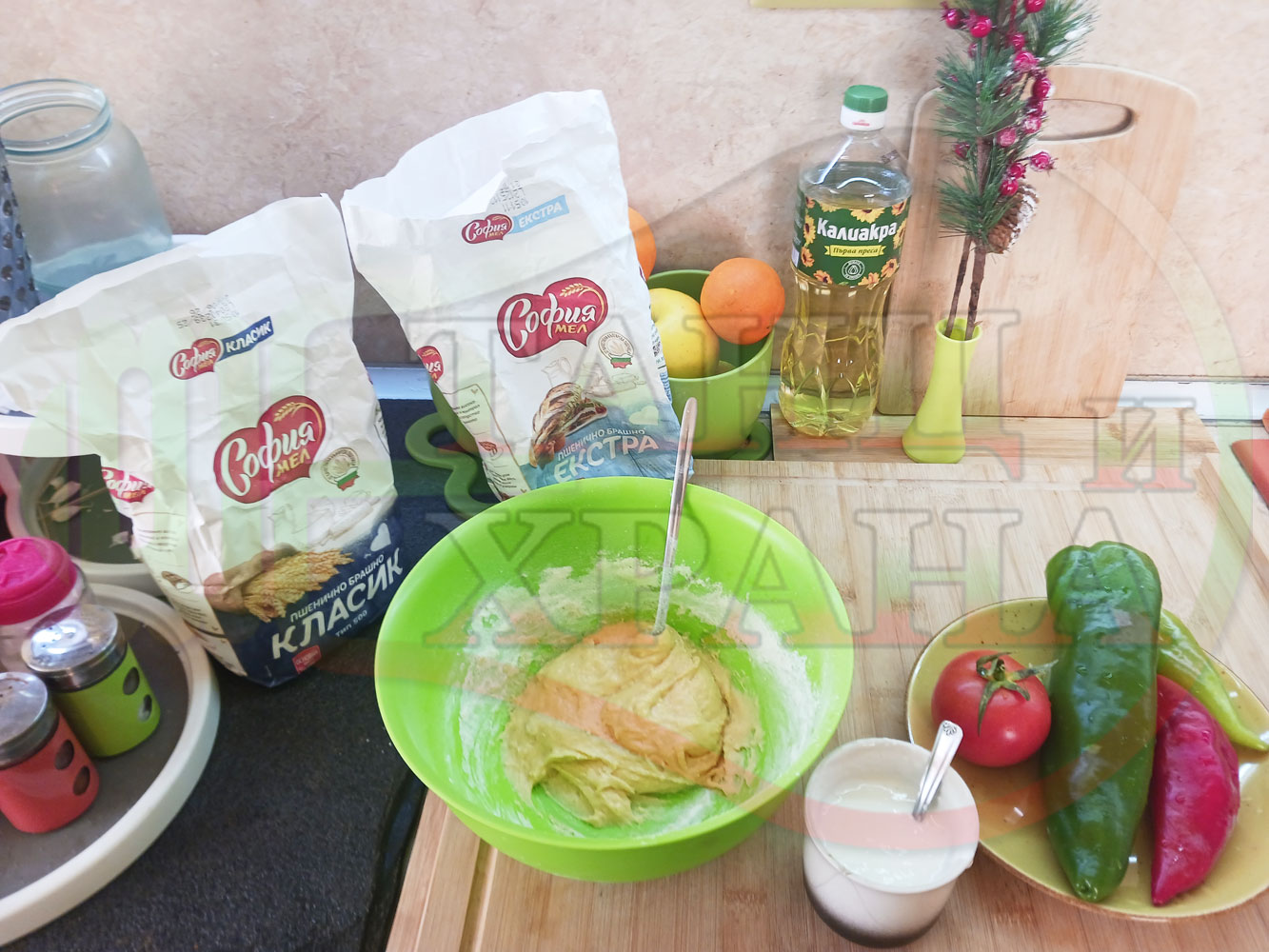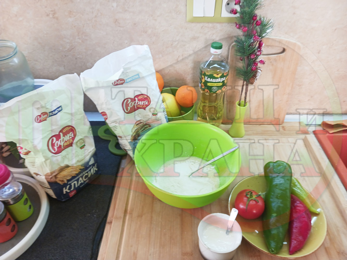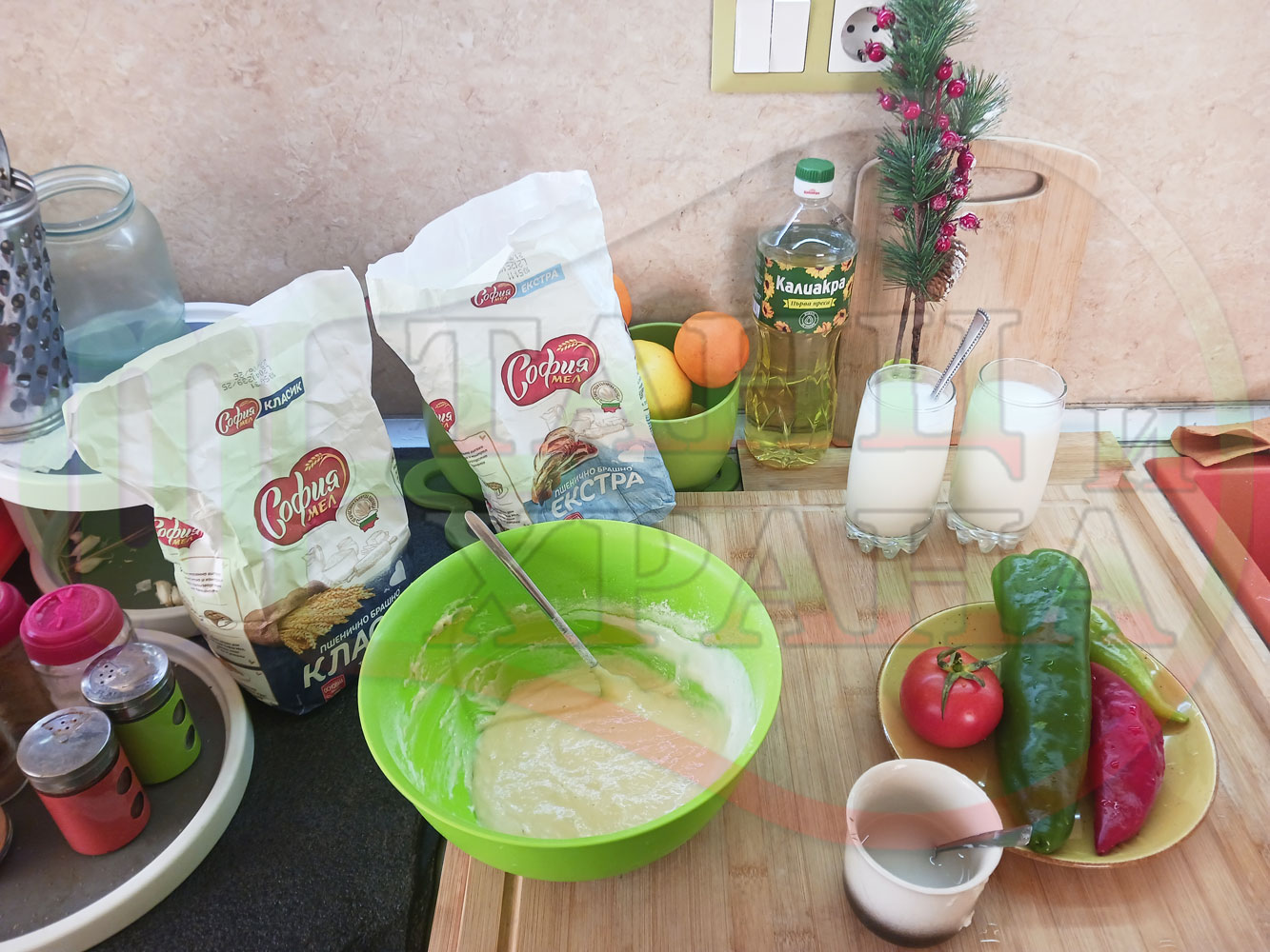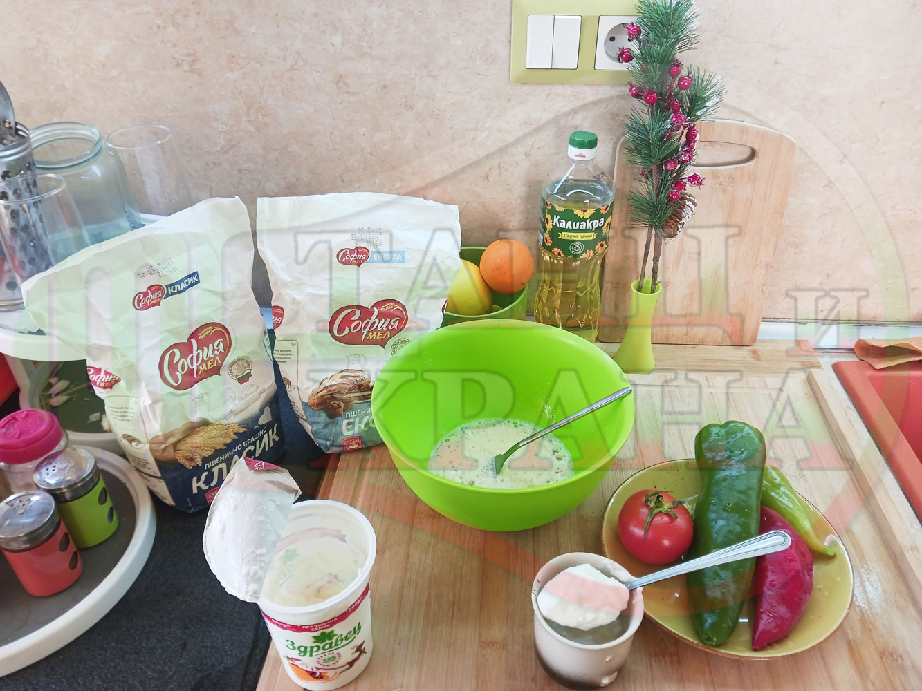 ПРОДУКТИ: Приблизителни количества за българска бухтена пита "Градинарскозеленчукова зеленочервеночушкова киселомлечносодена" изпечена на фурна с червени и зелени пресни чушки и домати омесена с яйца, сода за хляб и кисело мляко от България