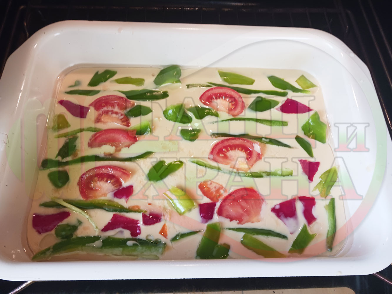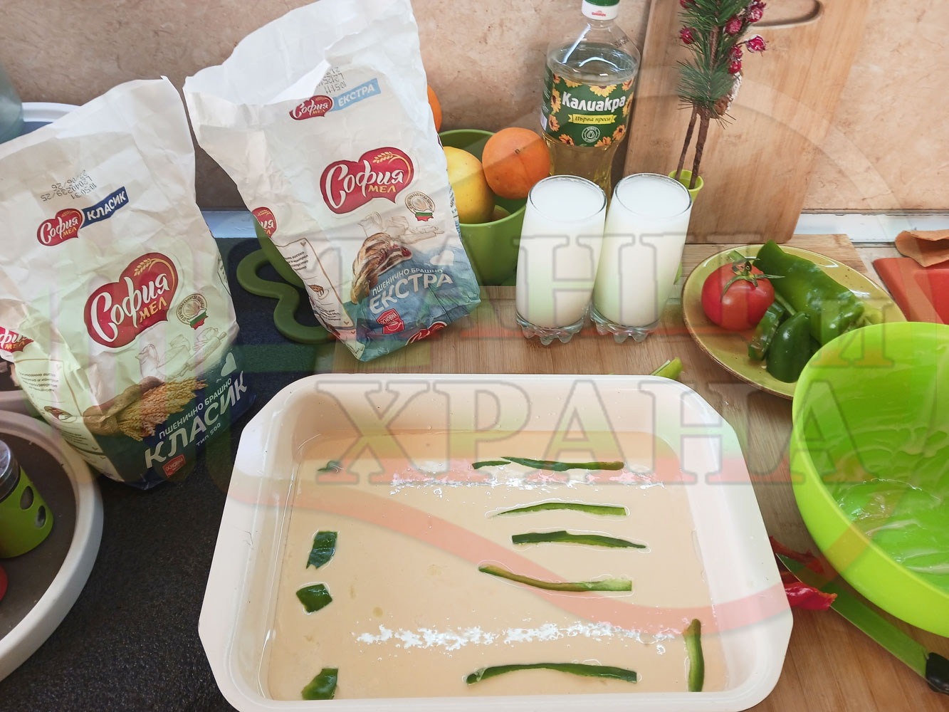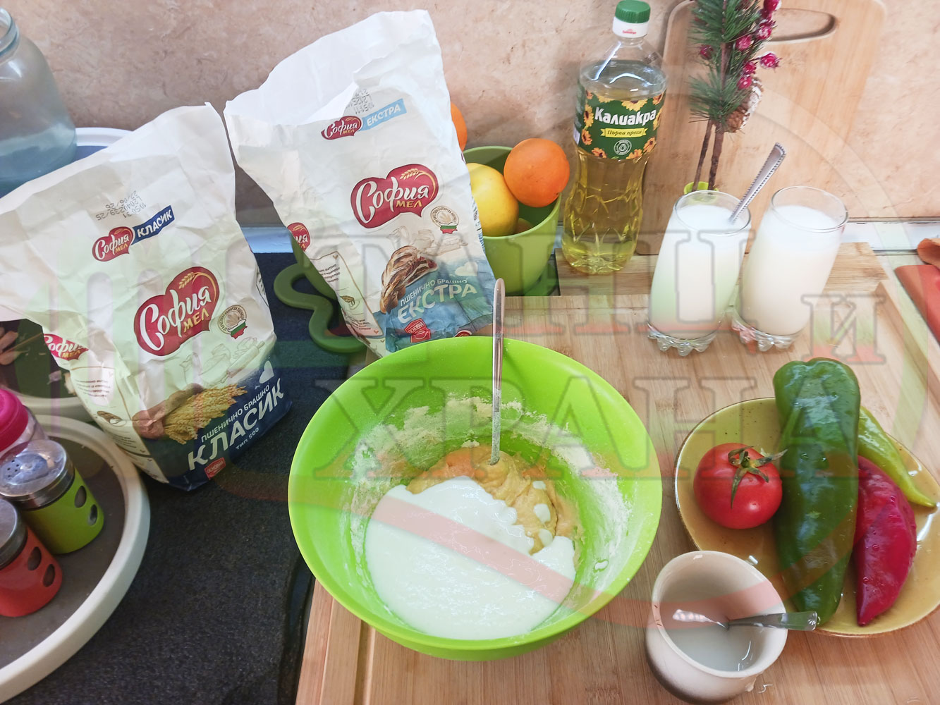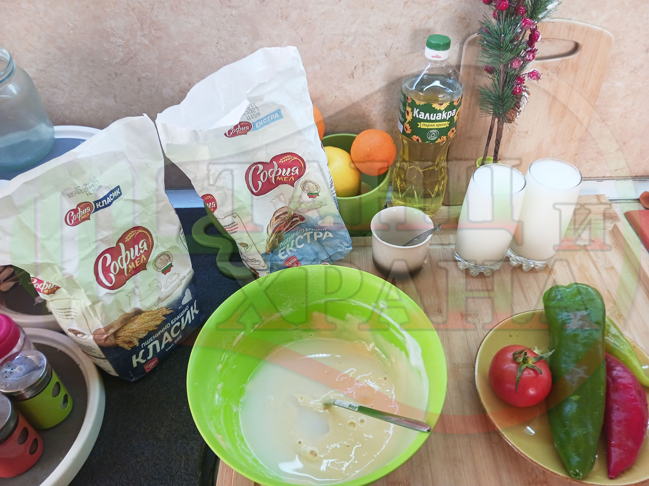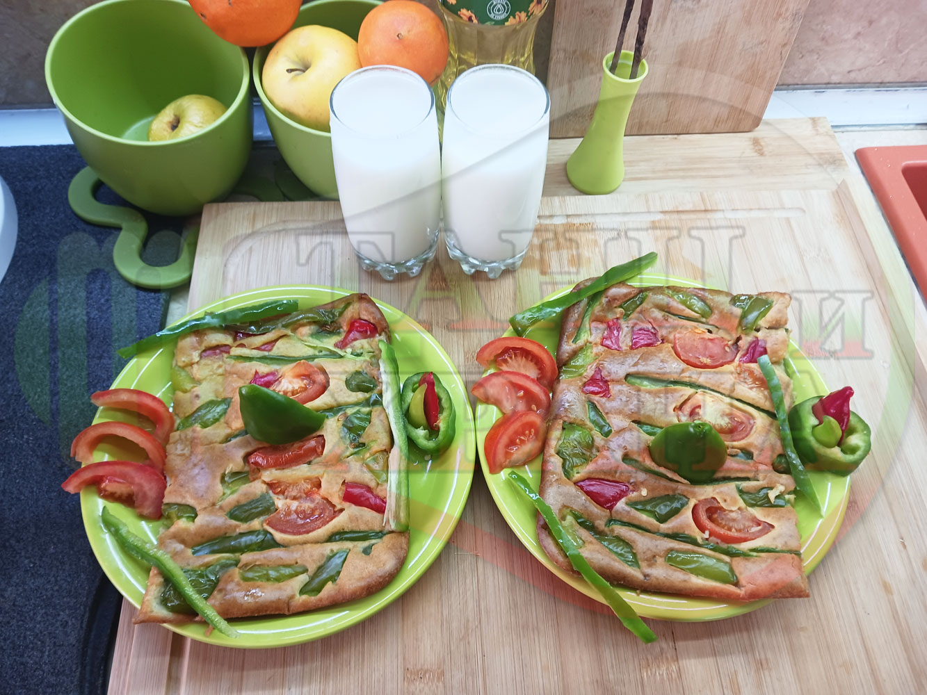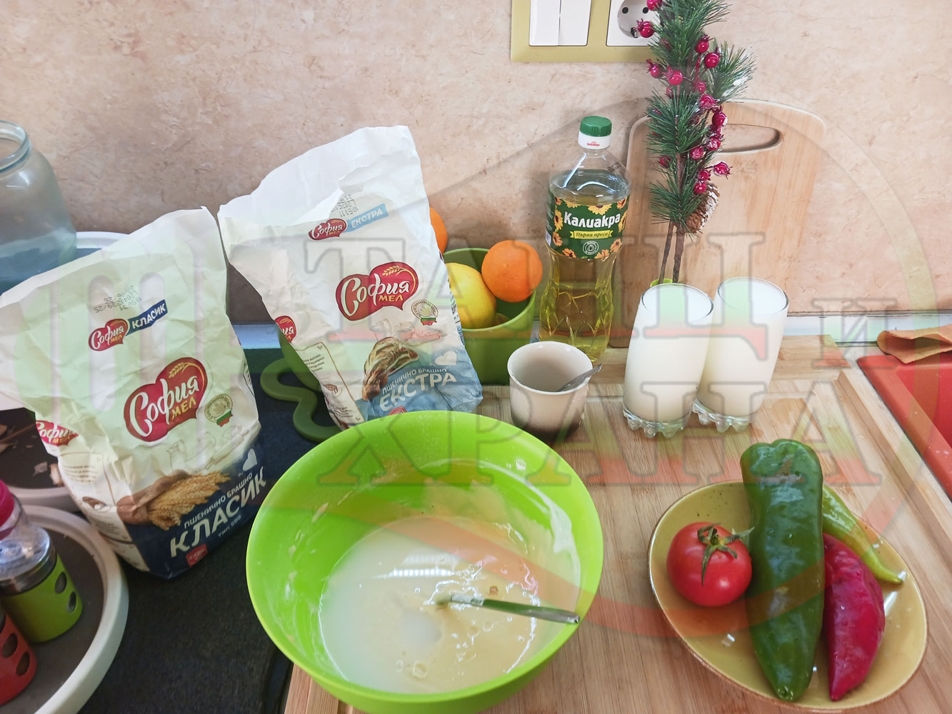 ПРОДУКТИ: Приблизителни количества за българска бухтена пита "Градинарскозеленчукова зеленочервеночушкова киселомлечносодена" изпечена на фурна с червени и зелени пресни чушки и домати омесена с яйца, сода за хляб и кисело мляко от България