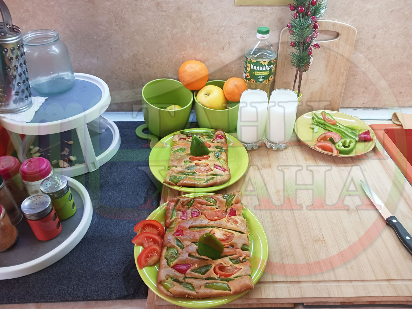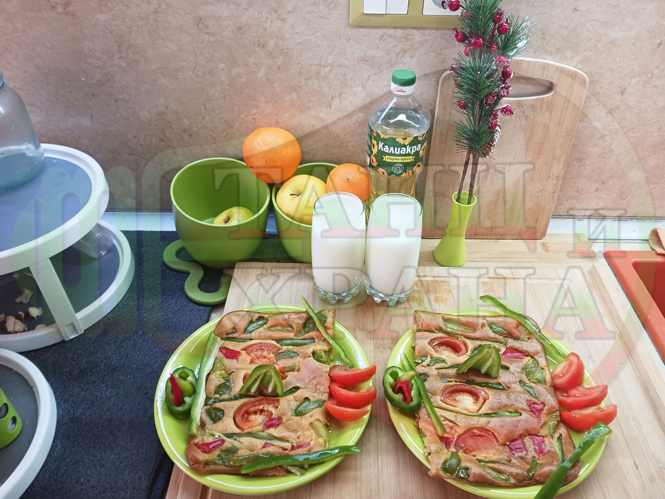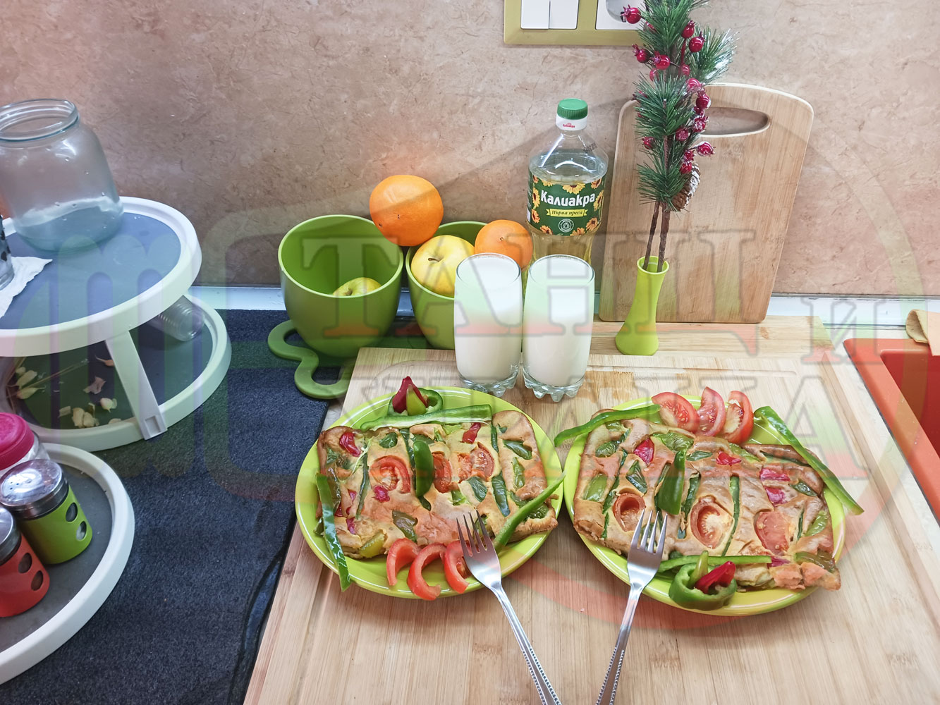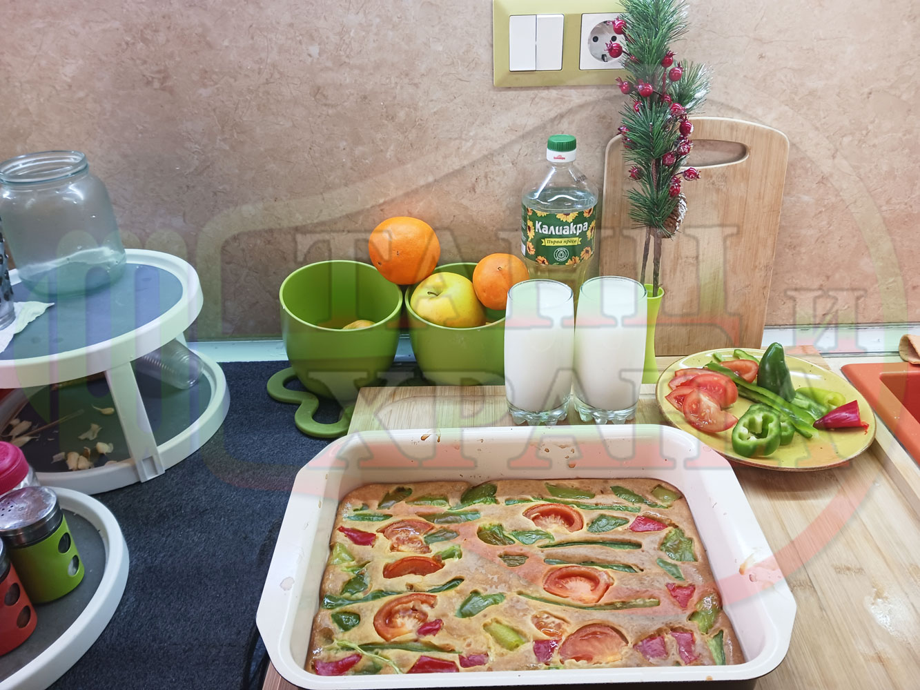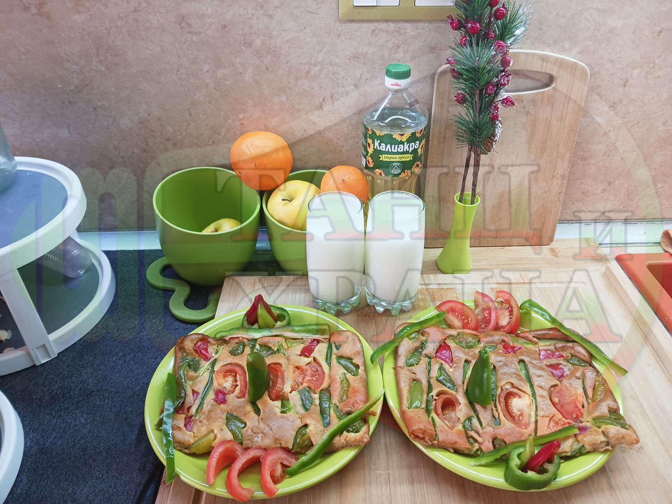 ПРОДУКТИ: Приблизителни количества за българска бухтена пита "Градинарскозеленчукова зеленочервеночушкова киселомлечносодена" изпечена на фурна с червени и зелени пресни чушки и домати омесена с яйца, сода за хляб и кисело мляко от България