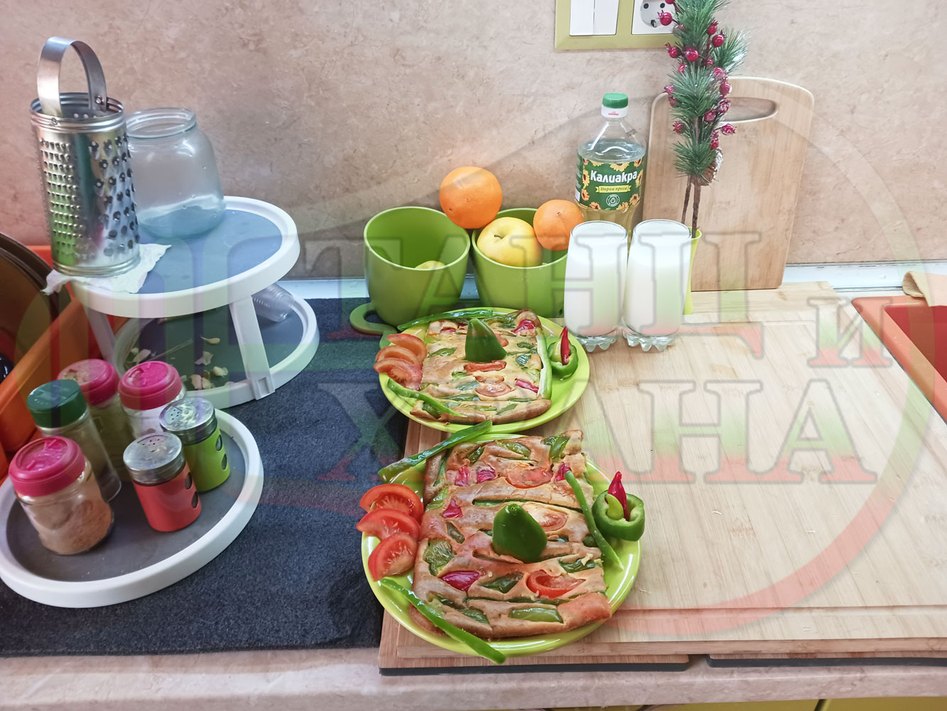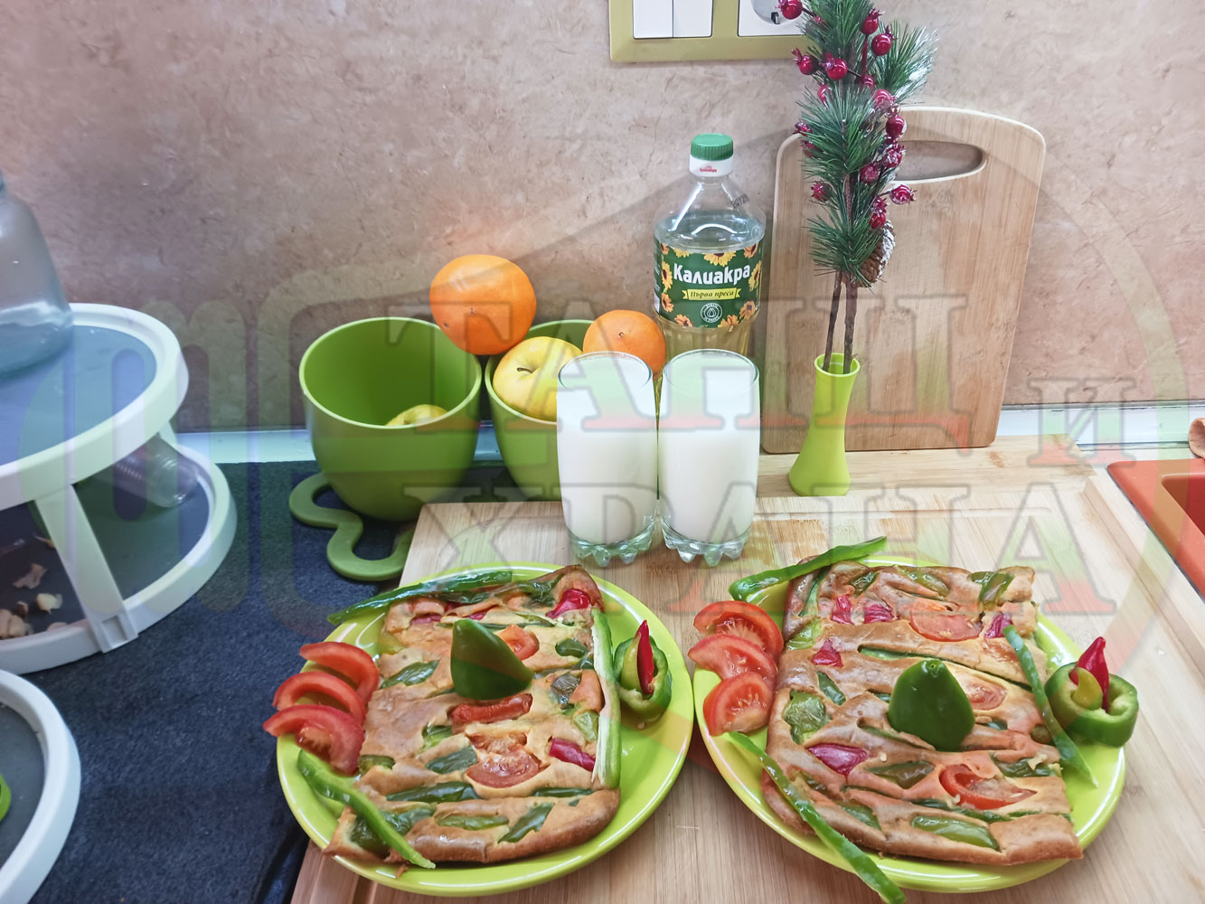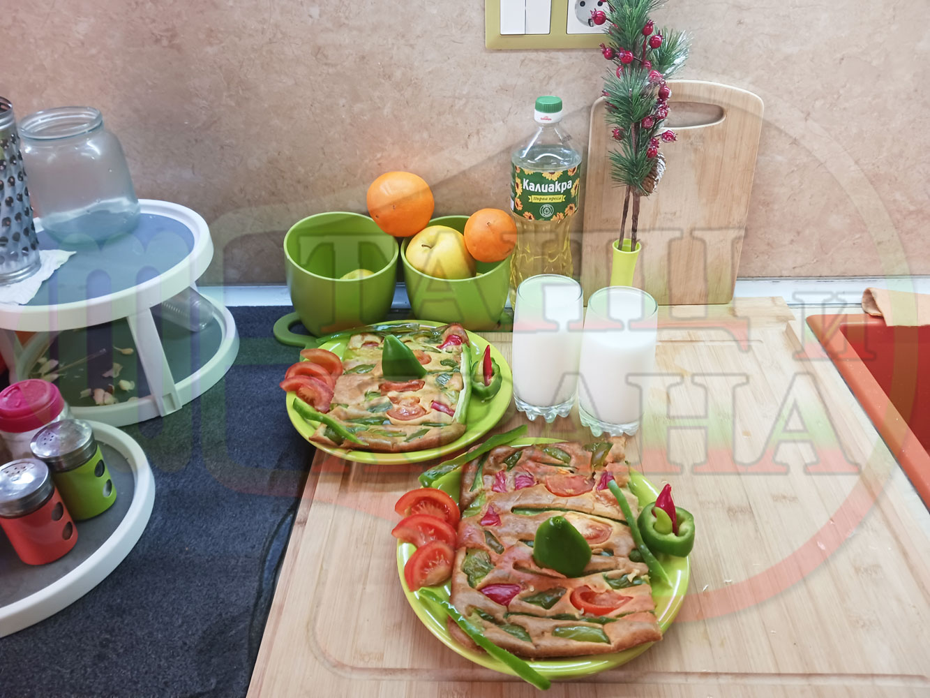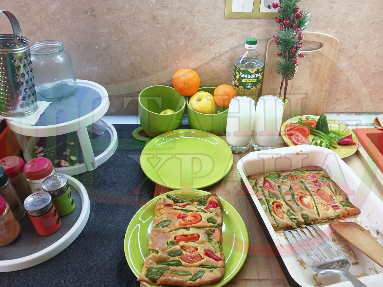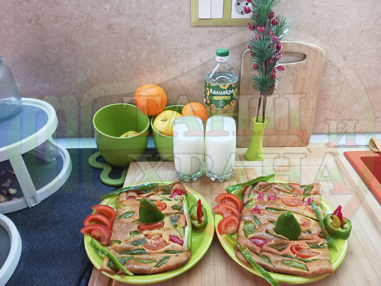ПРОДУКТИ: Приблизителни количества за българска бухтена пита "Градинарскозеленчукова зеленочервеночушкова киселомлечносодена" изпечена на фурна с червени и зелени пресни чушки и домати омесена с яйца, сода за хляб и кисело мляко от България
