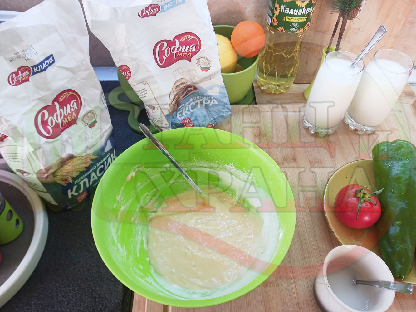 Разбийте яйцата в купа заедно със захарта и солта. Добавете брашното и разбъркайте (на този етап сместта е доста гъста). Сипете содата за хляб в киселото мляко и разбъркайте до пълното и разтваряне и "шупване" на млякото (прегасяване на содата). Изсипете българското кисело мляко с разтворената в него сода в купата и разбъркайте. Налейте хладка към топла вода от чешмата в чашата, кофичката от млякото или купата, в която сте прегасили содата и оберете от стените на чашата млякото, така че да "овкусите" водата. Изсипете овкусената, соденомлечна вода в купата и отново разбъркайте до образуване на сравнително рядка бухтена смес (с една степен по-рядка от палачинковата).