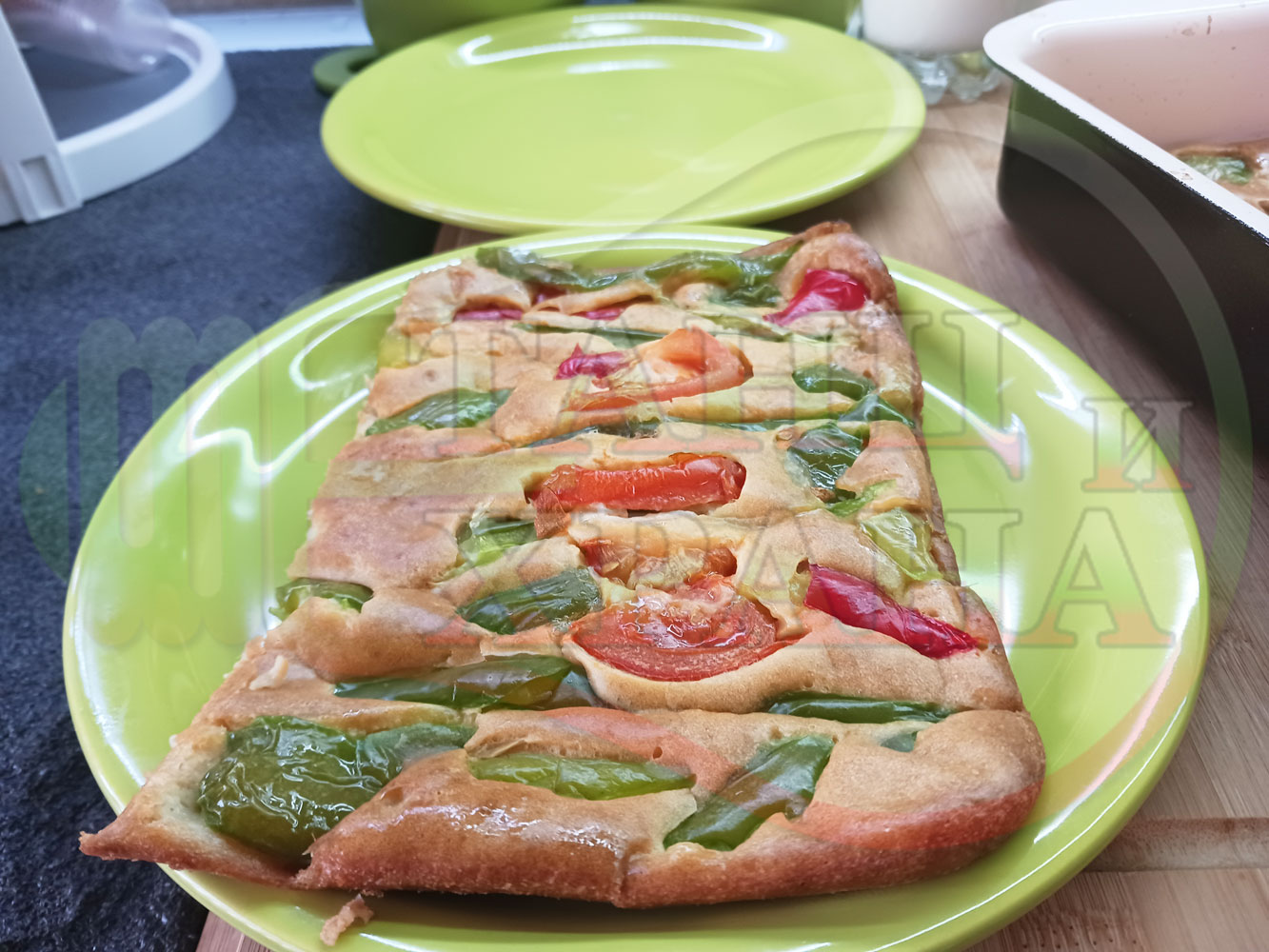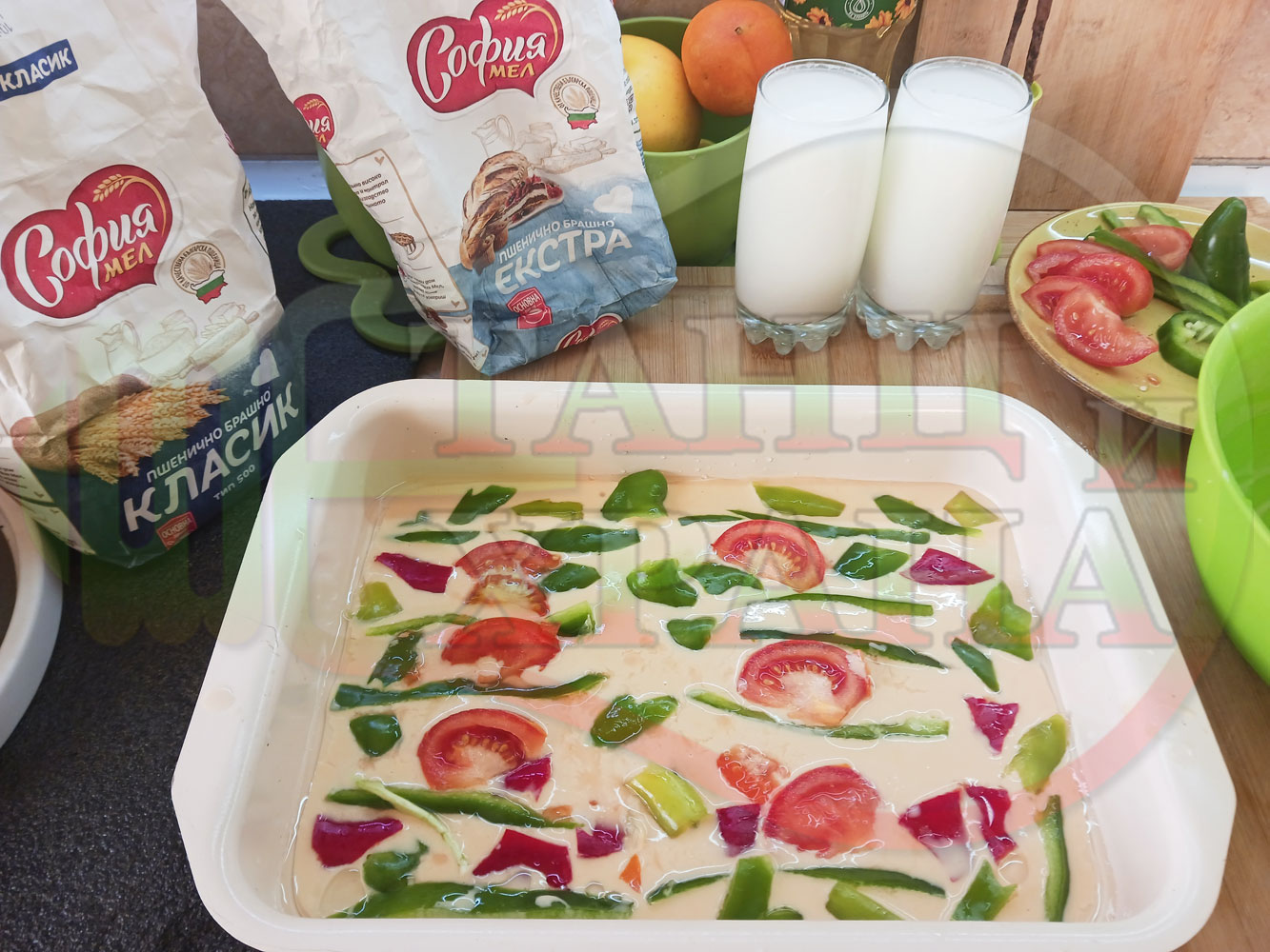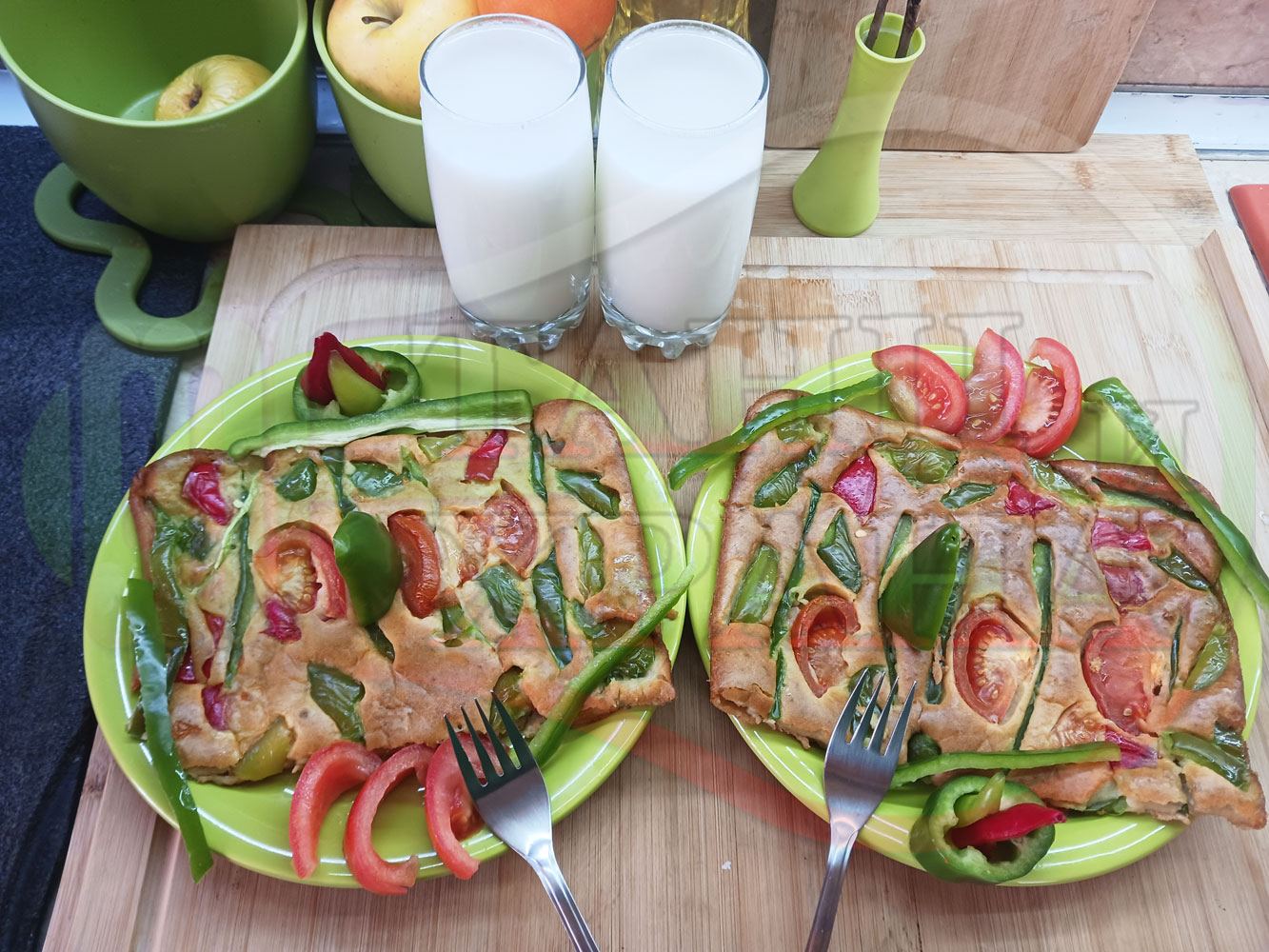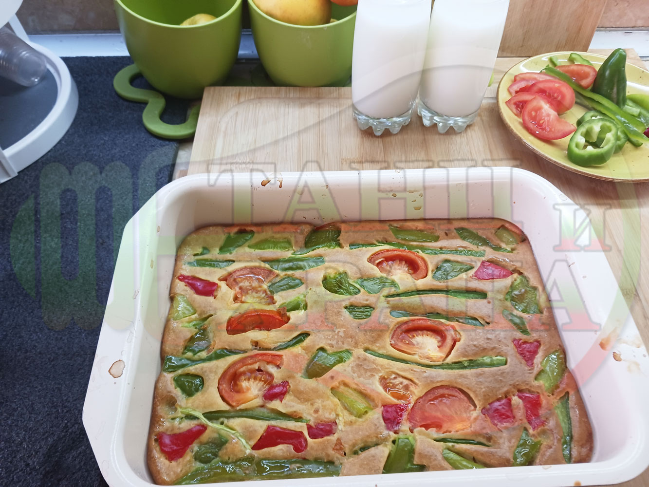 Българска бухтена пита "Градинарскозеленчукова зеленочервеночушкова киселомлечносодена" изпечена на фурна с червени и зелени пресни чушки и домати омесена с яйца, сода за хляб и кисело мляко от България