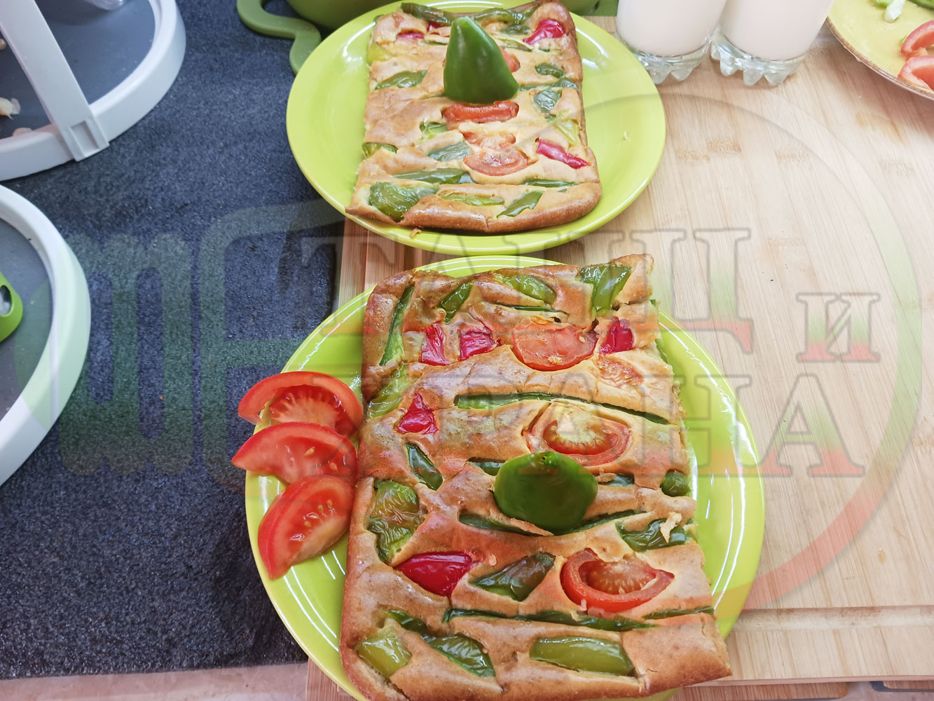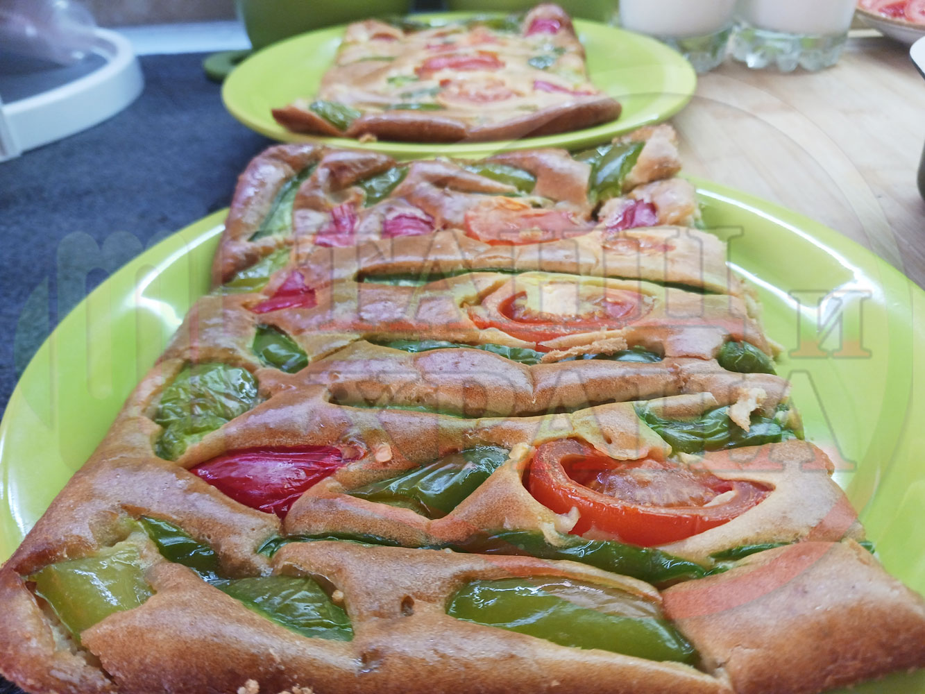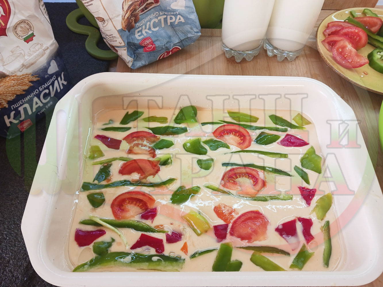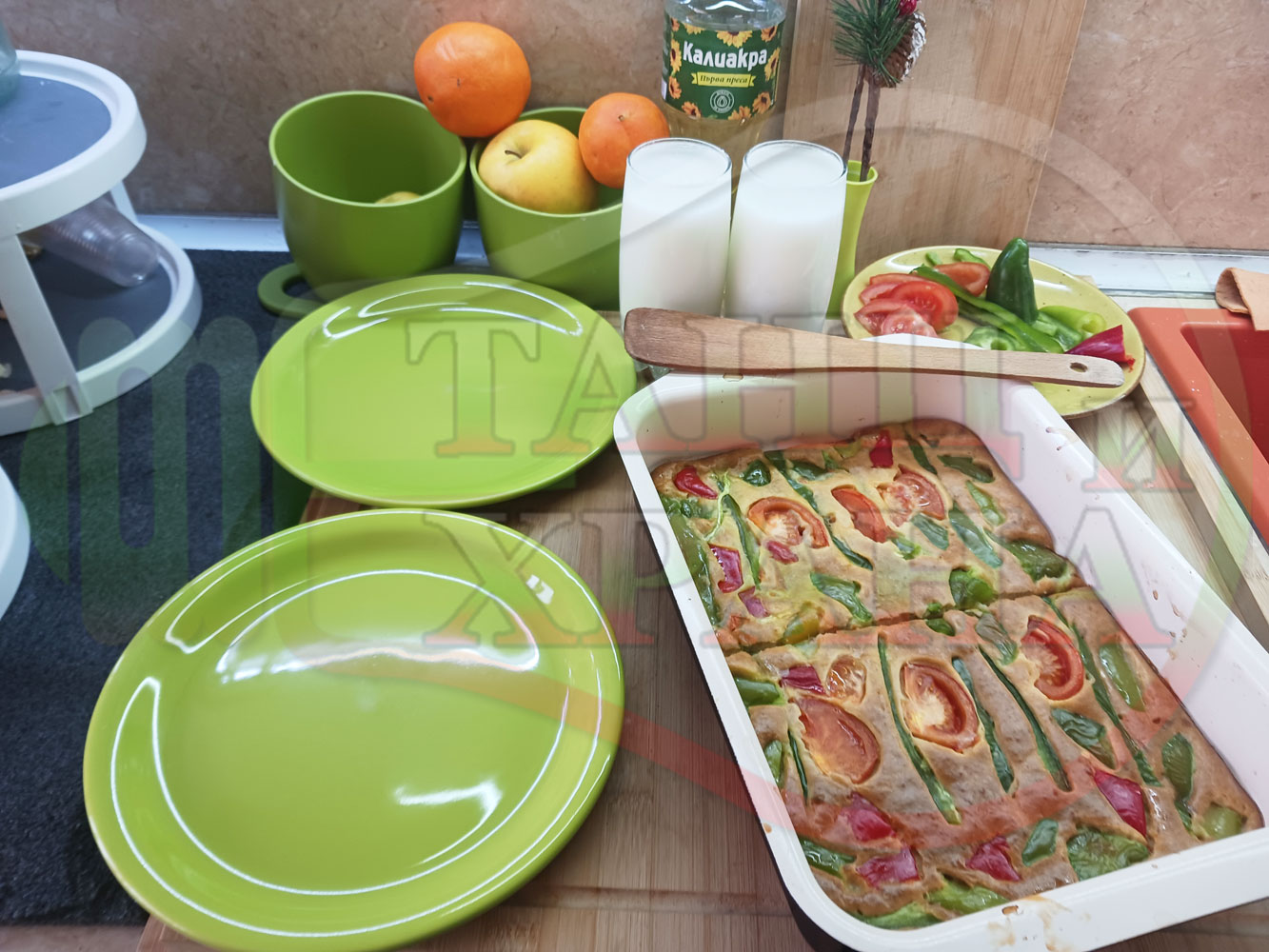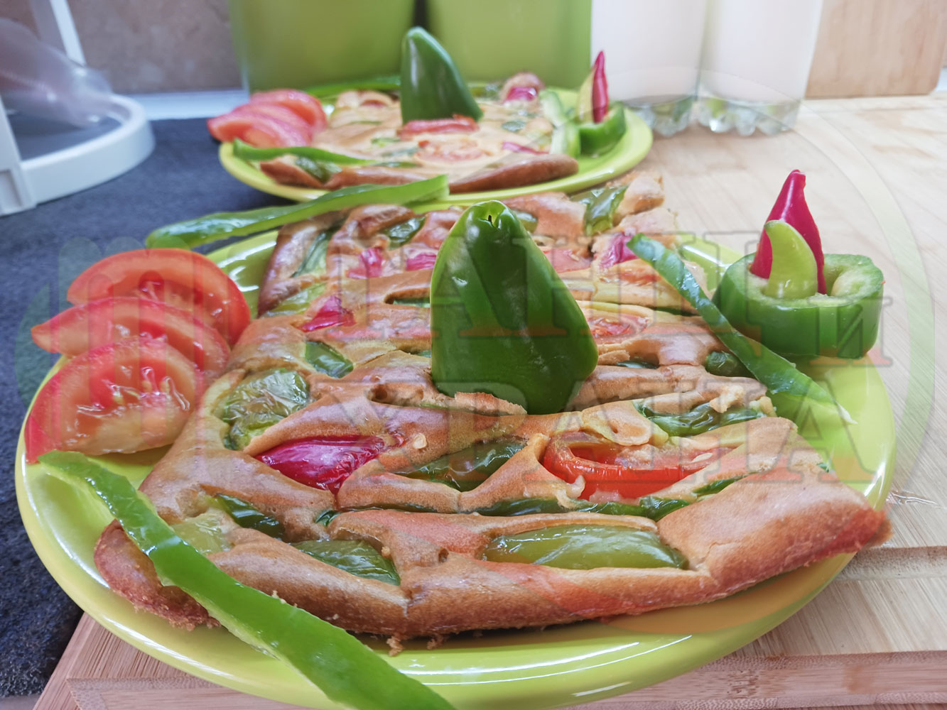 Българска бухтена пита "Градинарскозеленчукова зеленочервеночушкова киселомлечносодена" изпечена на фурна с червени и зелени пресни чушки и домати омесена с яйца, сода за хляб и кисело мляко от България