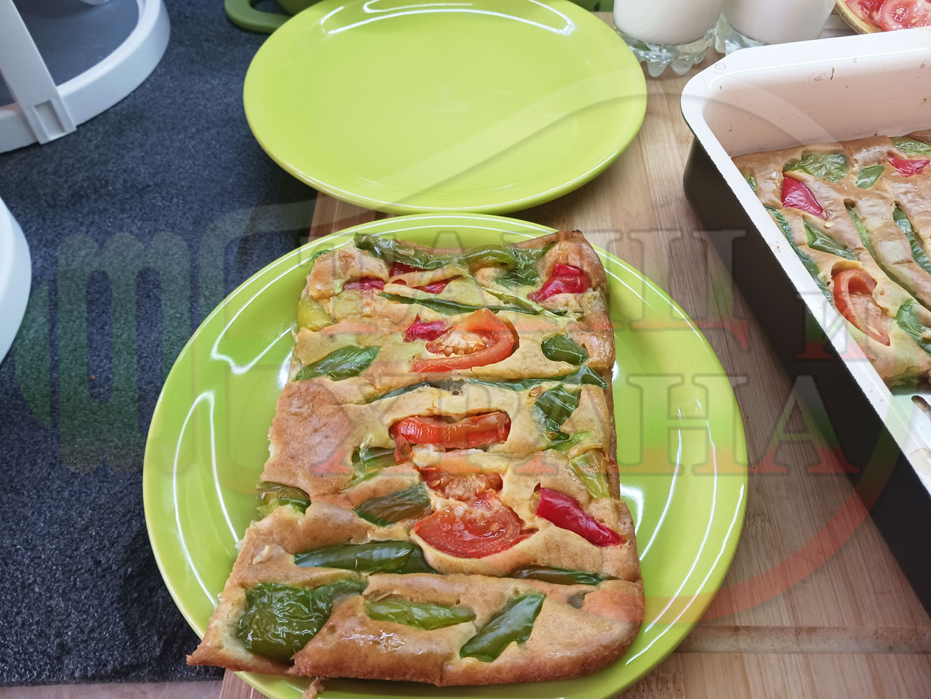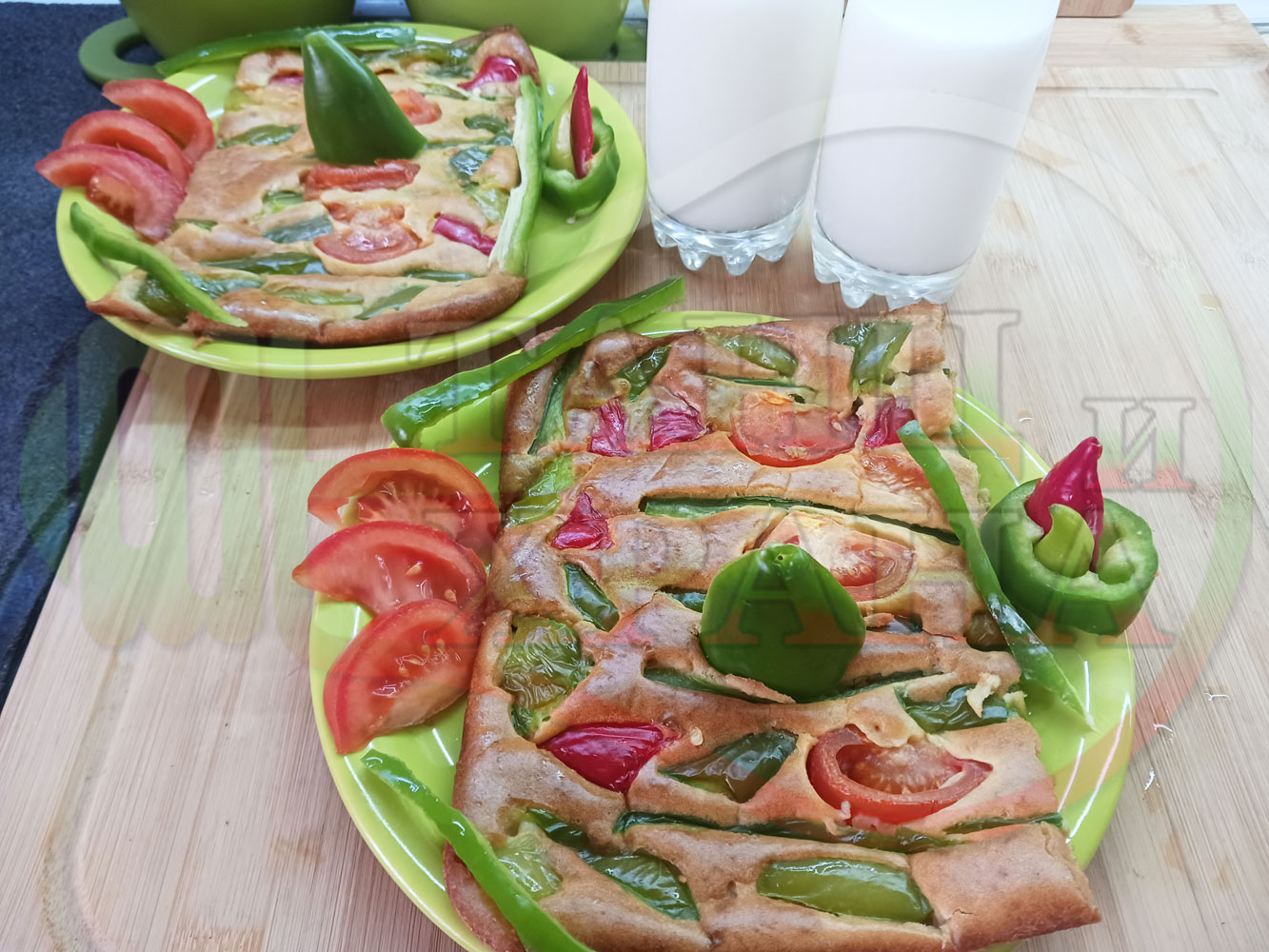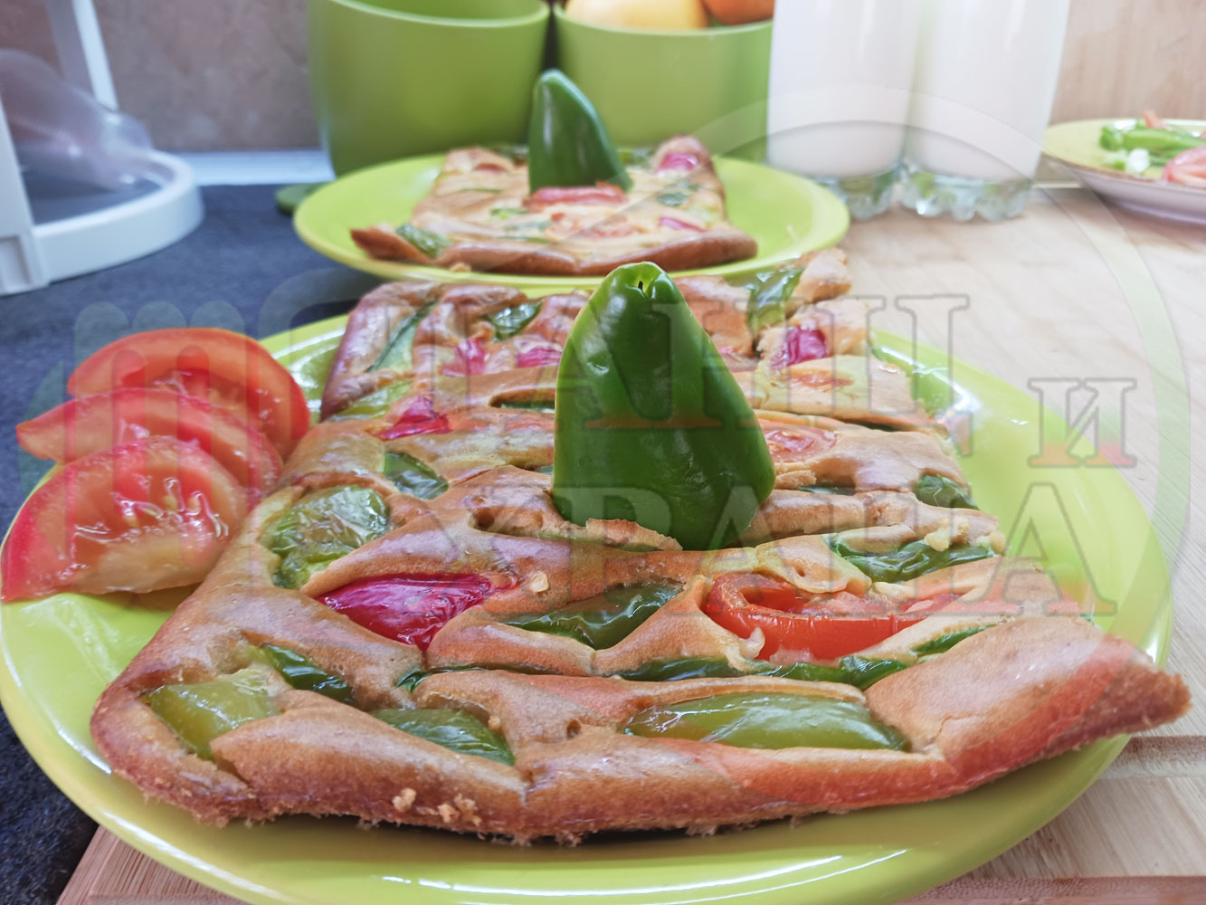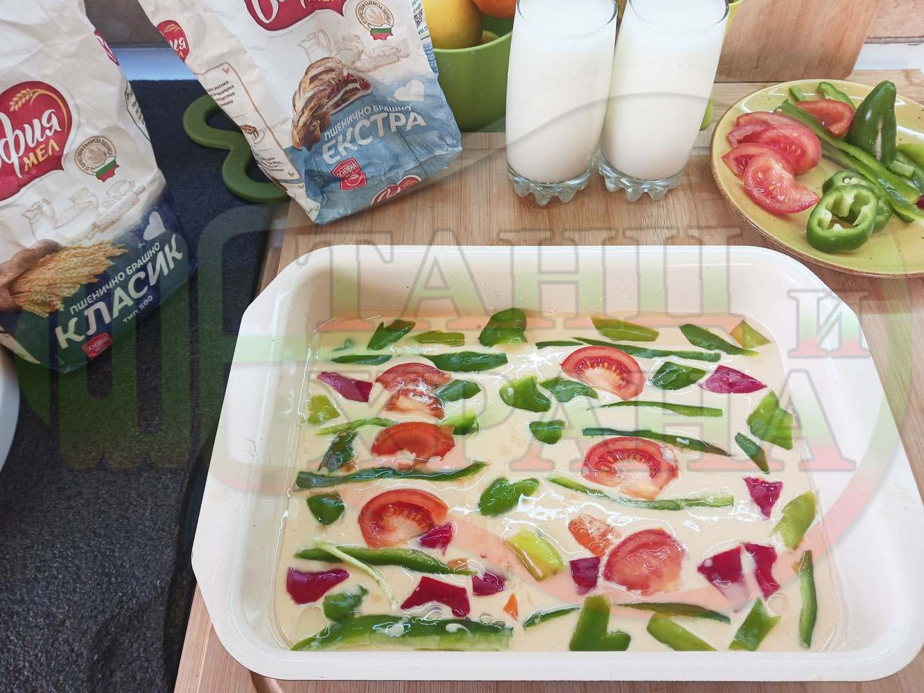 Българска бухтена пита "Градинарскозеленчукова зеленочервеночушкова киселомлечносодена" изпечена на фурна с червени и зелени пресни чушки и домати омесена с яйца, сода за хляб и кисело мляко от България