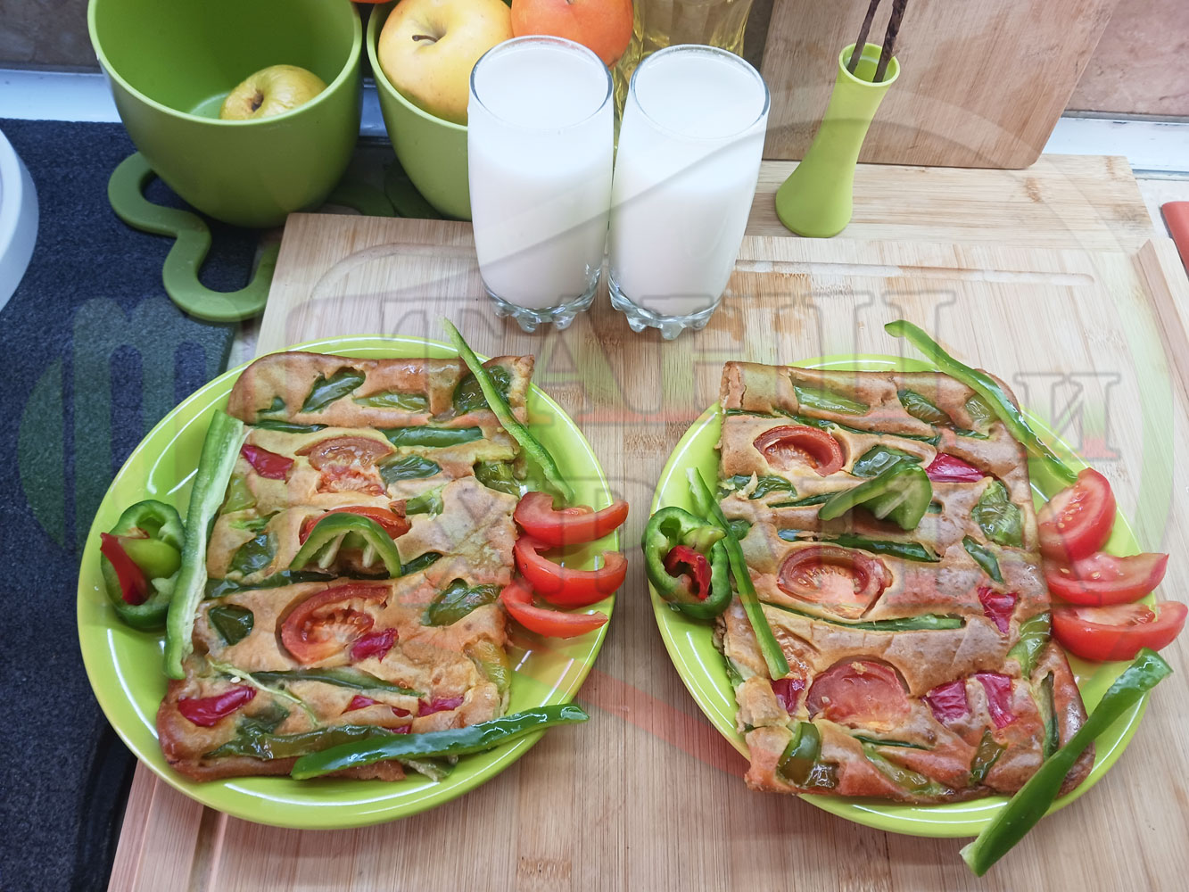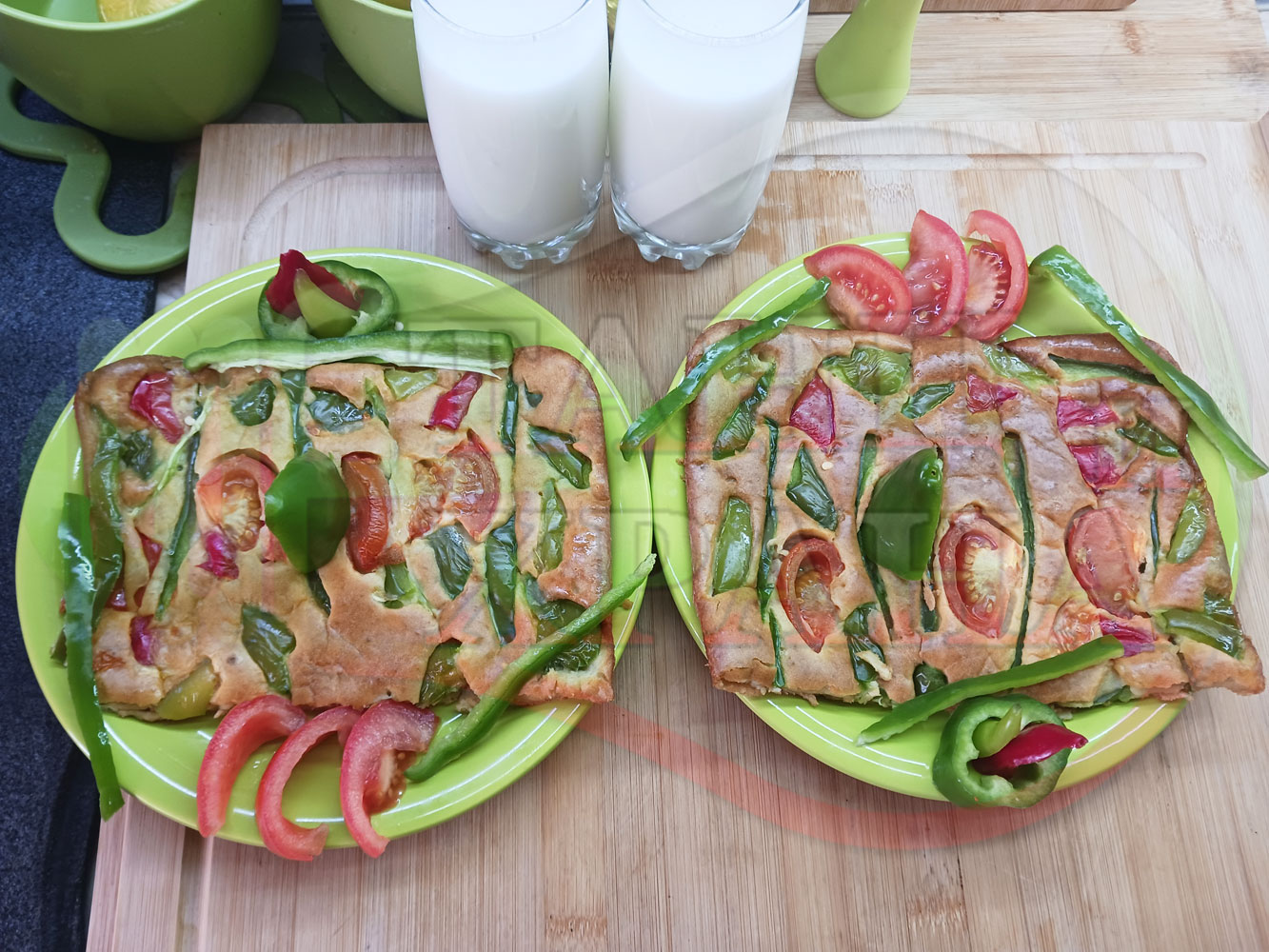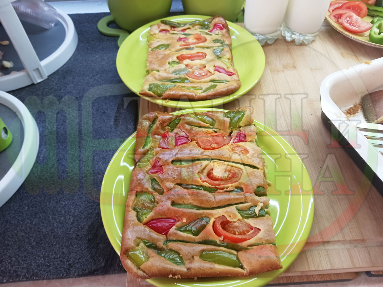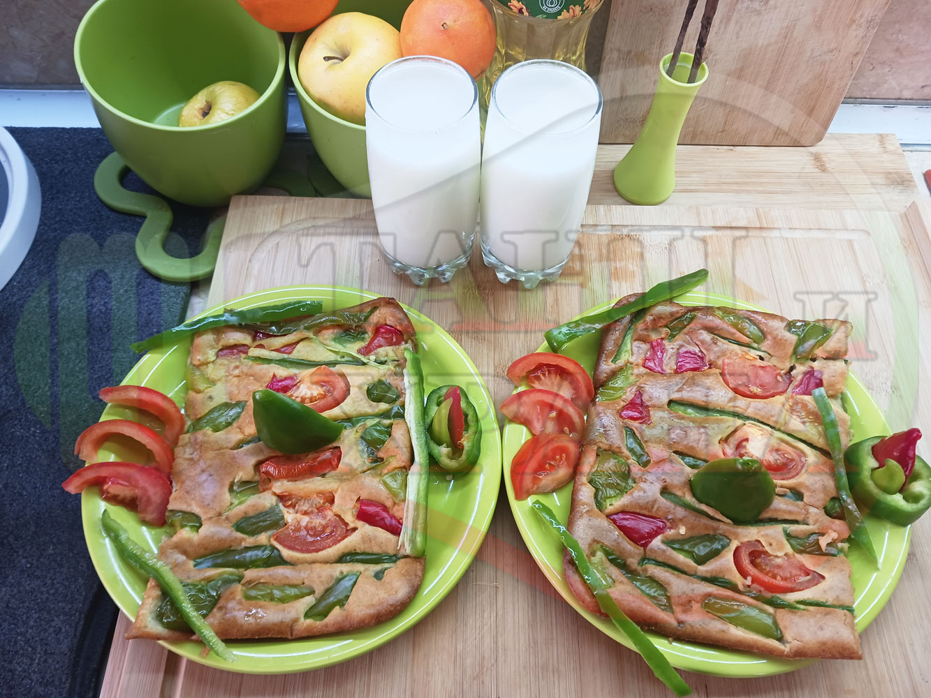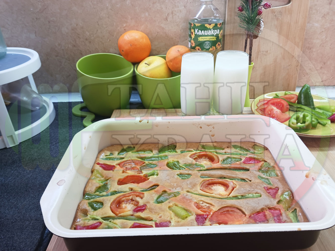 Българска бухтена пита "Градинарскозеленчукова зеленочервеночушкова киселомлечносодена" изпечена на фурна с червени и зелени пресни чушки и домати омесена с яйца, сода за хляб и кисело мляко от България