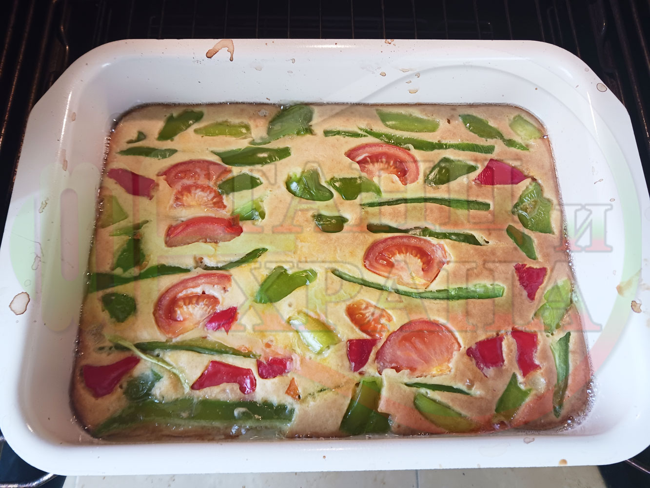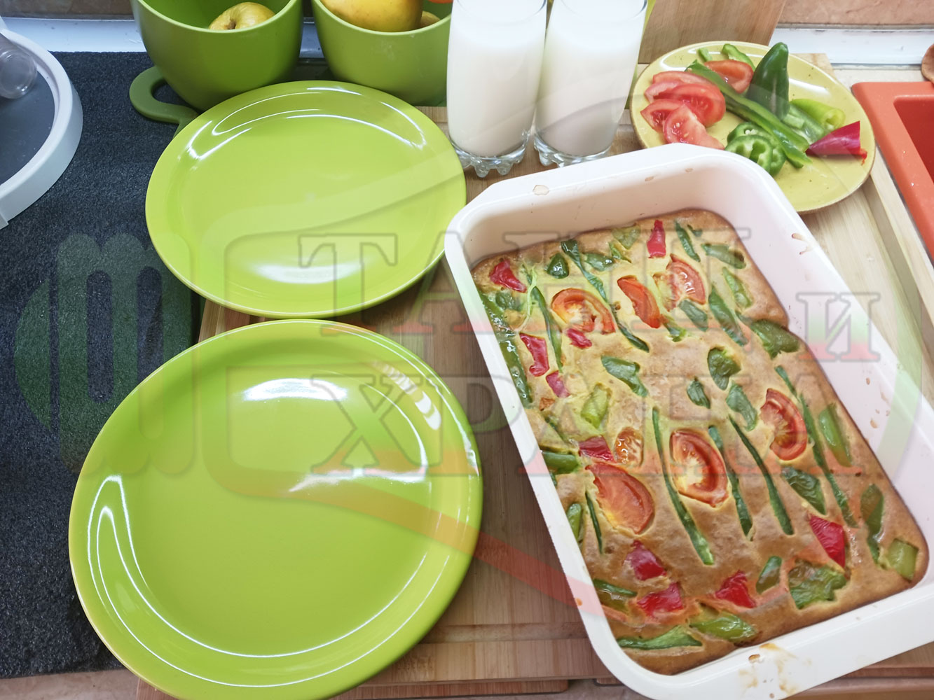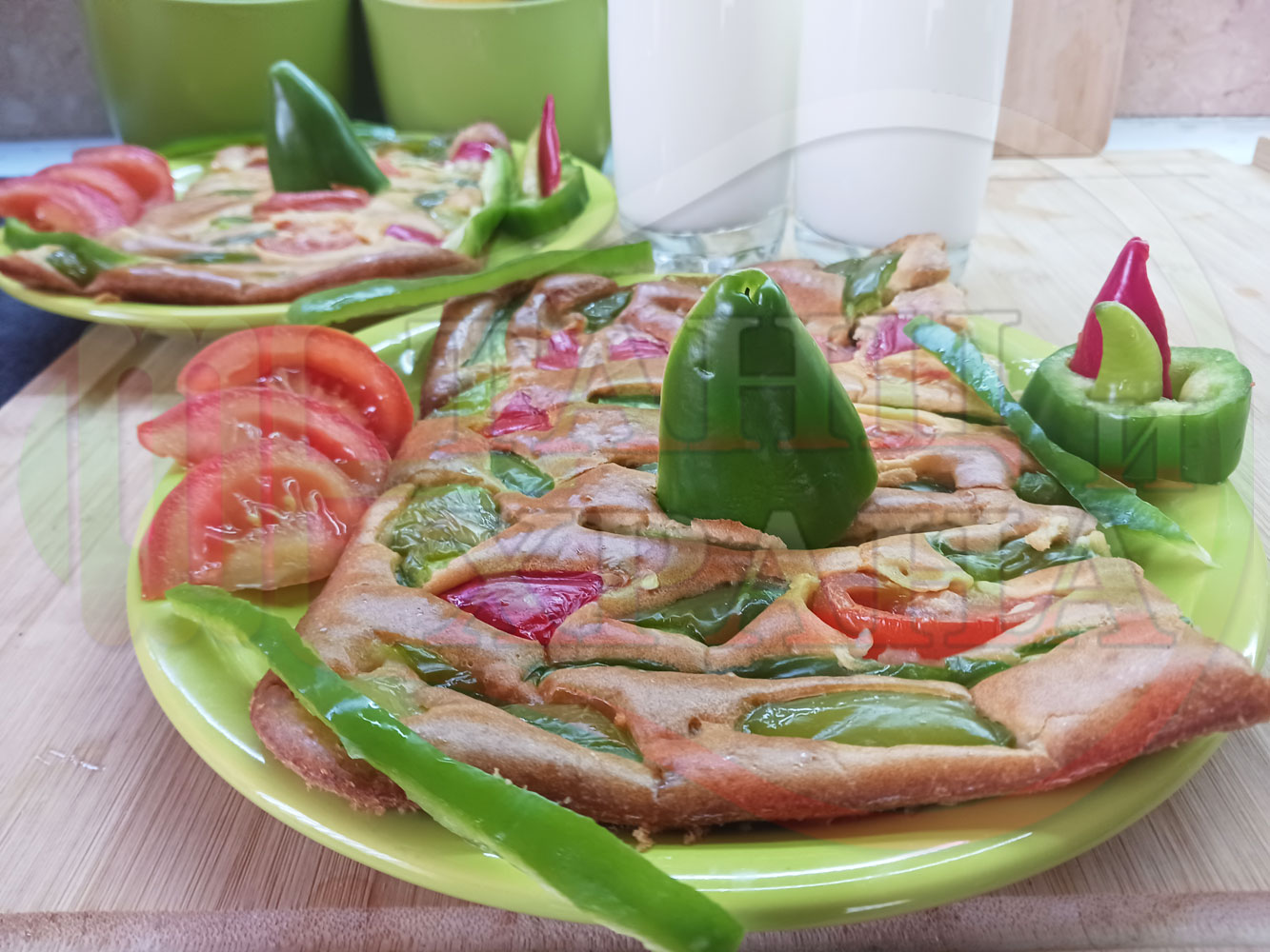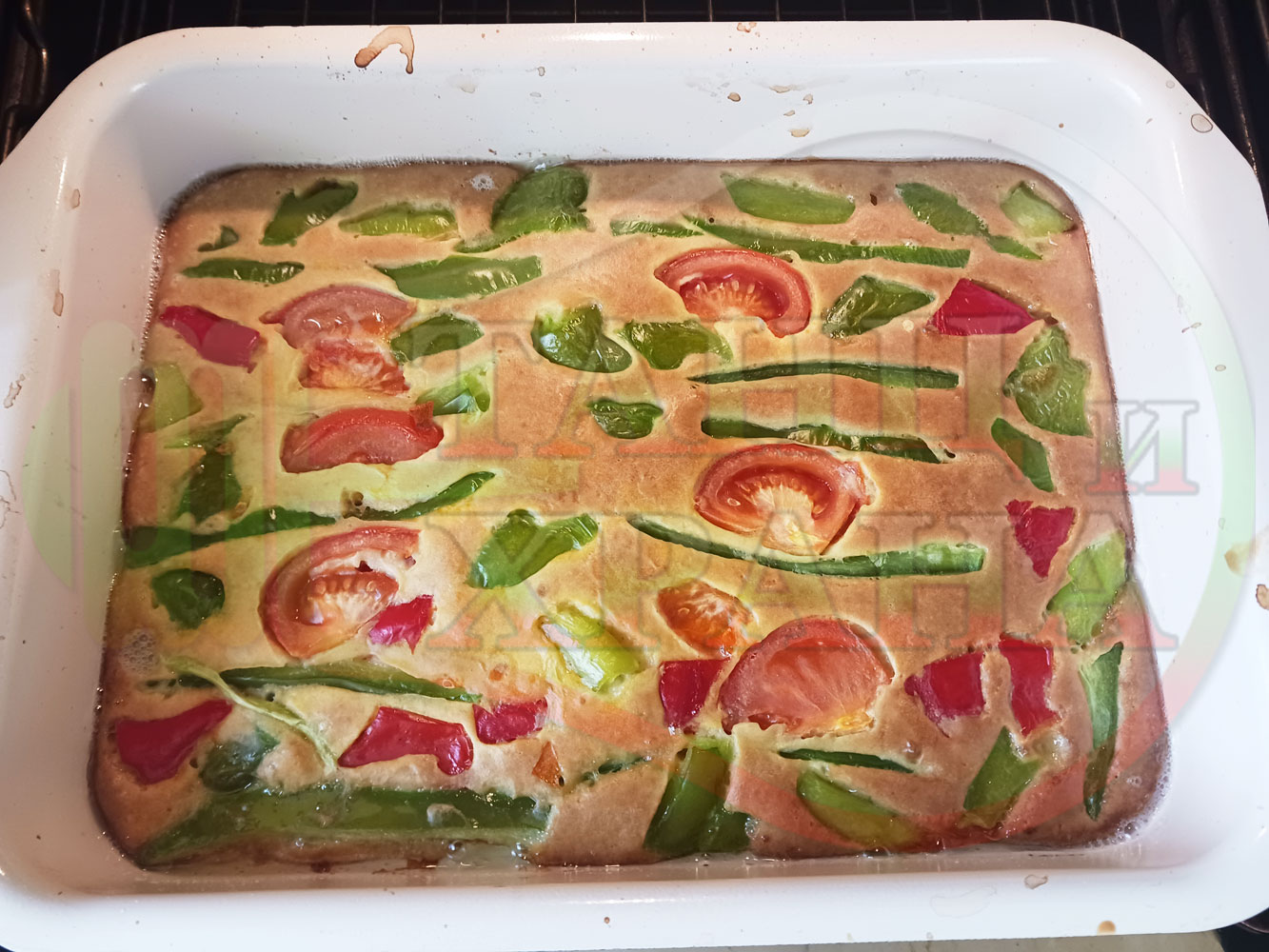 Българска бухтена пита "Градинарскозеленчукова зеленочервеночушкова киселомлечносодена" изпечена на фурна с червени и зелени пресни чушки и домати омесена с яйца, сода за хляб и кисело мляко от България