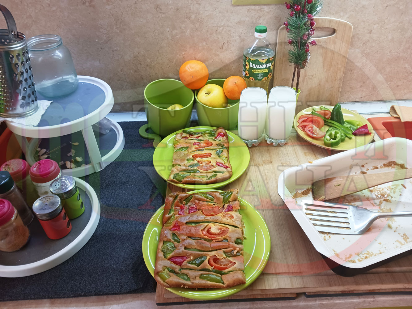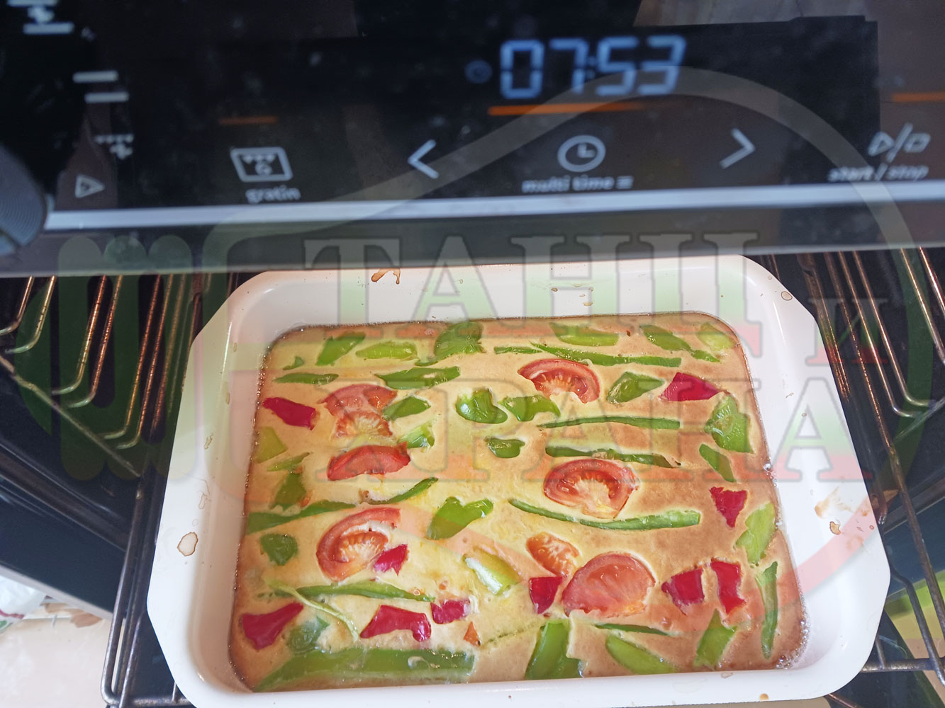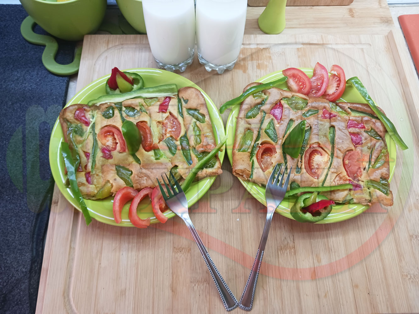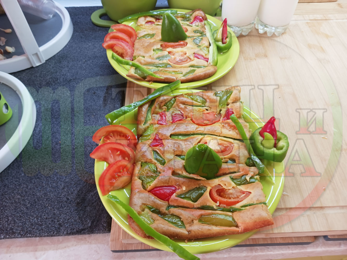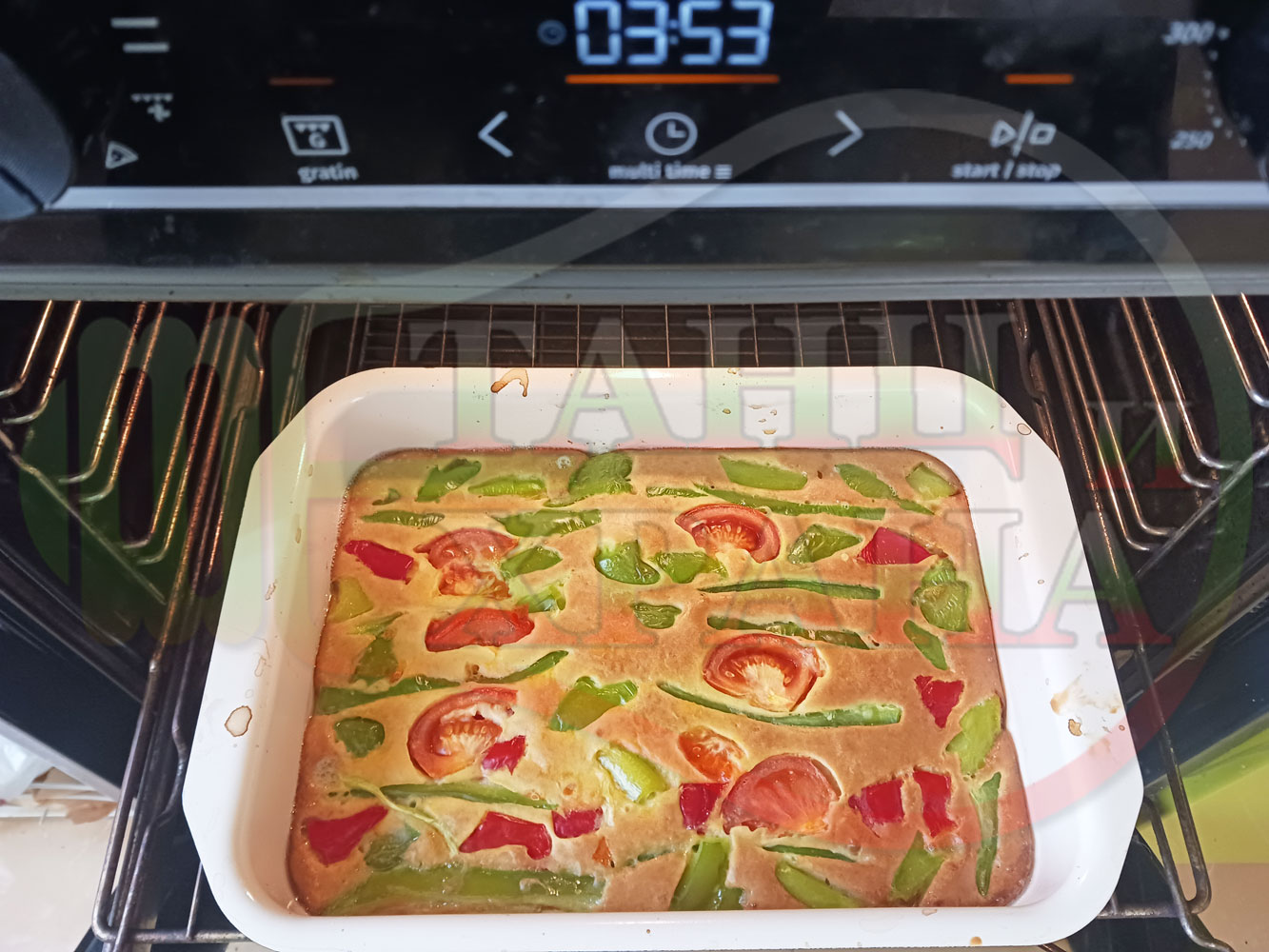 Българска бухтена пита "Градинарскозеленчукова зеленочервеночушкова киселомлечносодена" изпечена на фурна с червени и зелени пресни чушки и домати омесена с яйца, сода за хляб и кисело мляко от България