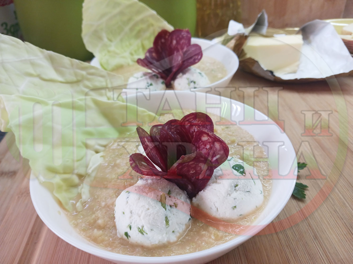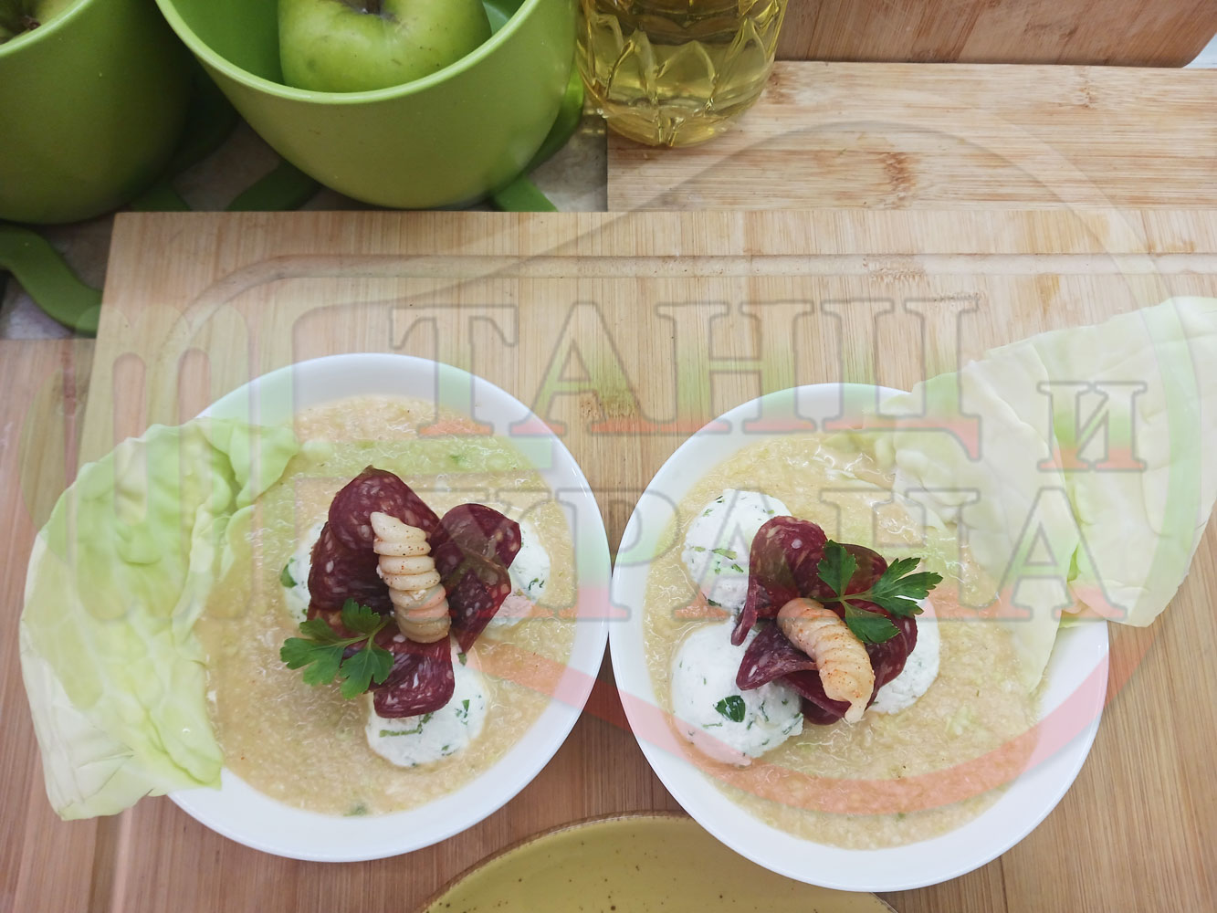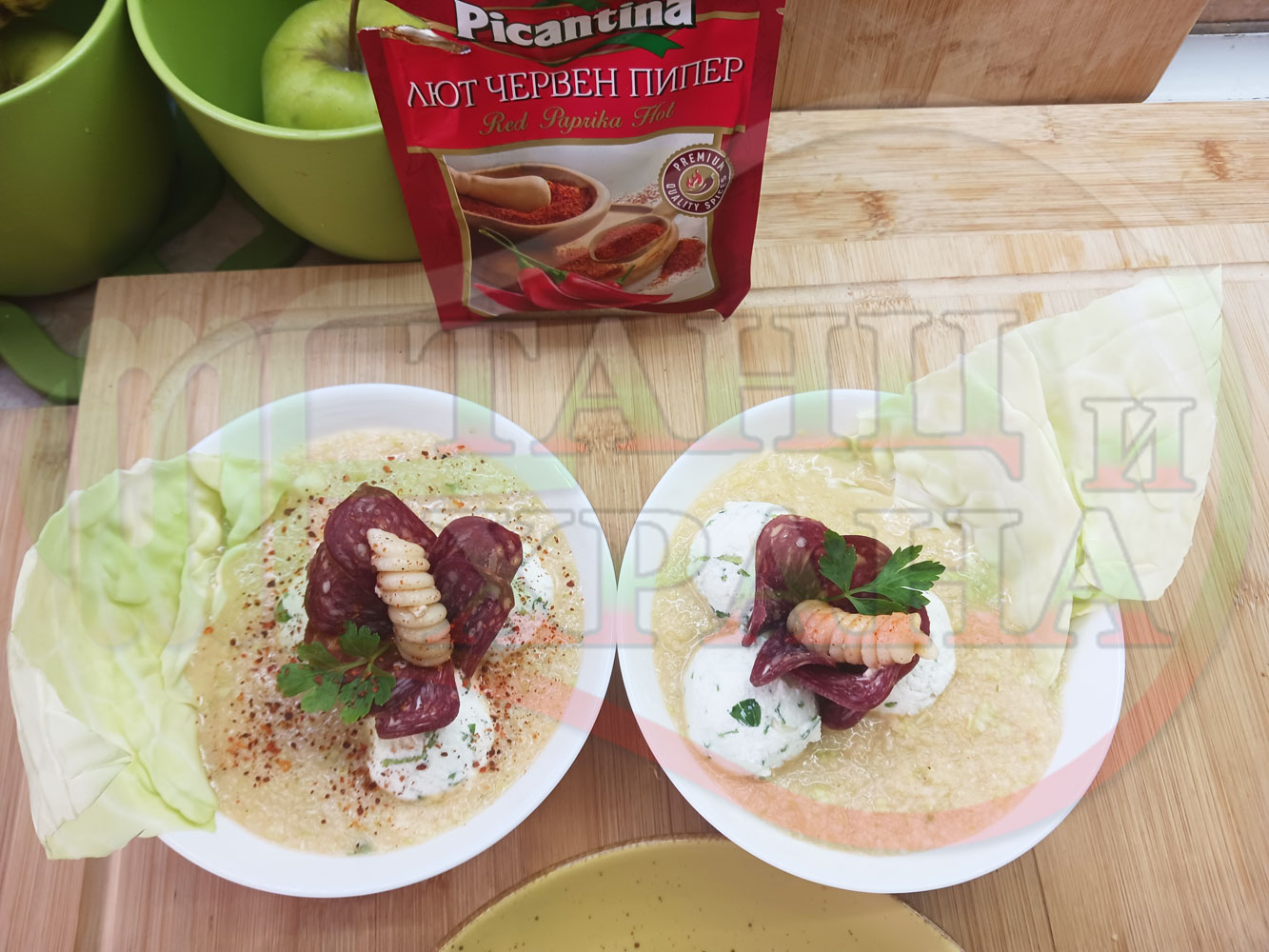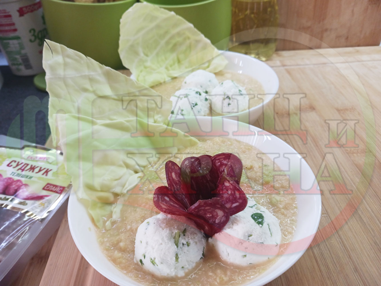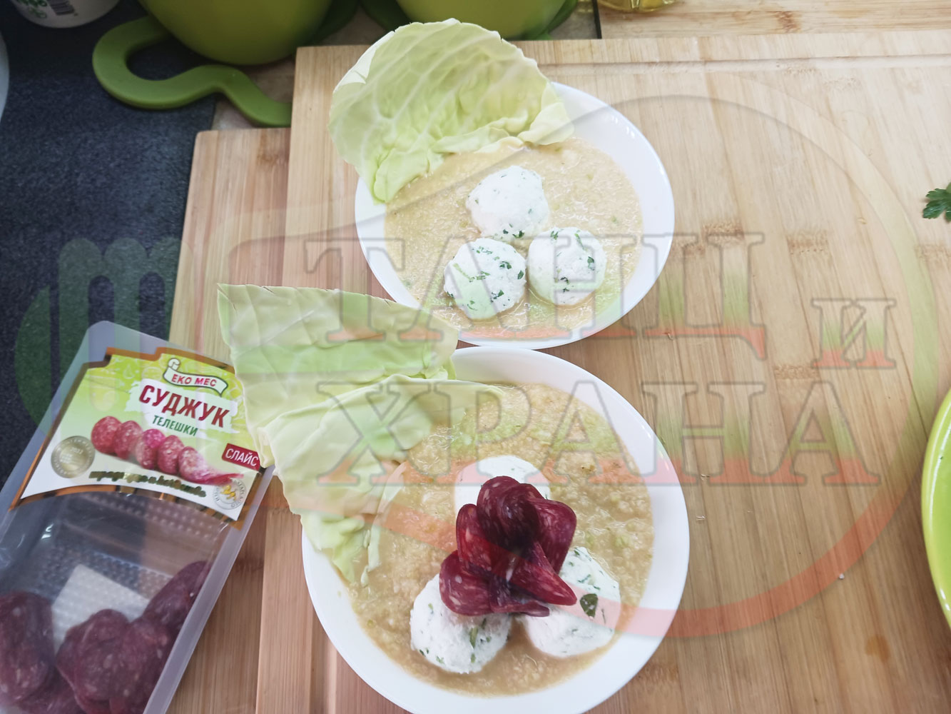 Българска зелева сурова супа "Зелевомакароненососова с БГсирене" приготвена с прясно зеле и червенопиперен сос от макарони гарнирана със суджук и топчета от сиренов крем с магданоз, чесън и краве бяло сирене (българско, саламурено) - производна