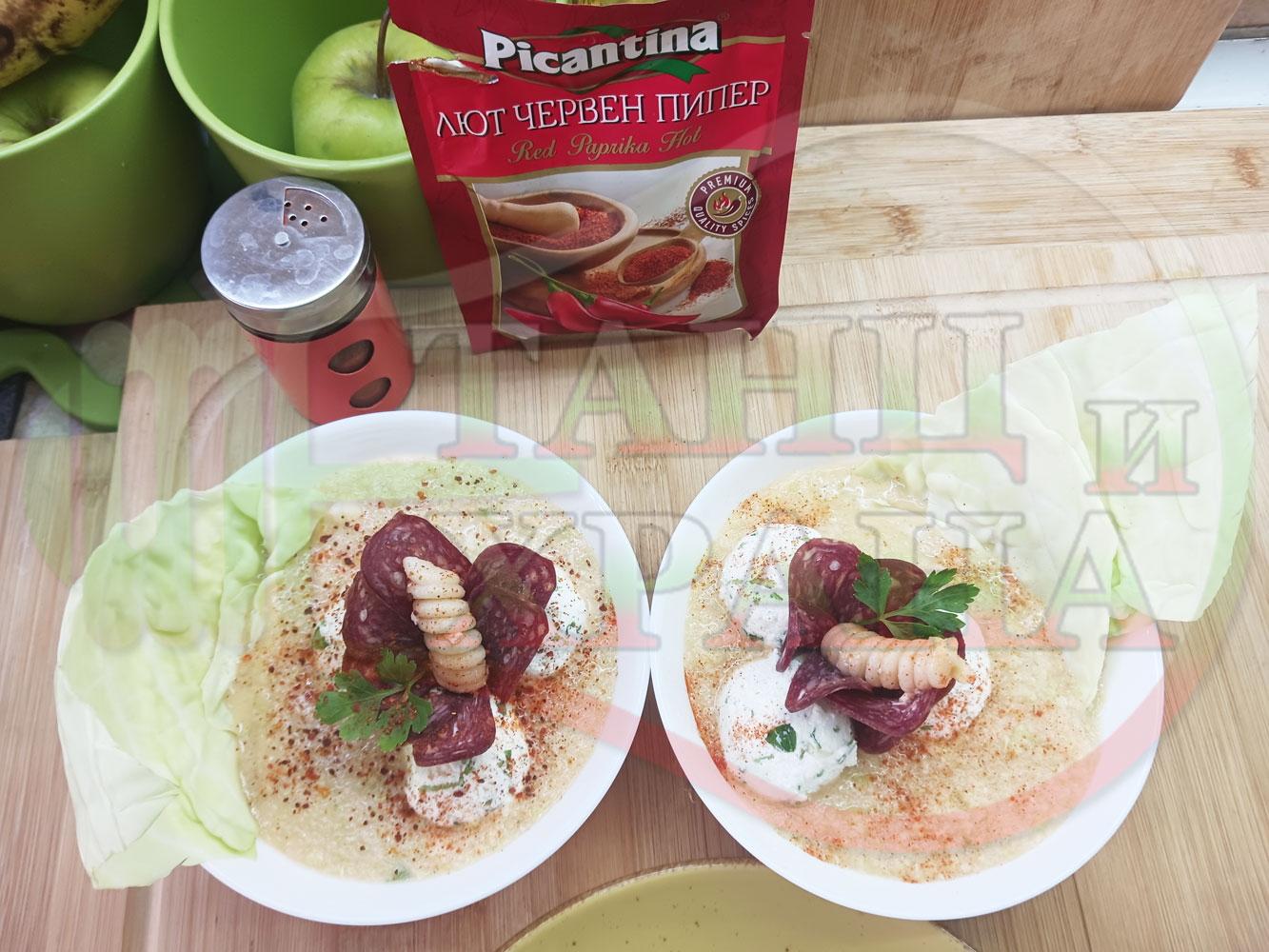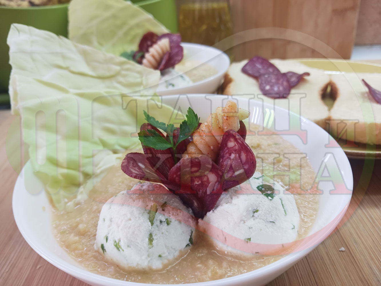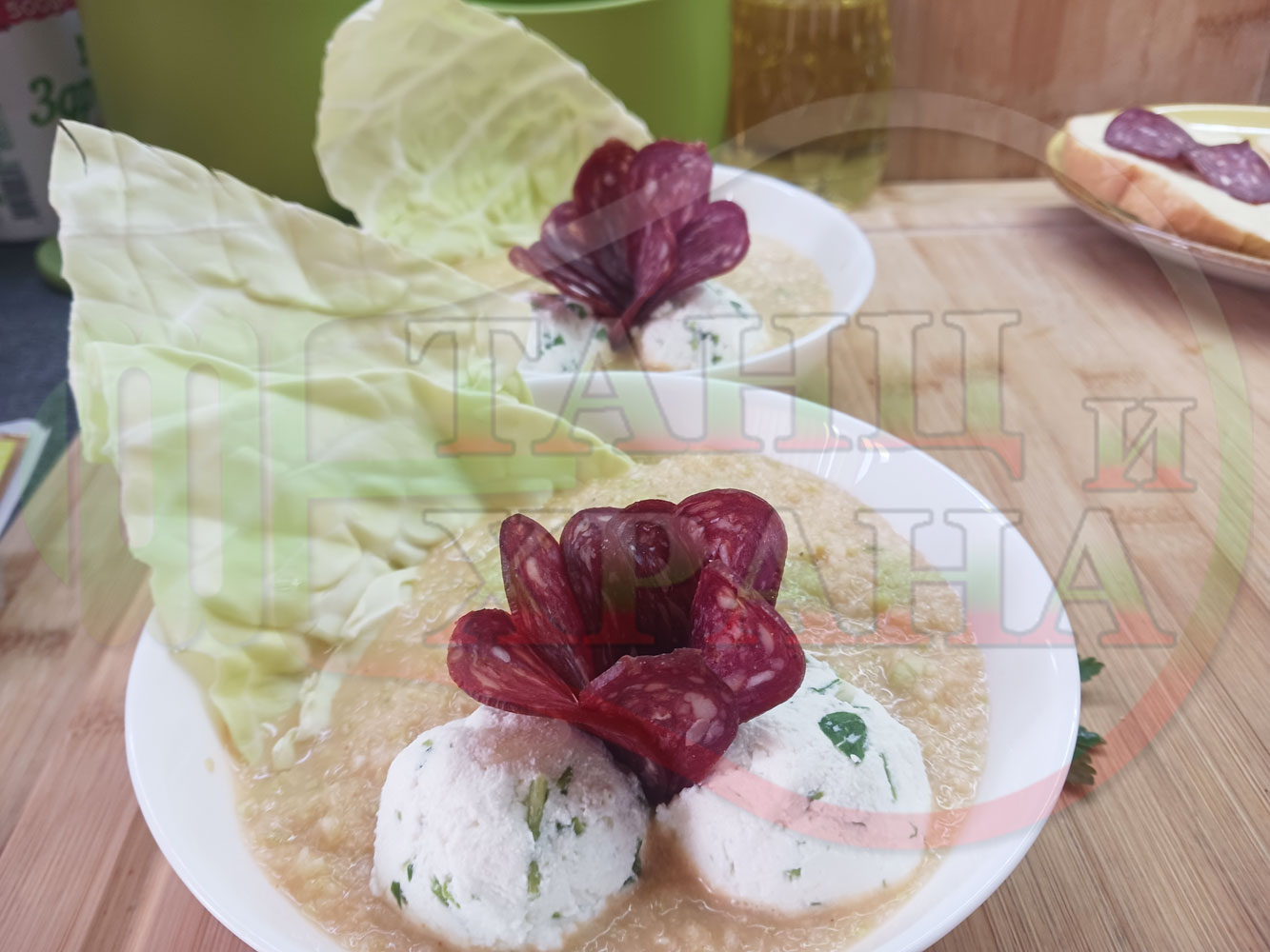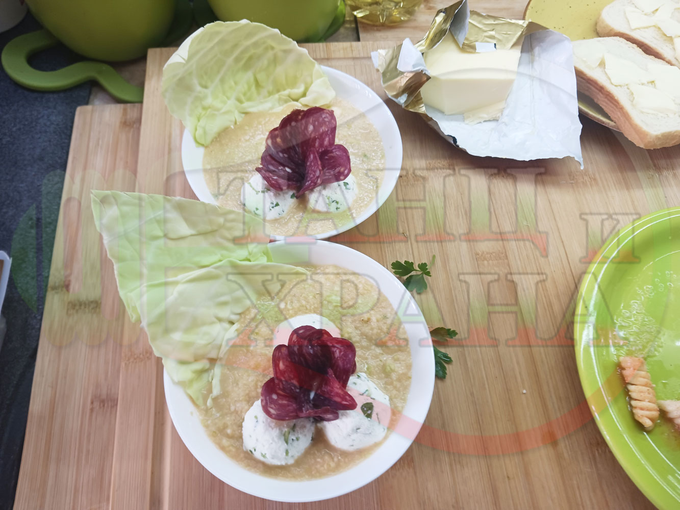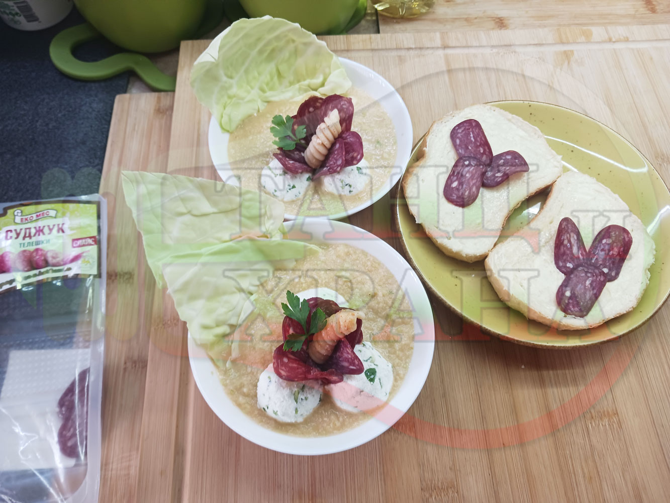Българска зелева сурова супа "Зелевомакароненососова с БГсирене" приготвена с прясно зеле и червенопиперен сос от макарони гарнирана със суджук и топчета от сиренов крем с магданоз, чесън и краве бяло сирене (българско, саламурено) - производна