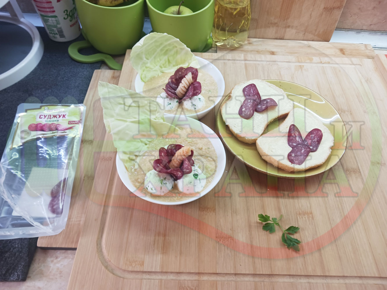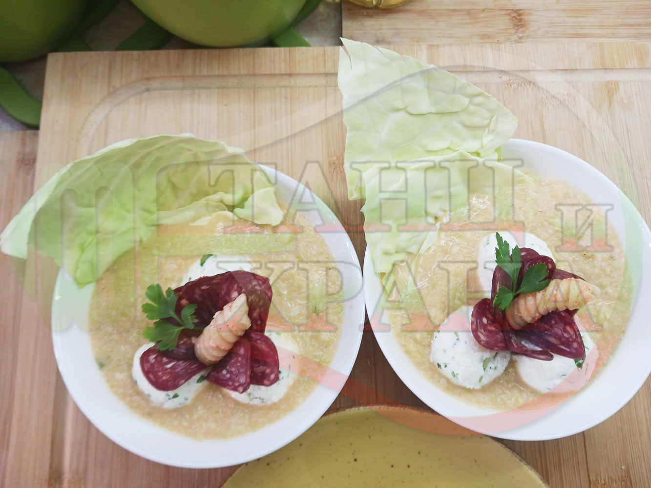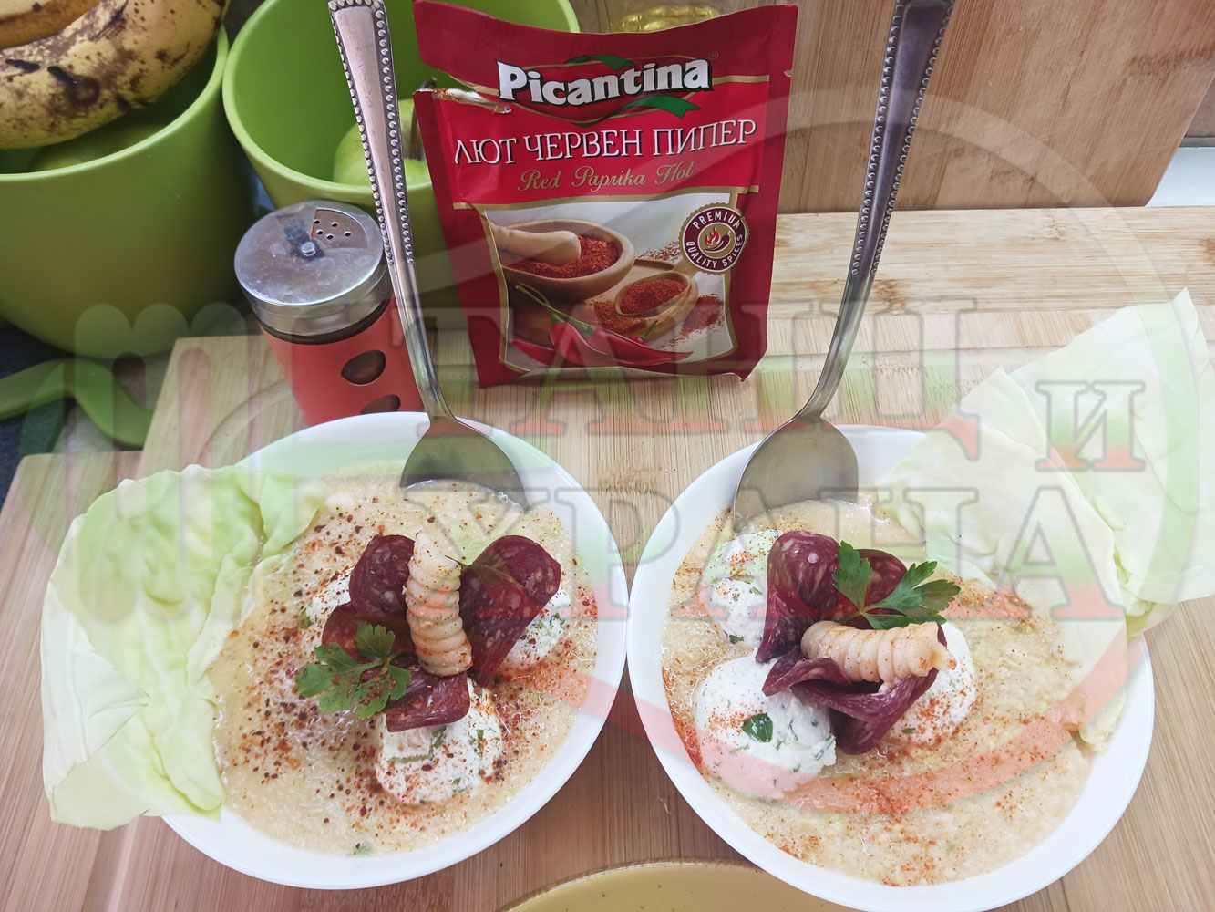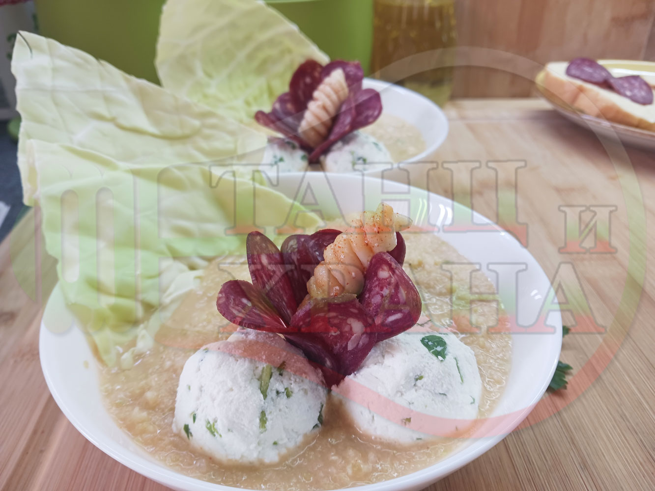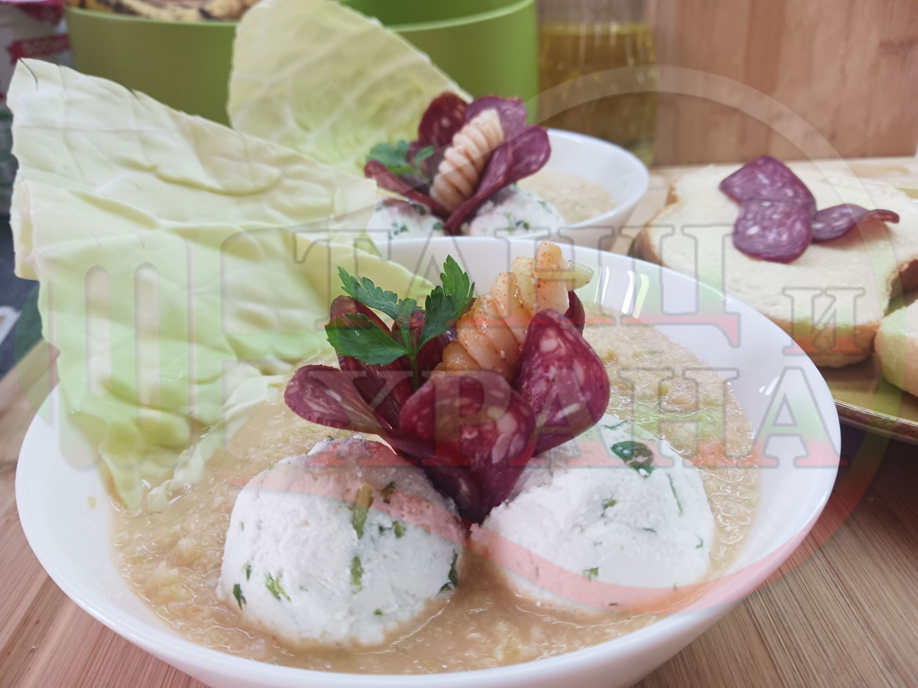 Българска зелева сурова супа "Зелевомакароненососова с БГсирене" приготвена с прясно зеле и червенопиперен сос от макарони гарнирана със суджук и топчета от сиренов крем с магданоз, чесън и краве бяло сирене (българско, саламурено) - производна