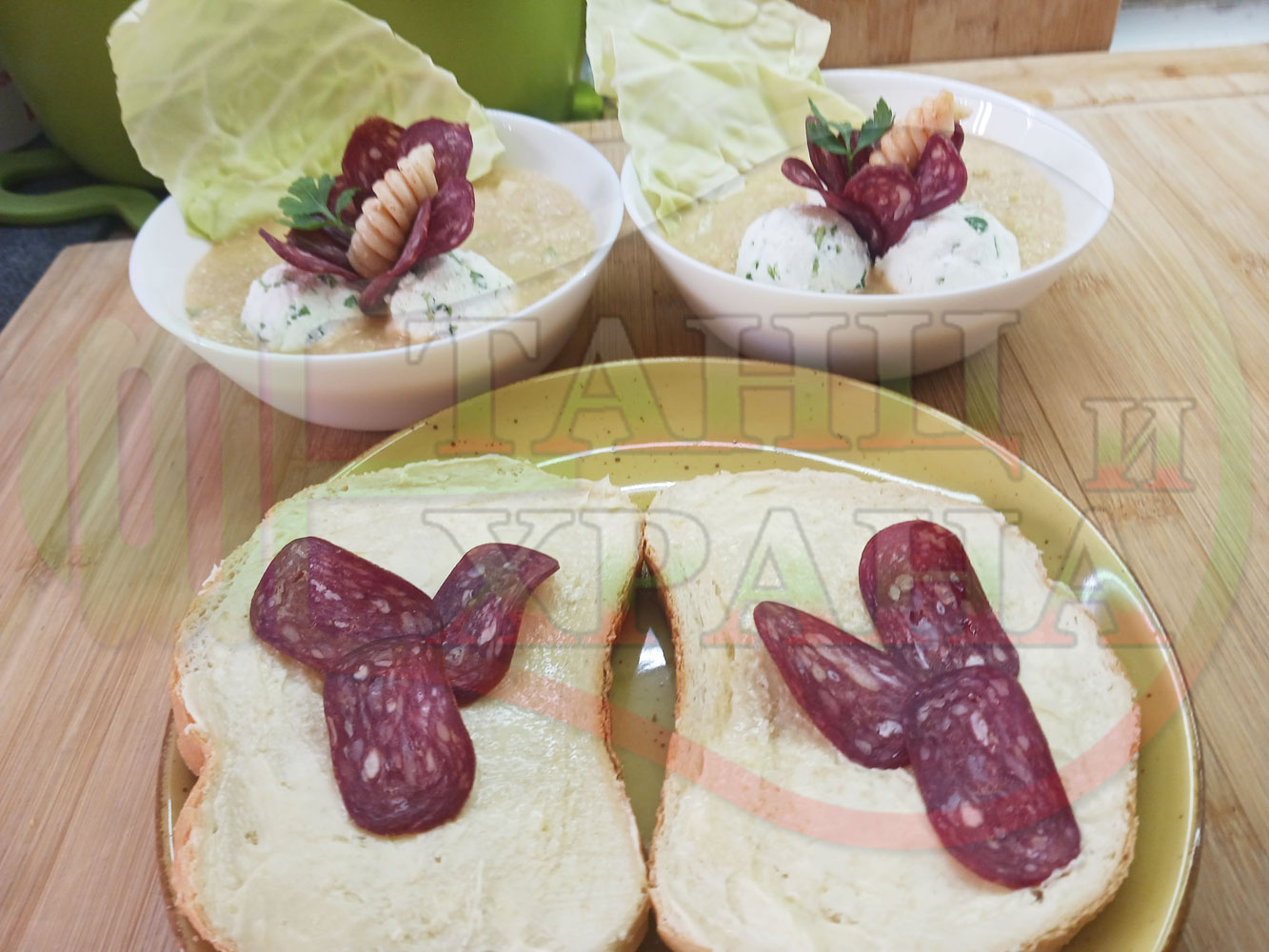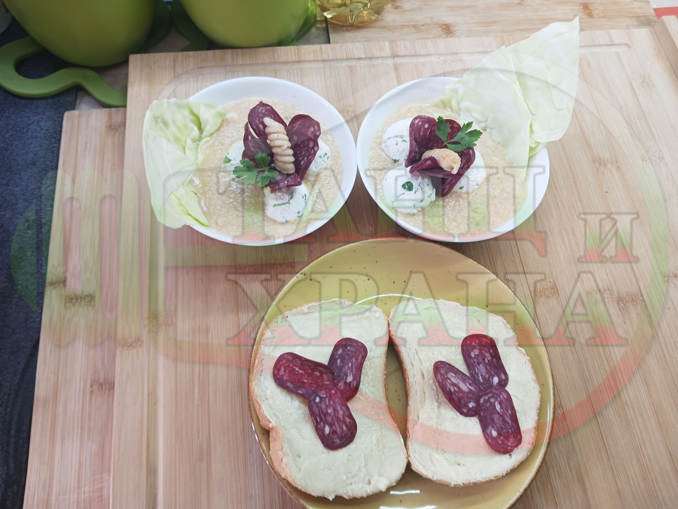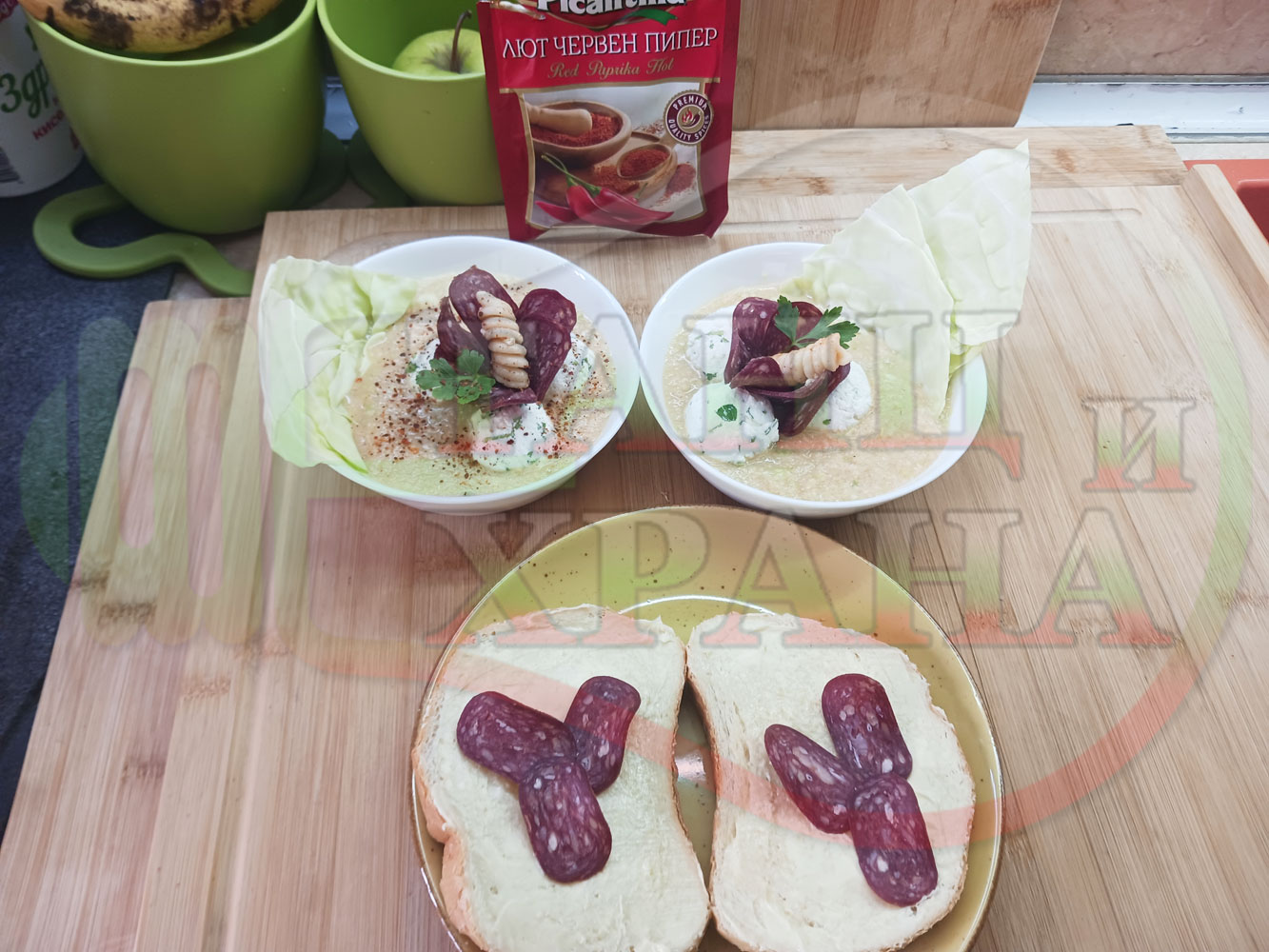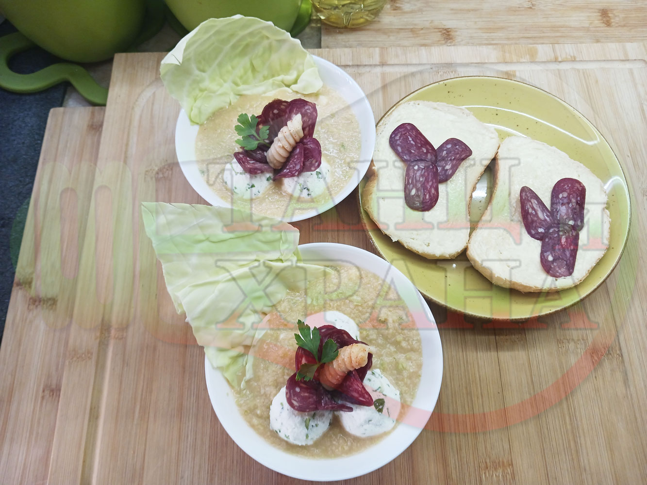 Българска зелева сурова супа "Зелевомакароненососова с БГсирене" приготвена с прясно зеле и червенопиперен сос от макарони гарнирана със суджук и топчета от сиренов крем с магданоз, чесън и краве бяло сирене (българско, саламурено) - производна