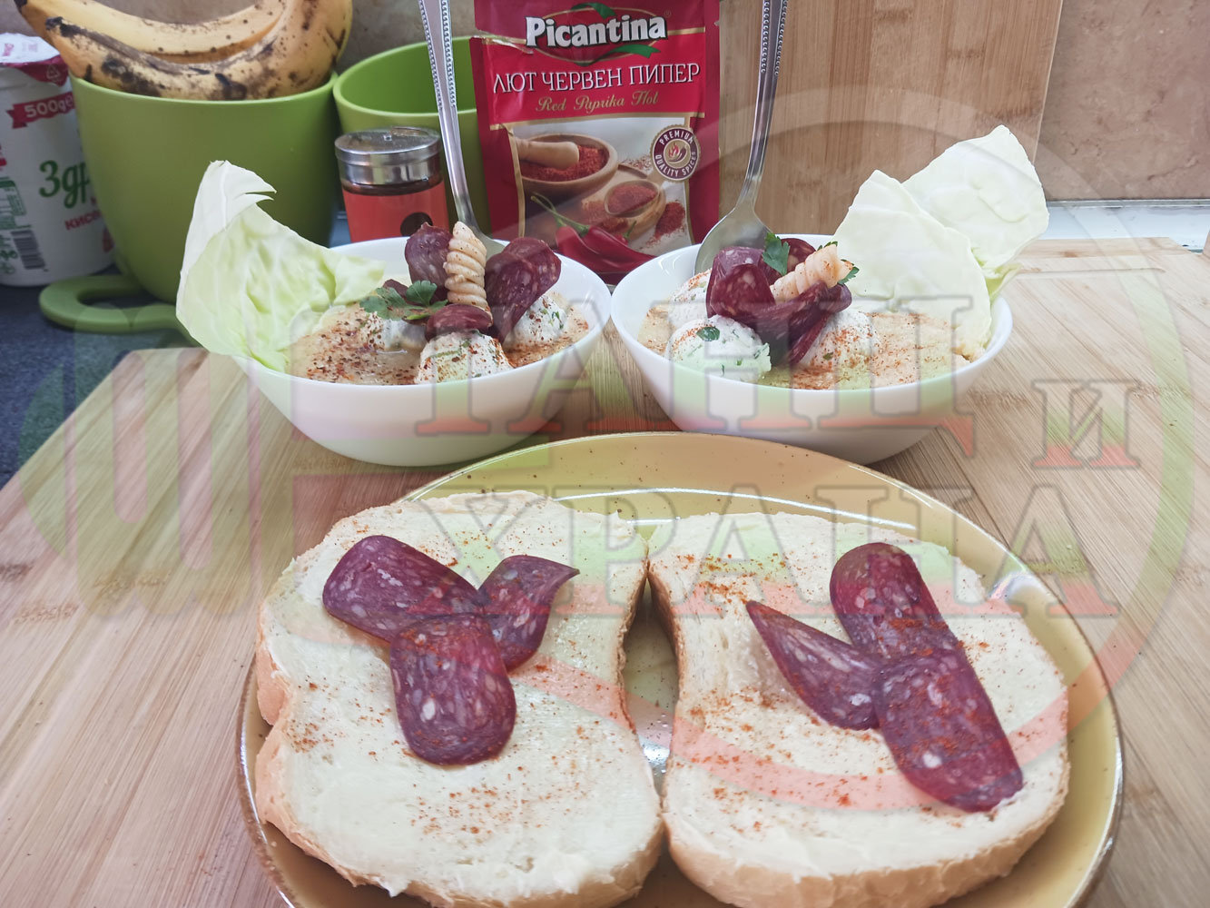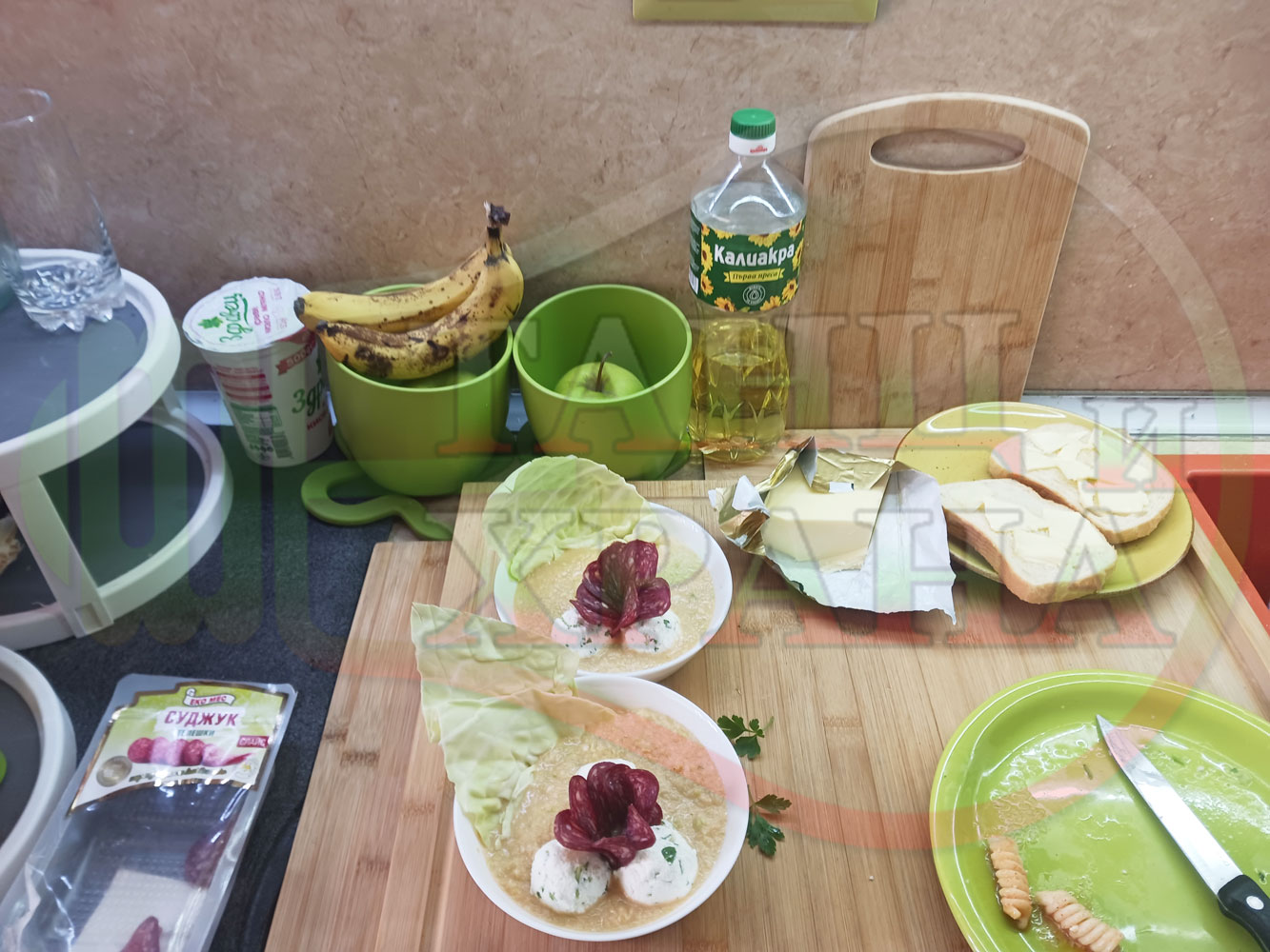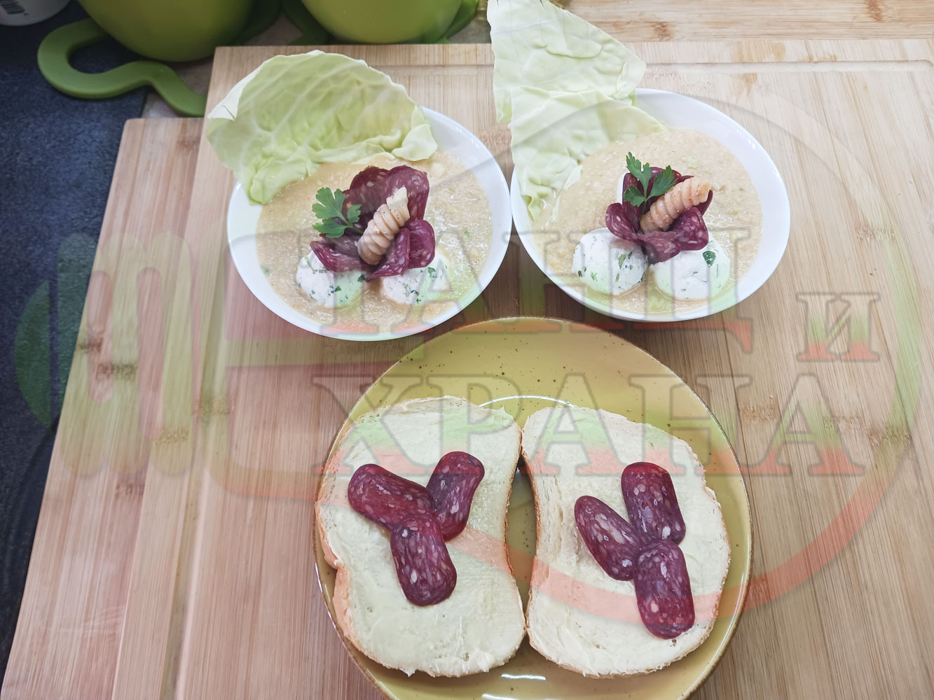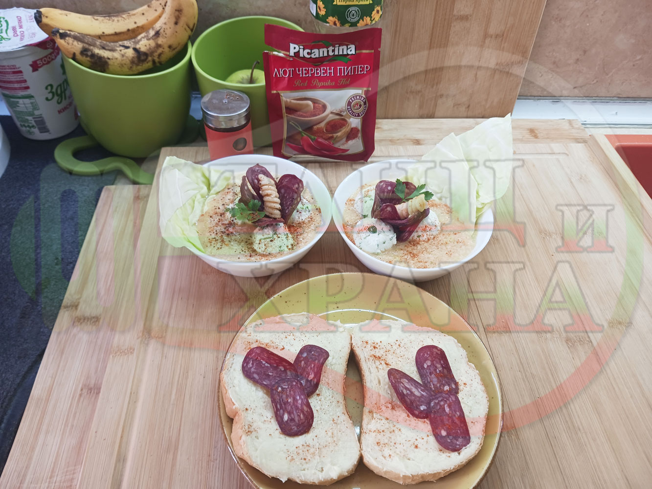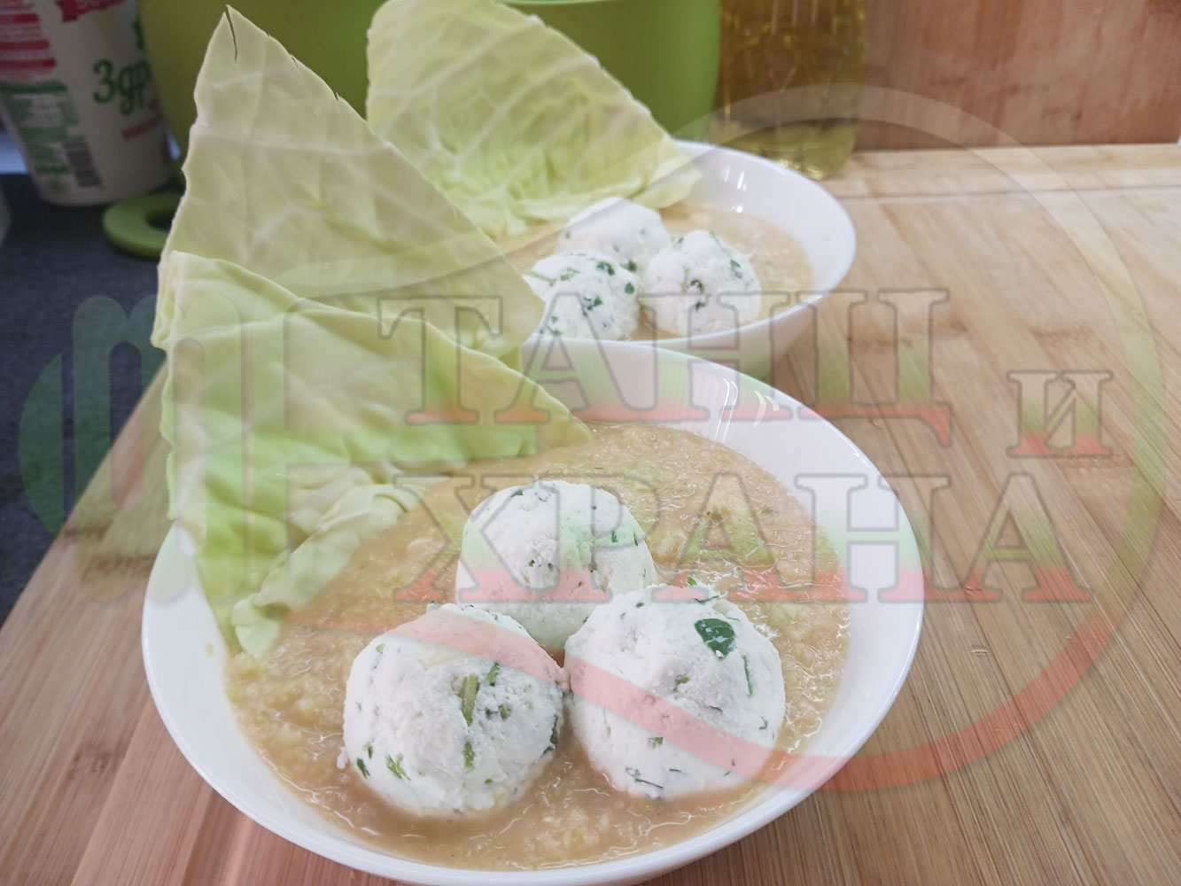 Българска зелева сурова супа "Зелевомакароненососова с БГсирене" приготвена с прясно зеле и червенопиперен сос от макарони гарнирана със суджук и топчета от сиренов крем с магданоз, чесън и краве бяло сирене (българско, саламурено) - производна