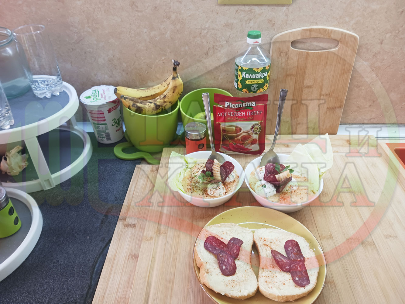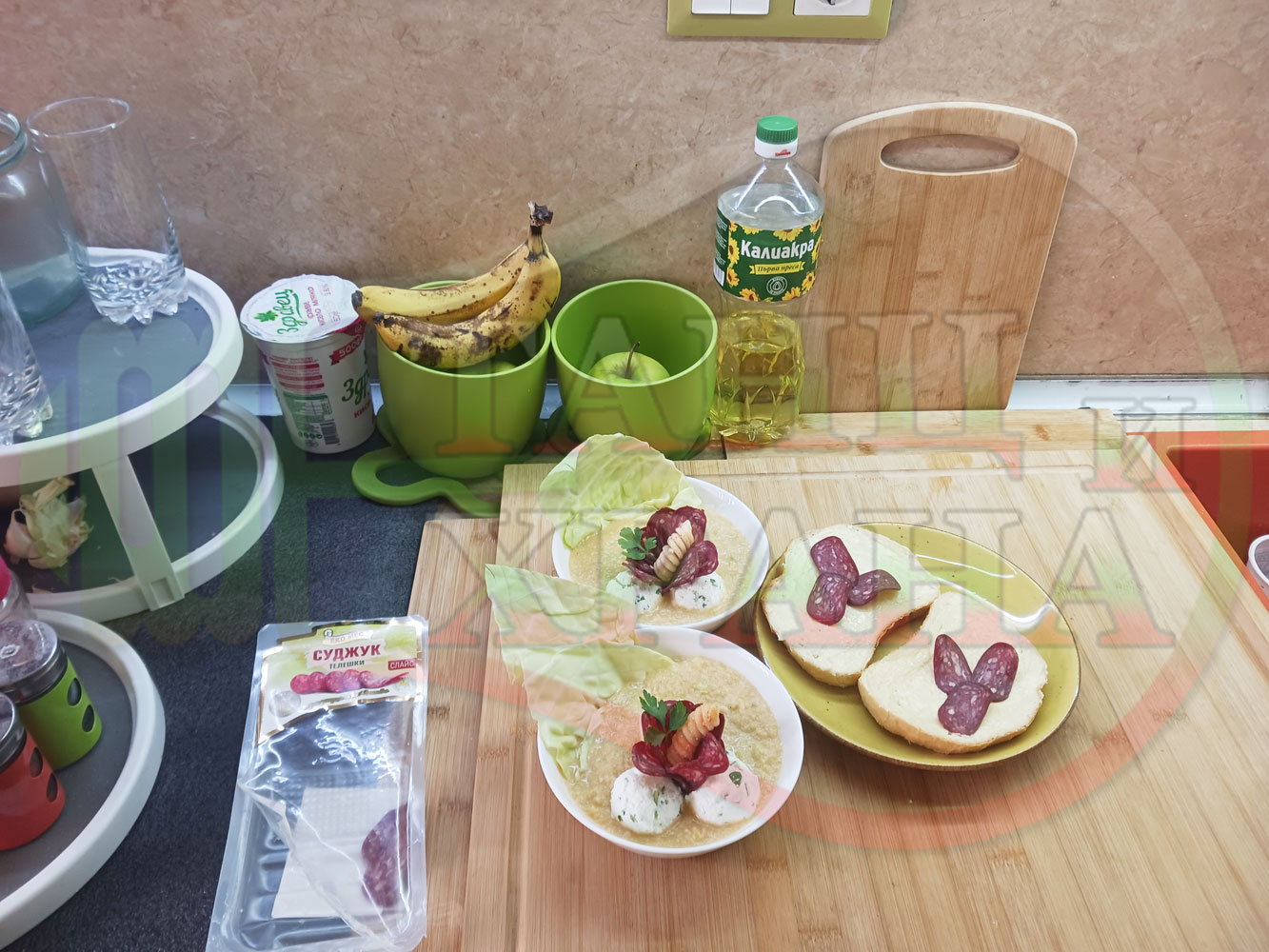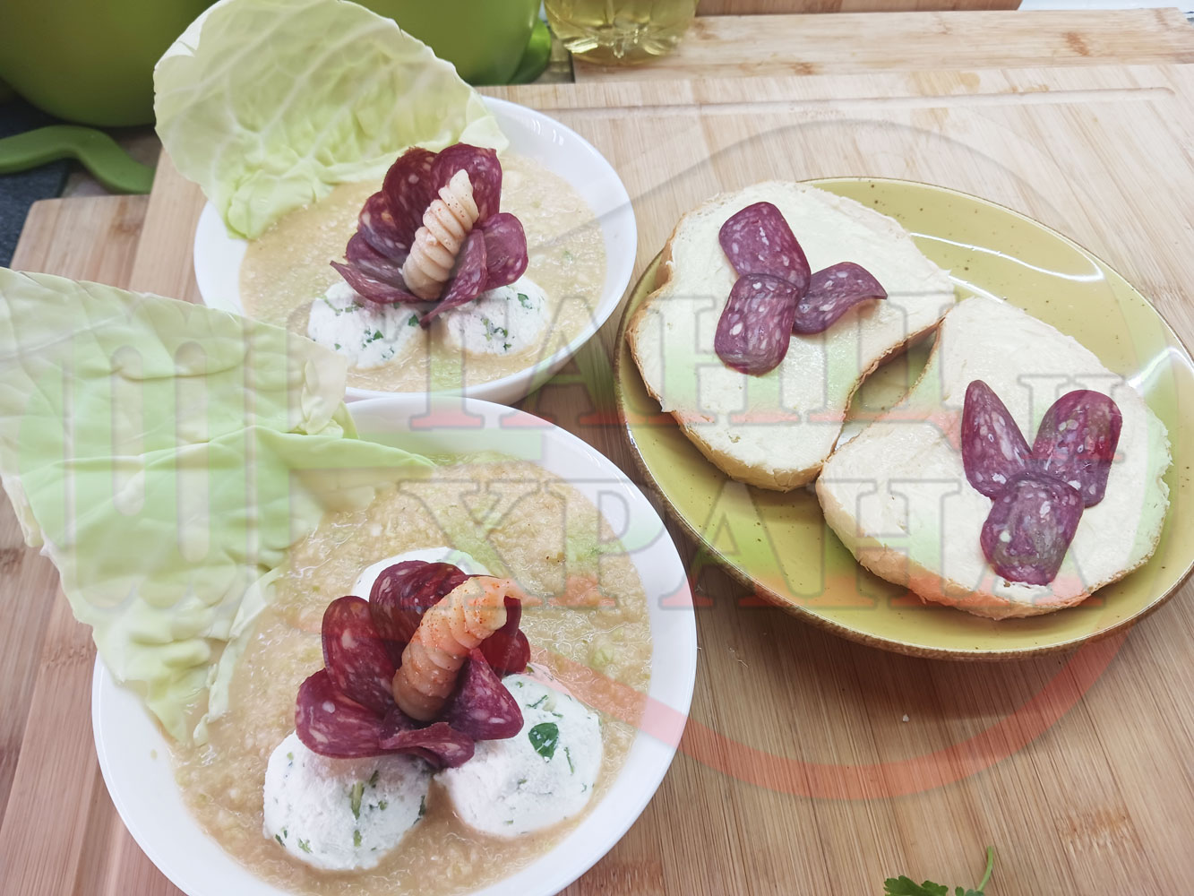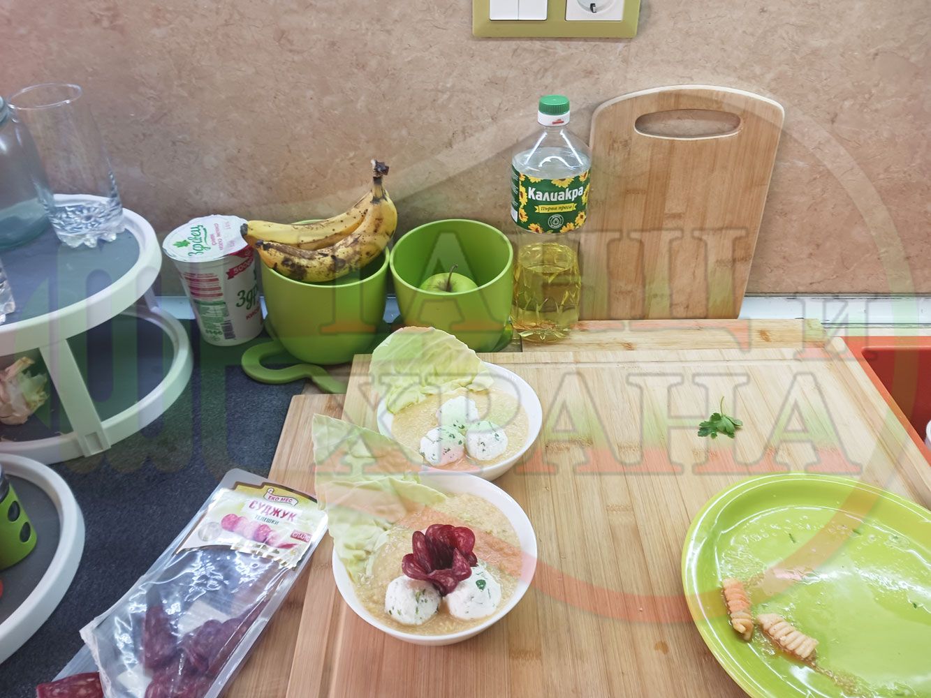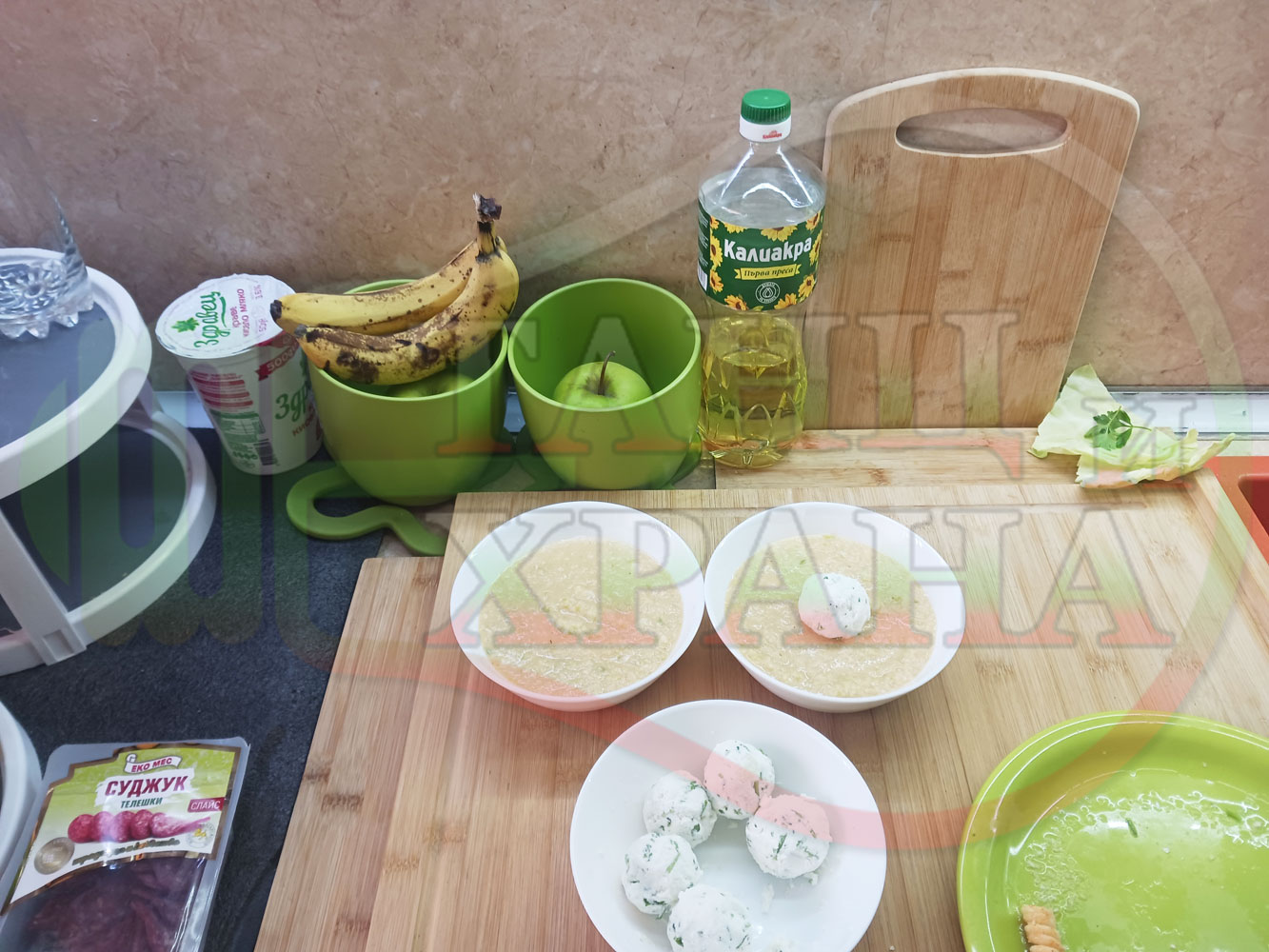Българска зелева сурова супа "Зелевомакароненососова с БГсирене" приготвена с прясно зеле и червенопиперен сос от макарони гарнирана със суджук и топчета от сиренов крем с магданоз, чесън и краве бяло сирене (българско, саламурено) - производна