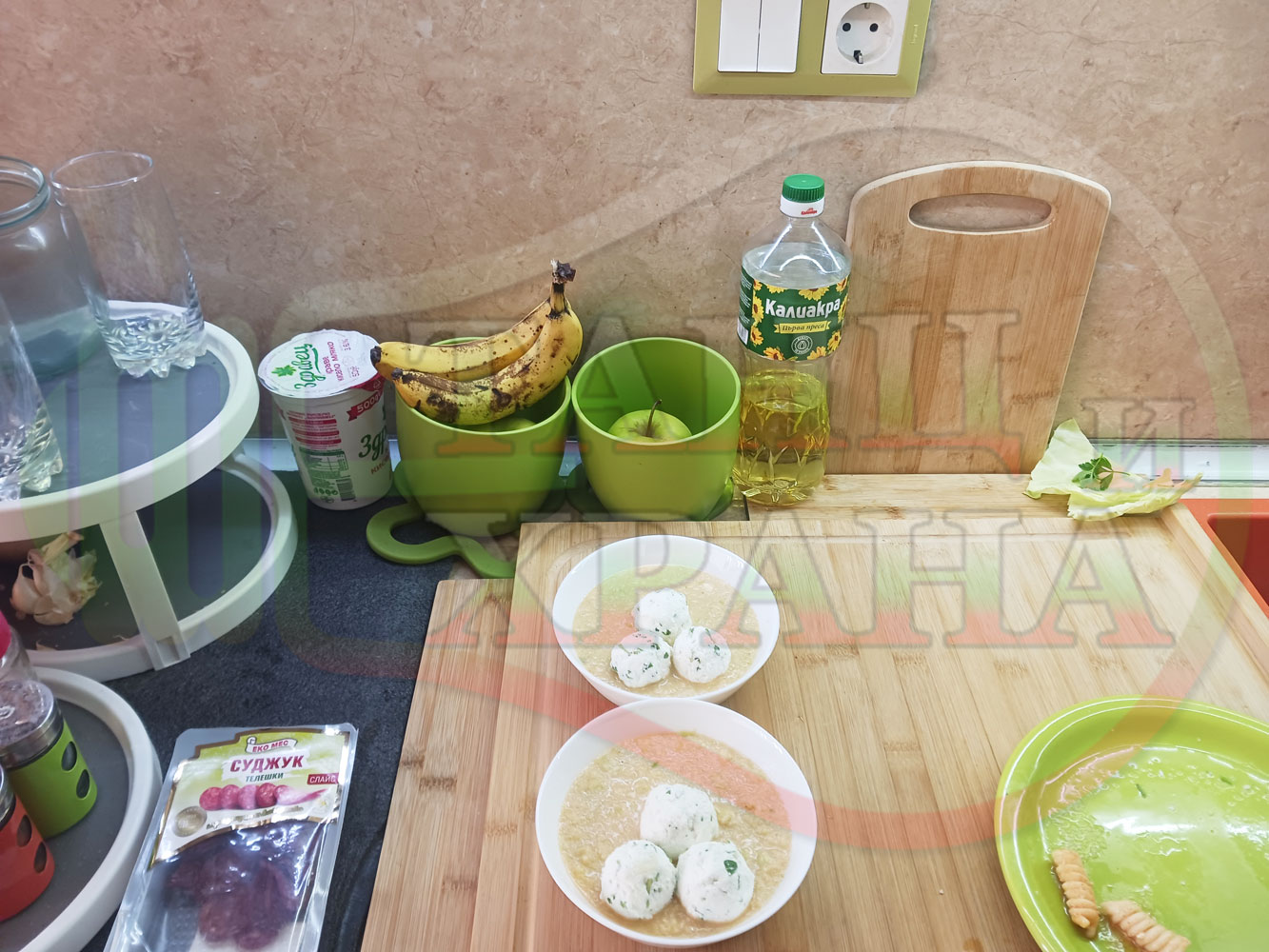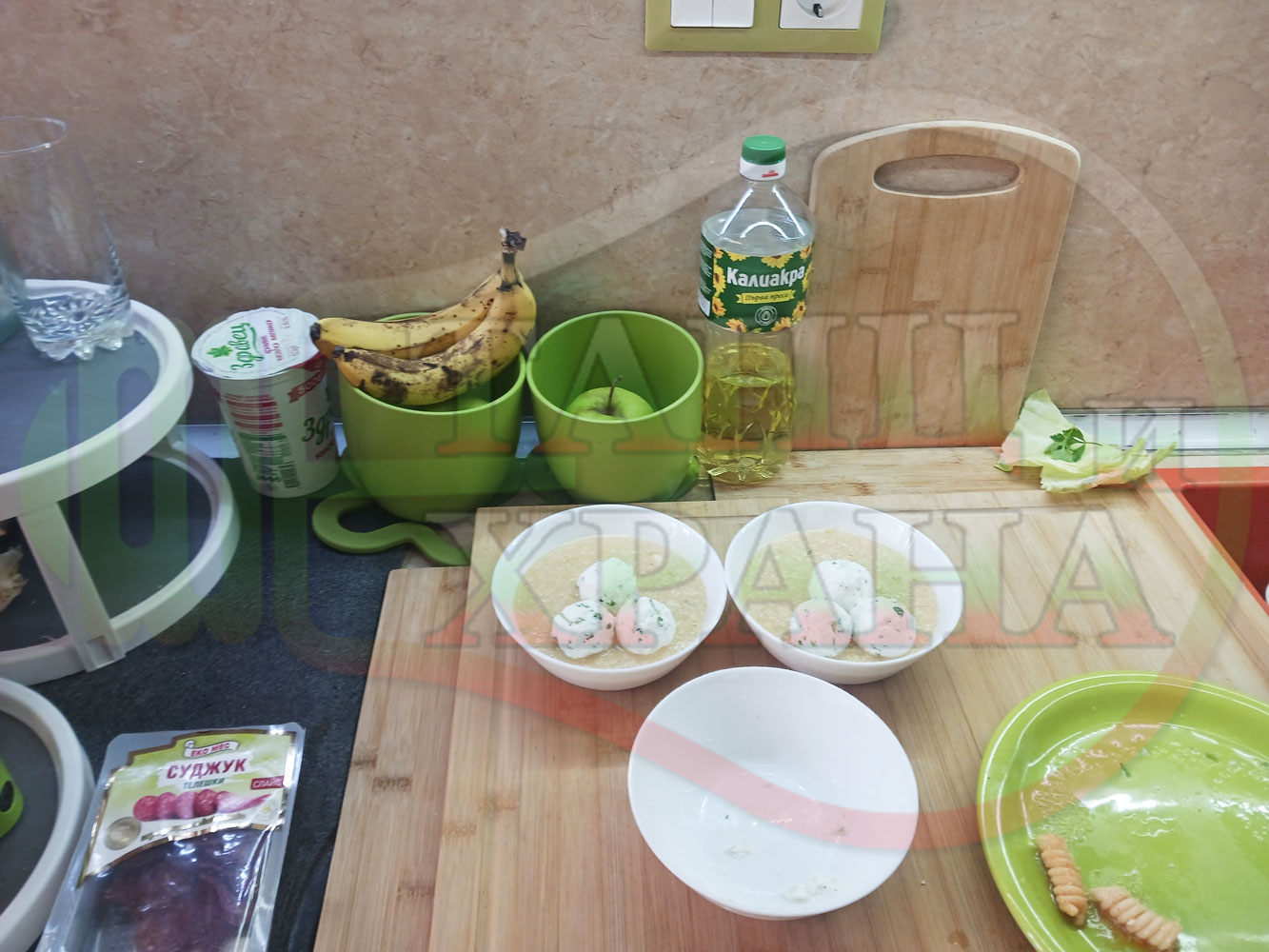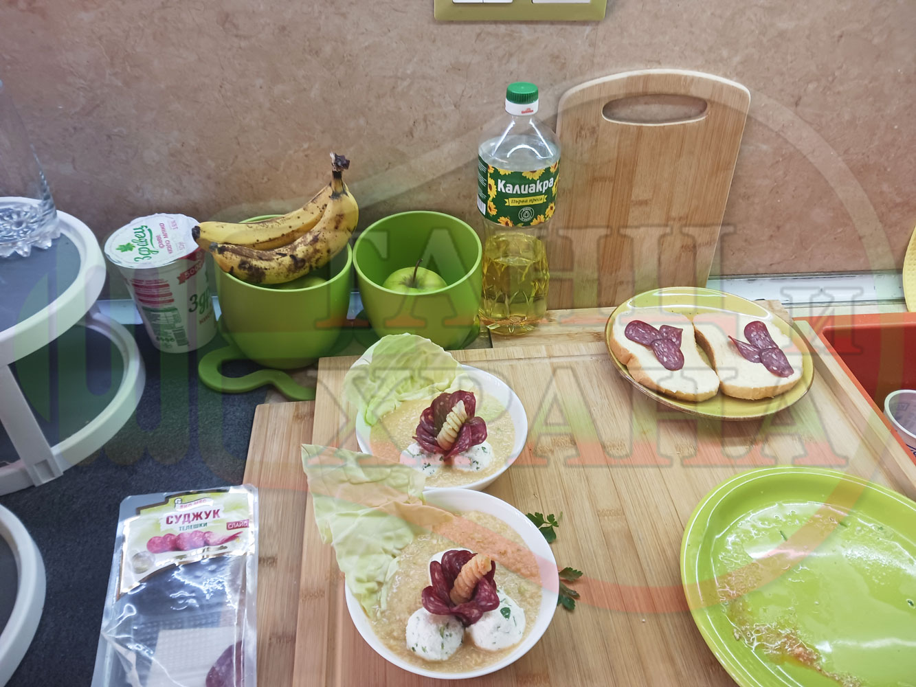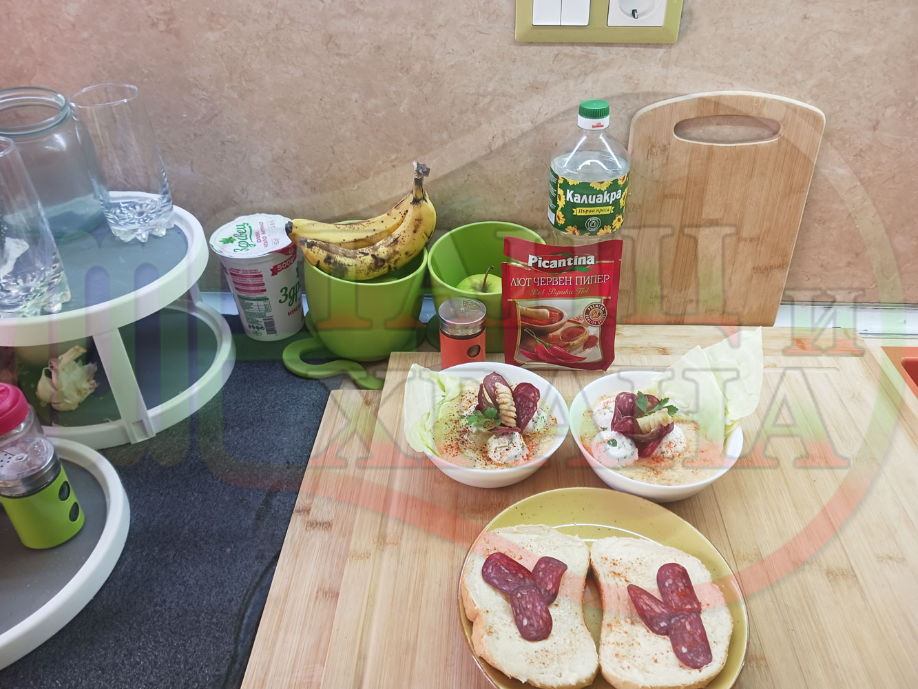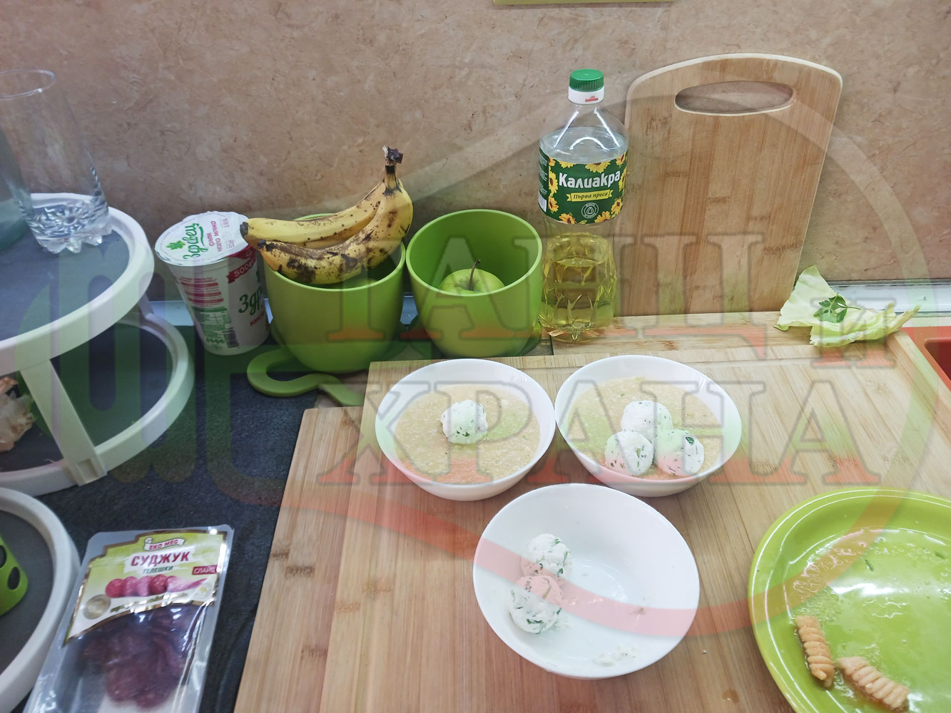 Българска зелева сурова супа "Зелевомакароненососова с БГсирене" приготвена с прясно зеле и червенопиперен сос от макарони гарнирана със суджук и топчета от сиренов крем с магданоз, чесън и краве бяло сирене (българско, саламурено) - производна