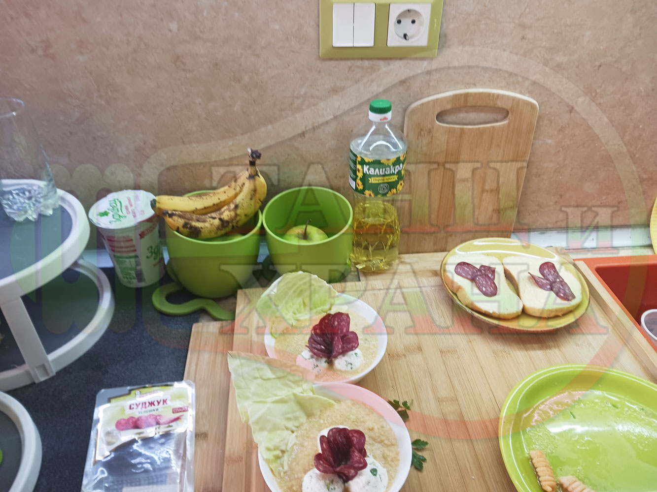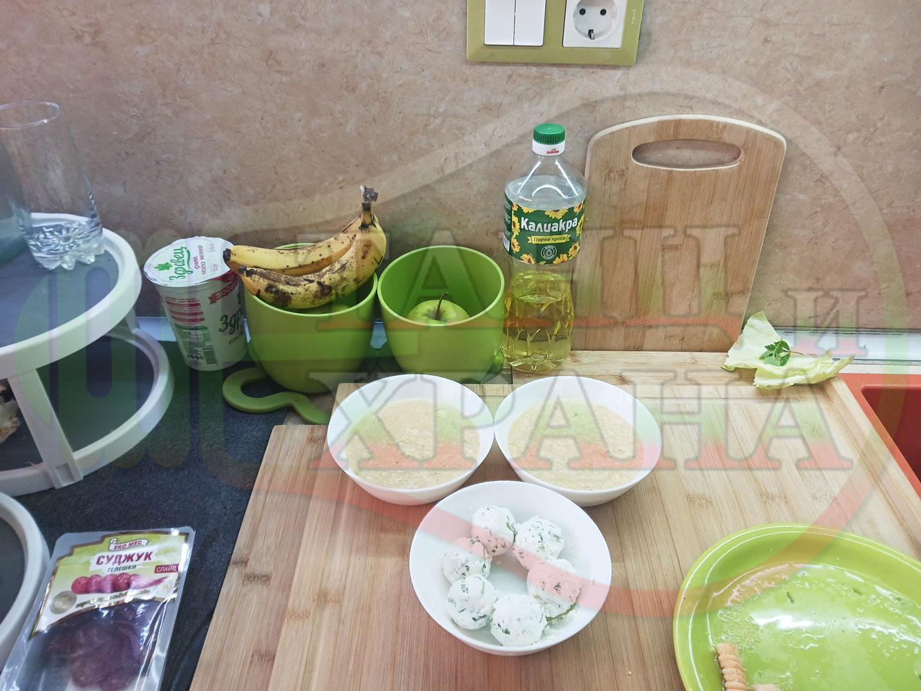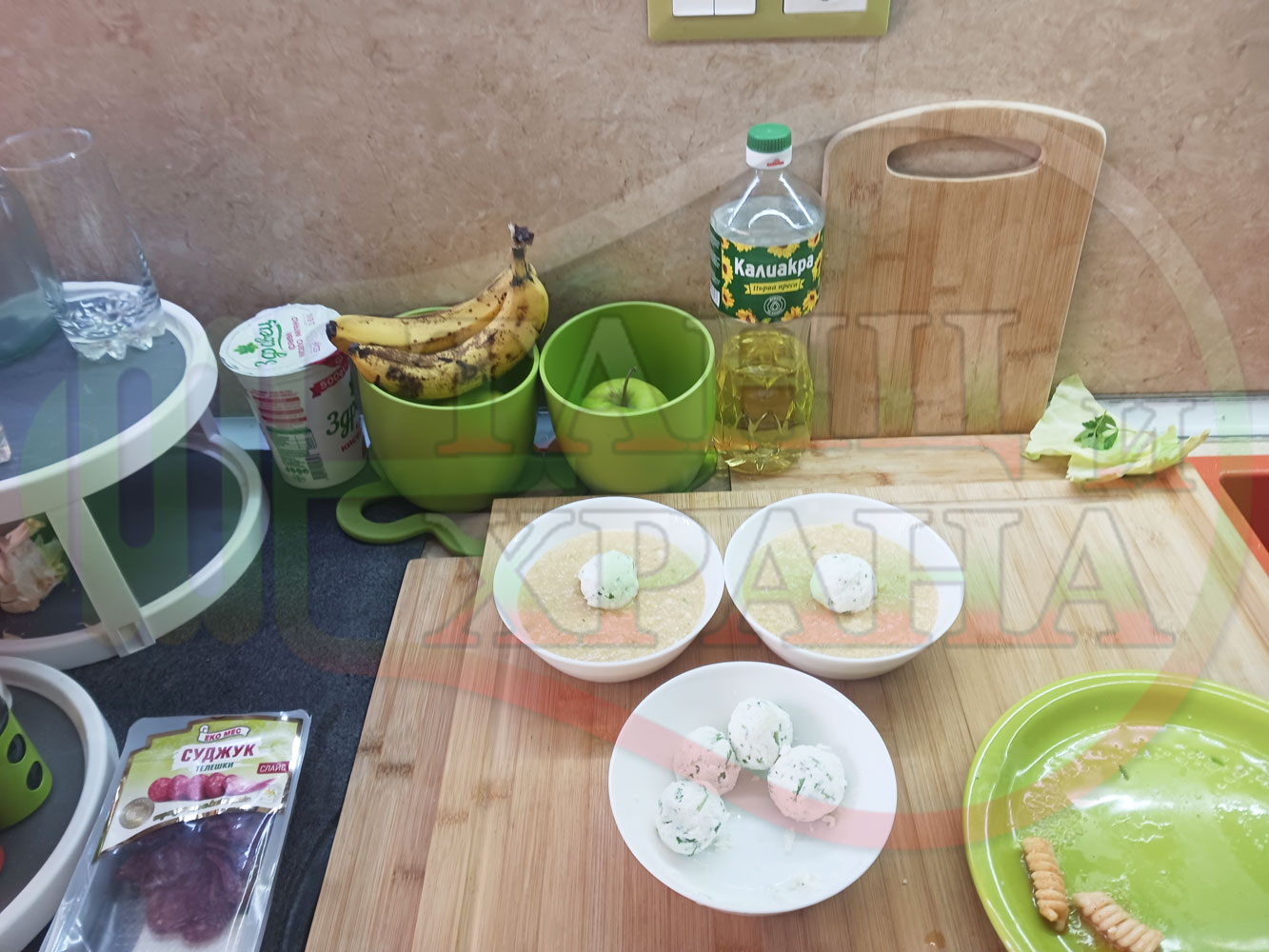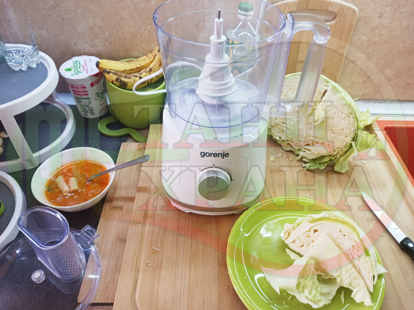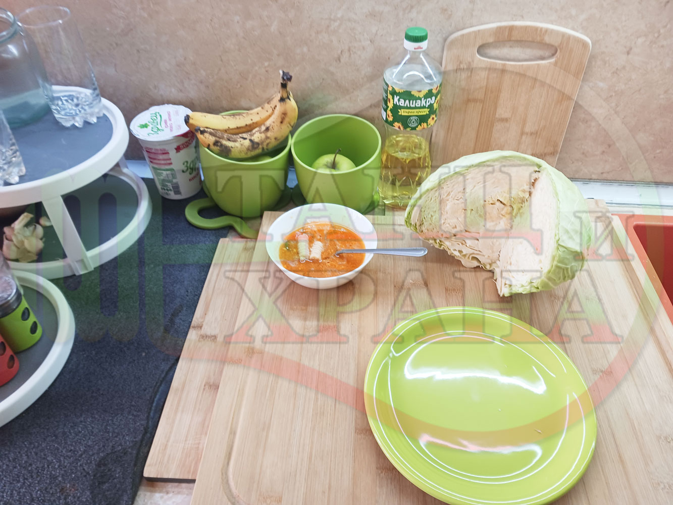 Българска зелева сурова супа "Зелевомакароненососова с БГсирене" приготвена с прясно зеле и червенопиперен сос от макарони гарнирана със суджук и топчета от сиренов крем с магданоз, чесън и краве бяло сирене (българско, саламурено) - производна