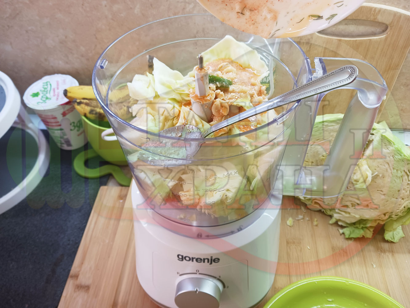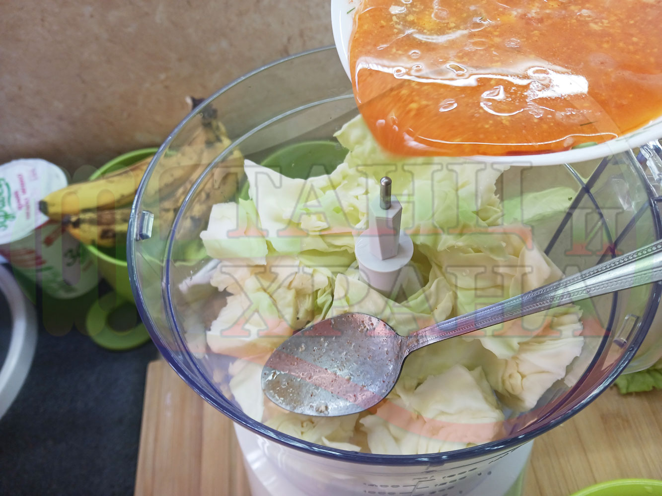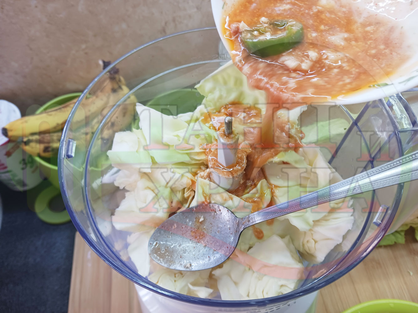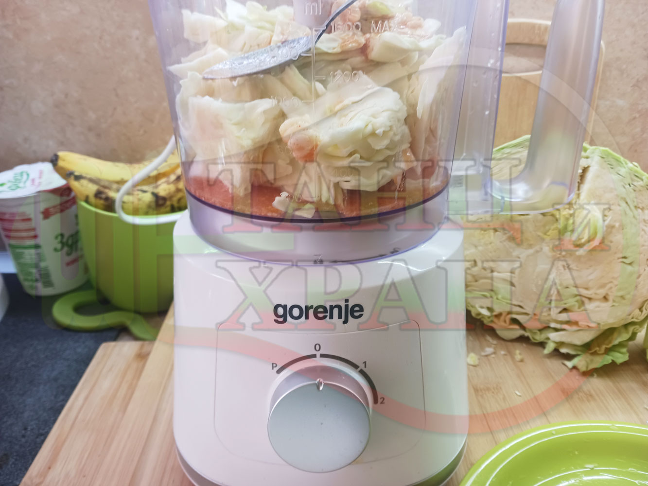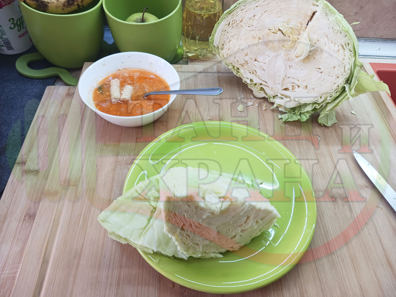 Измийте зелето, нарежете го на едро в чопъра и сипете соса от сваряването на макароните с червен сладък пипер (заделете зелеви листа за украса). Сипете хладка вода от чешмата или "овкусена" от соса и разбийте с чопъра продуктите до образуване на средно гъста зелева макароненососова, хомогенизирана супа (зелева супа).