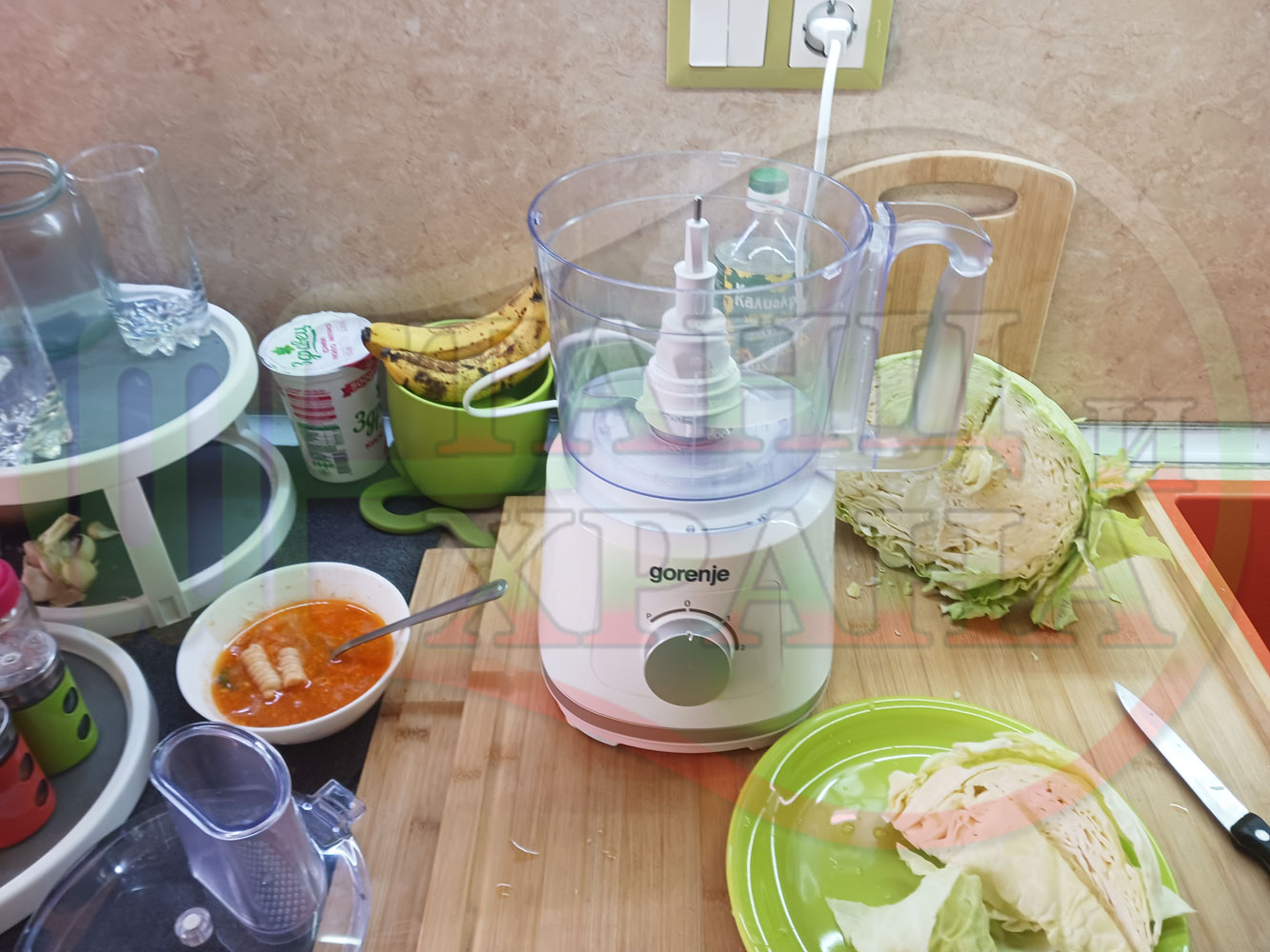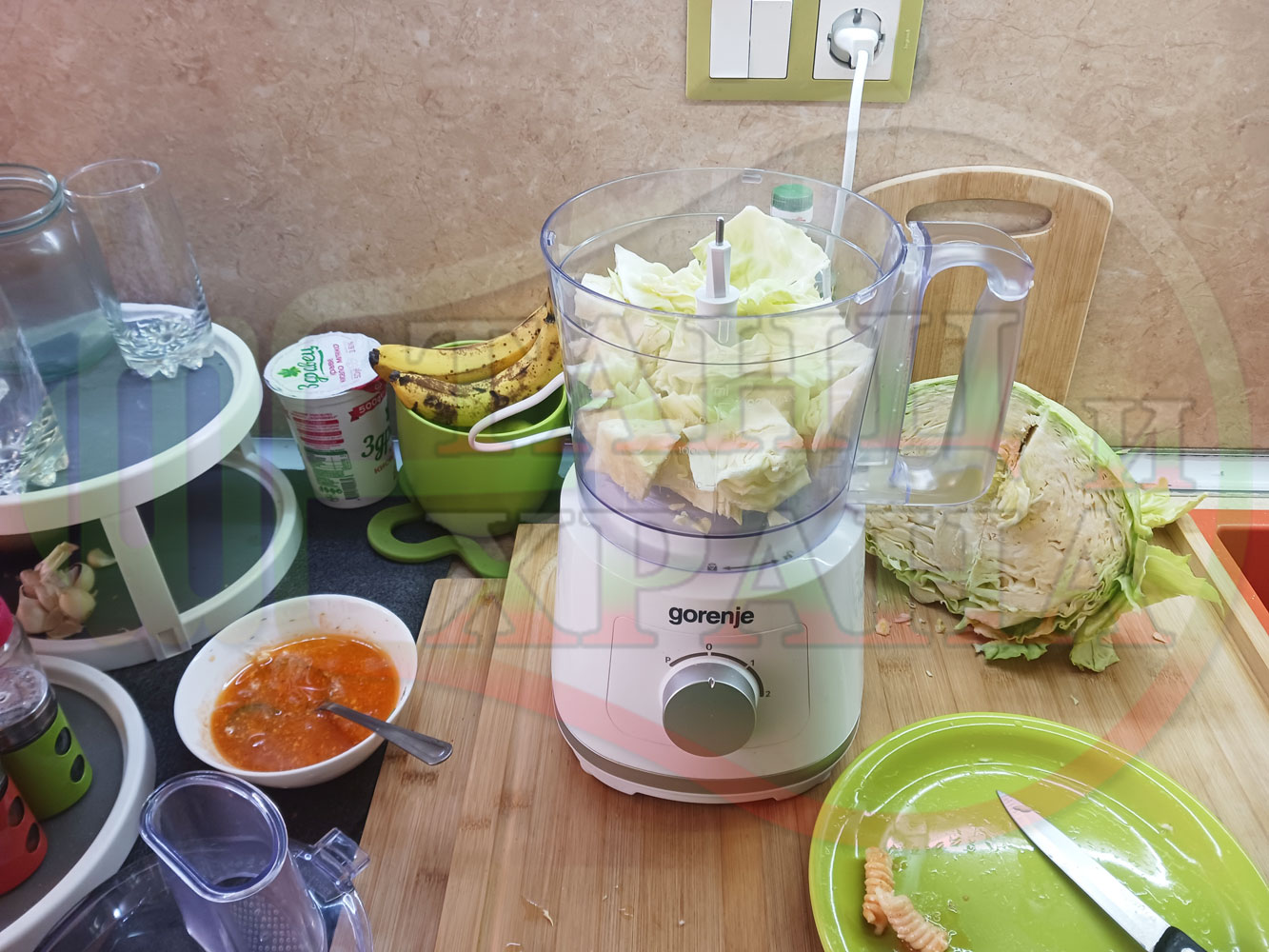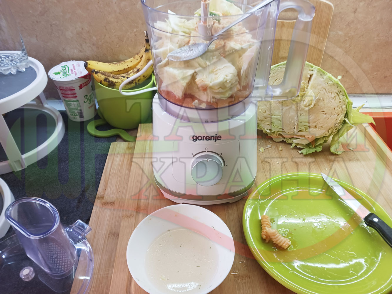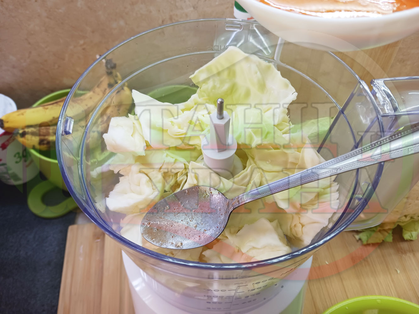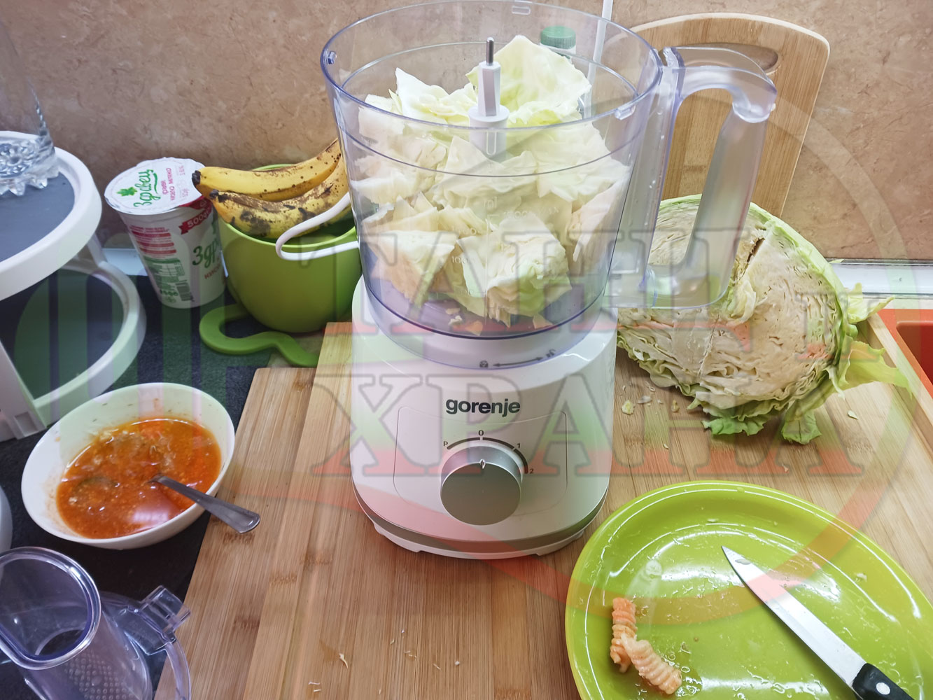 Измийте зелето, нарежете го на едро в чопъра и сипете соса от сваряването на макароните с червен сладък пипер (заделете зелеви листа за украса). Сипете хладка вода от чешмата или "овкусена" от соса и разбийте с чопъра продуктите до образуване на средно гъста зелева макароненососова, хомогенизирана супа (зелева супа).