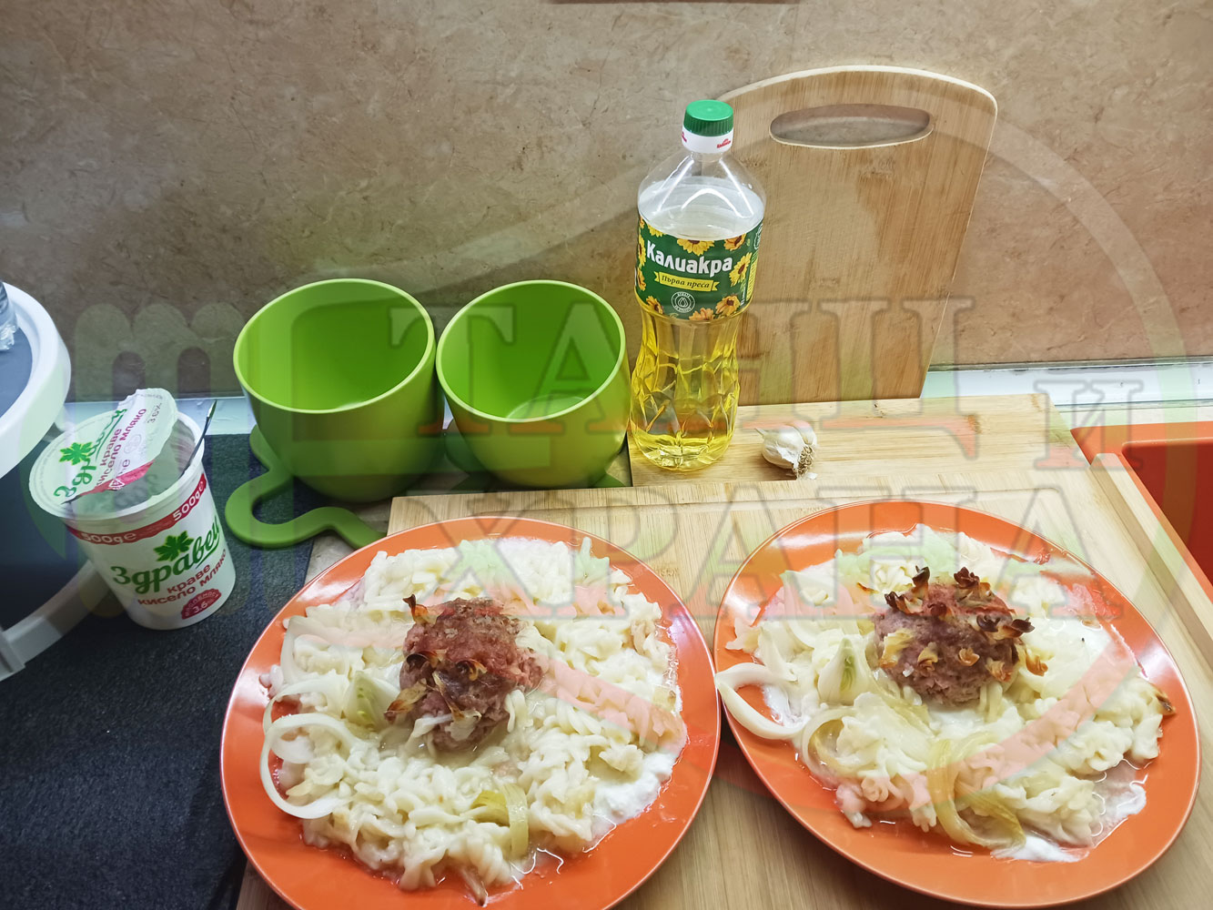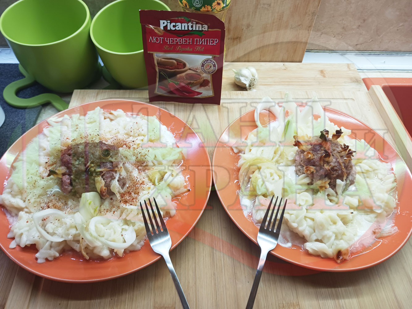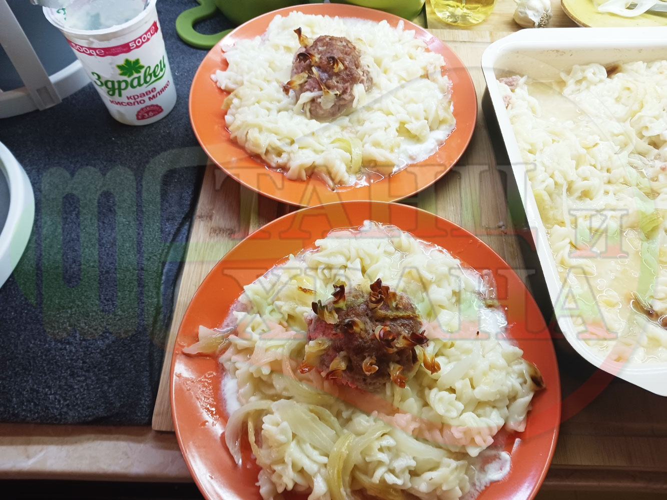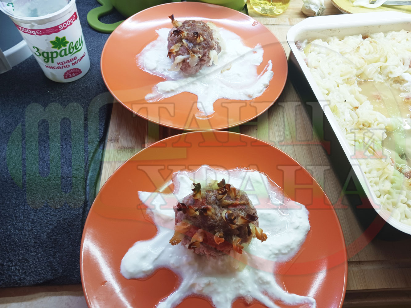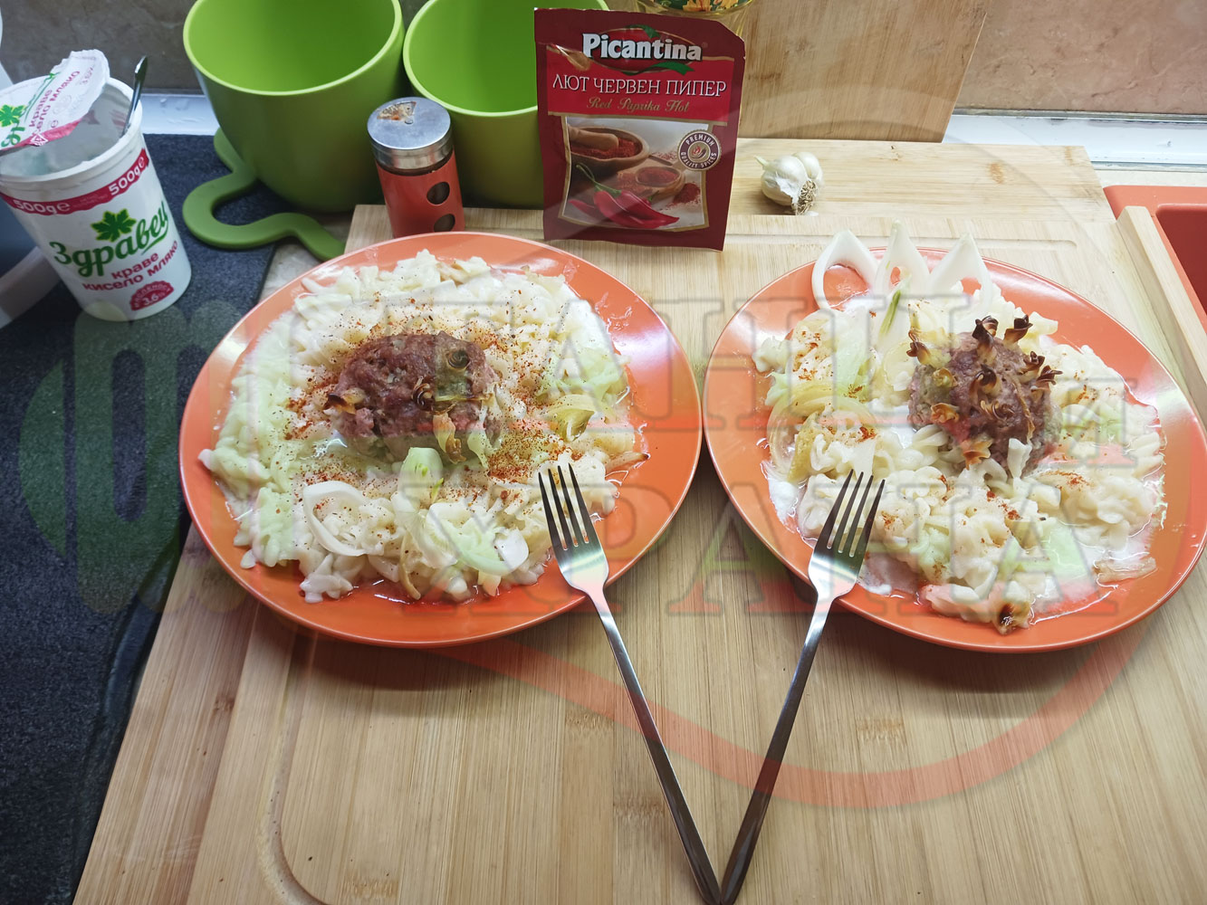 Спретнах изключително вкусни макарони с каймяни топчести кюфтета от неовкусена кайма, които набодох с малка част от витите макарони. Сварих и леко запекох топчестите макарони на фурна с кромид лук и ги гарнирах с млечна основа с българско кисело мляко от България. Макароните се получиха изключително вкусни, обогатени от соковете на каймата и сладостта на леко карамелизирания кромид лук и отново се получи невероятна вкусно, вкусна, вкусотия (вкуснотия). ![]()