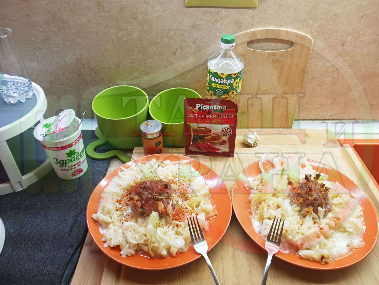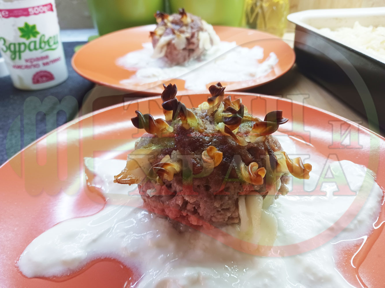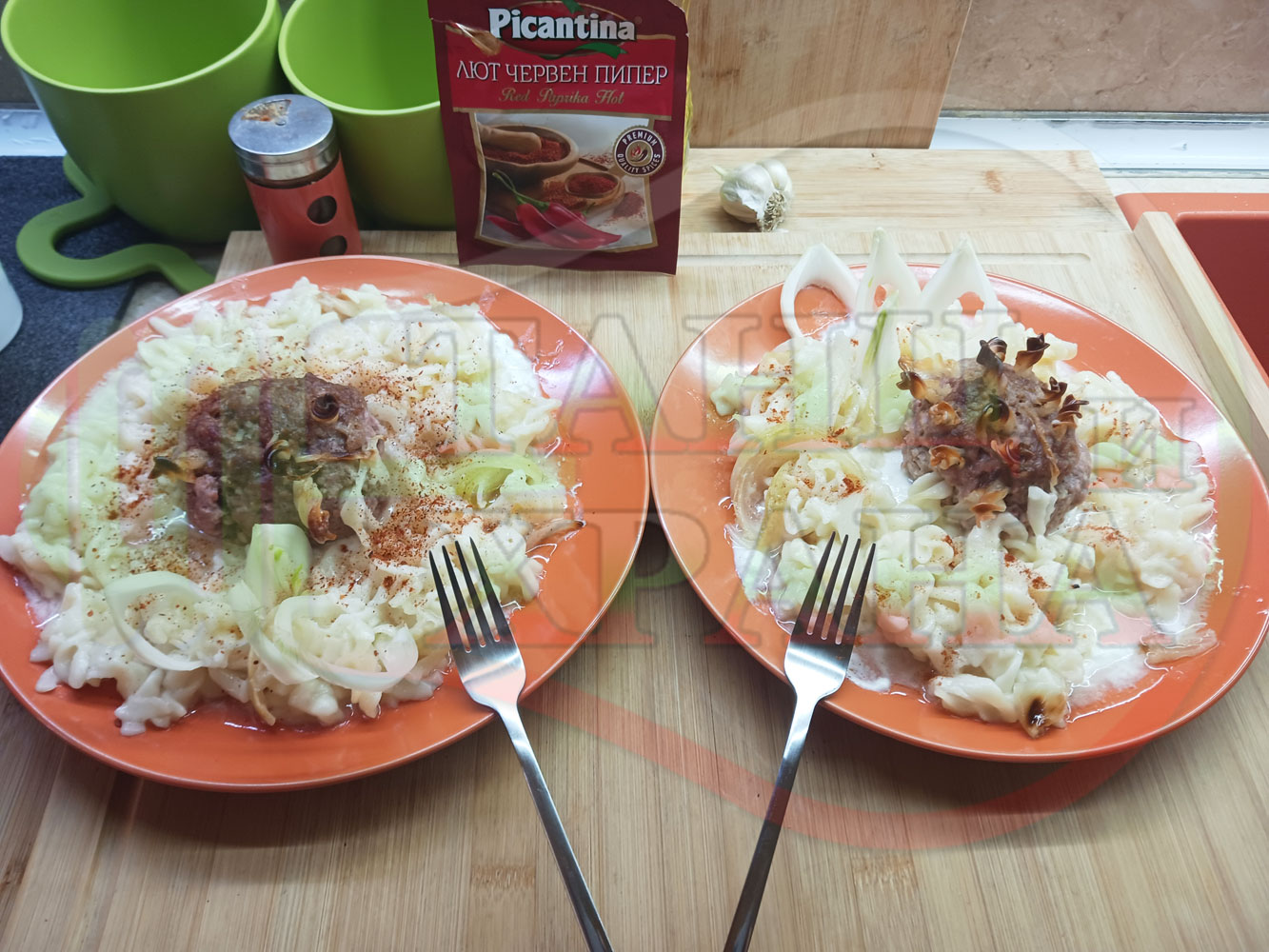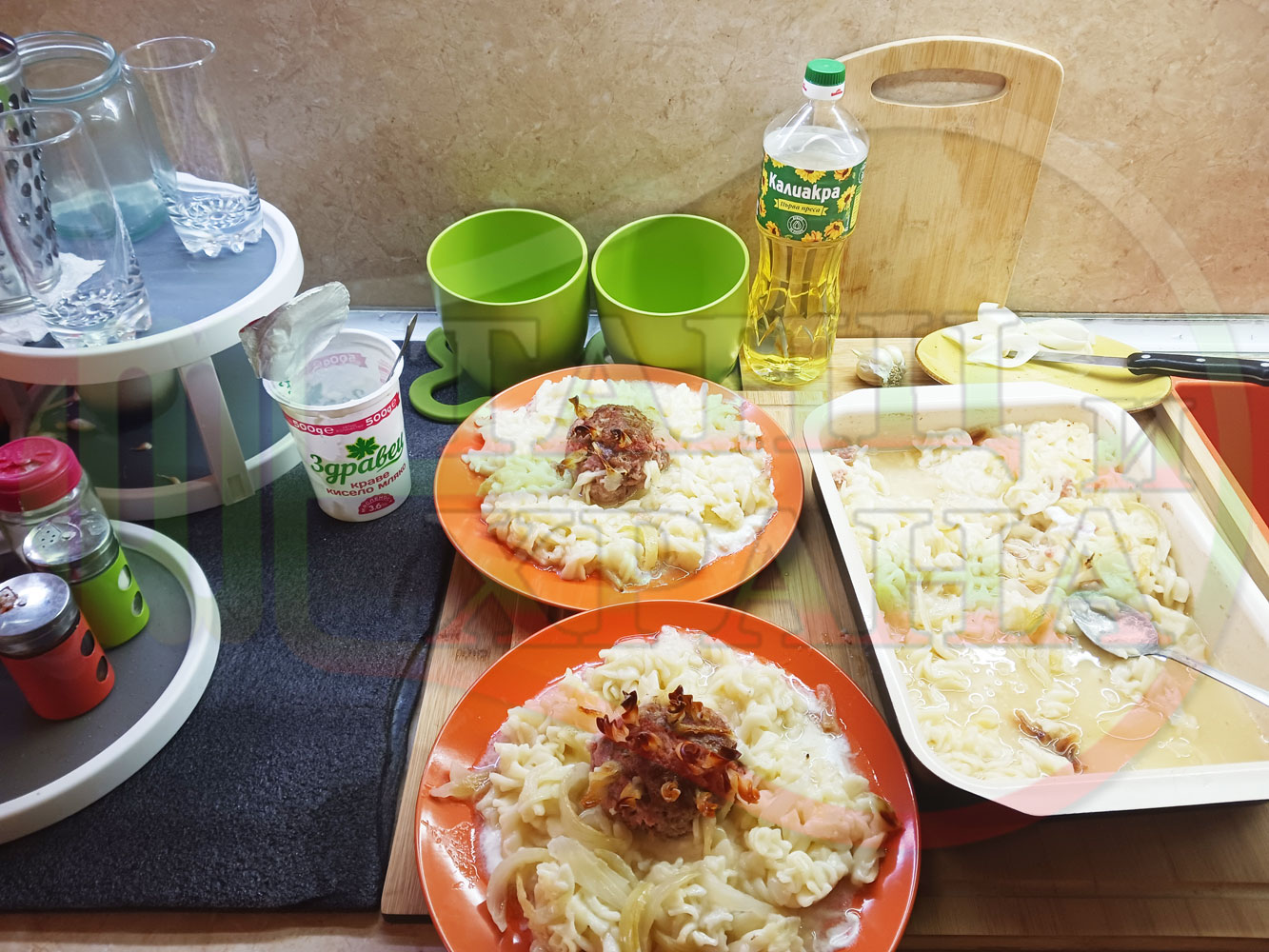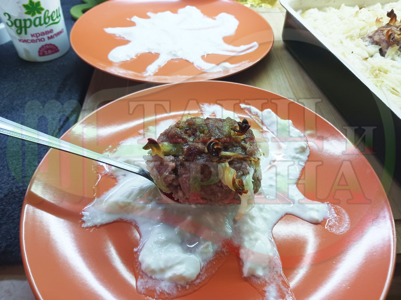 Спретнах изключително вкусни макарони с каймяни топчести кюфтета от неовкусена кайма, които набодох с малка част от витите макарони. Сварих и леко запекох топчестите макарони на фурна с кромид лук и ги гарнирах с млечна основа с българско кисело мляко от България. Макароните се получиха изключително вкусни, обогатени от соковете на каймата и сладостта на леко карамелизирания кромид лук и отново се получи невероятна вкусно, вкусна, вкусотия (вкуснотия). ![]()