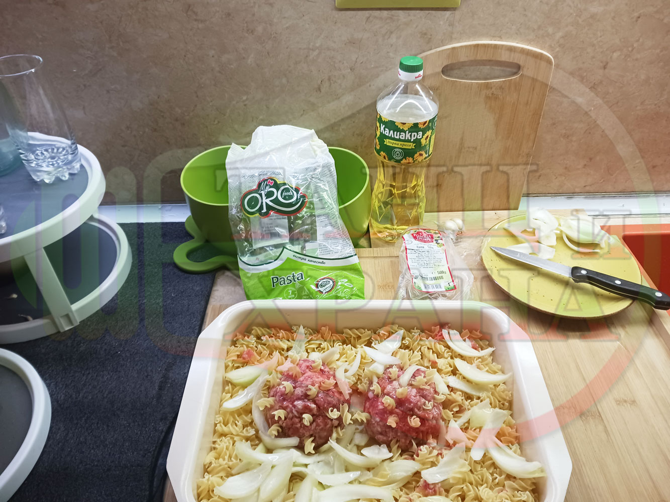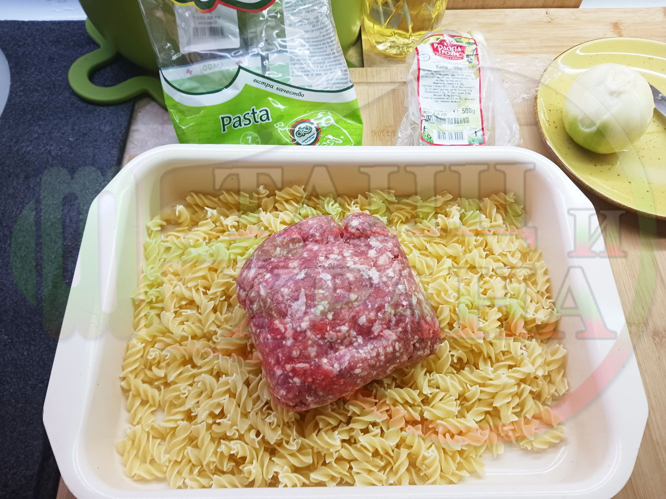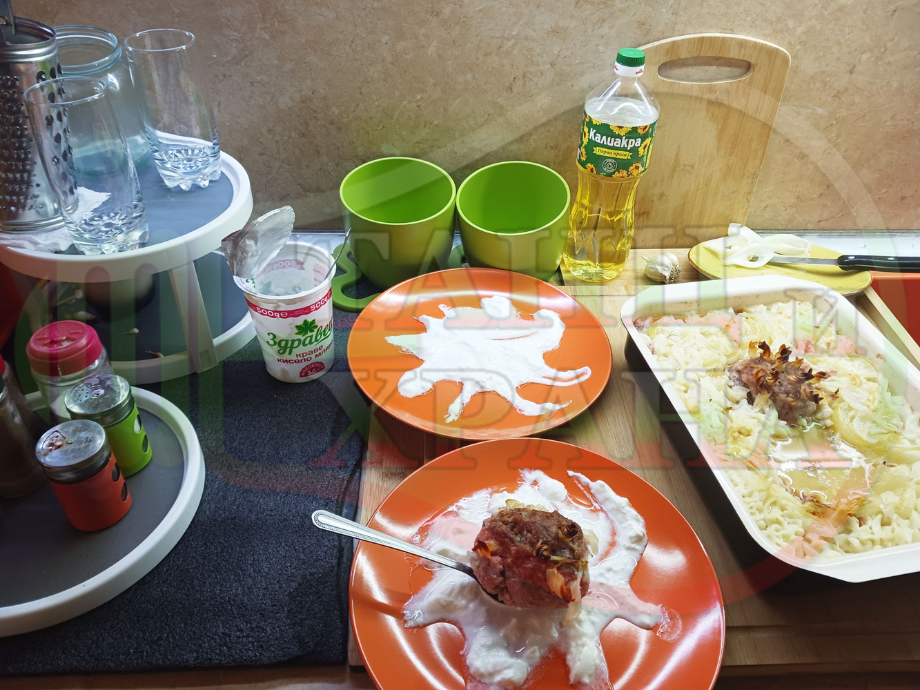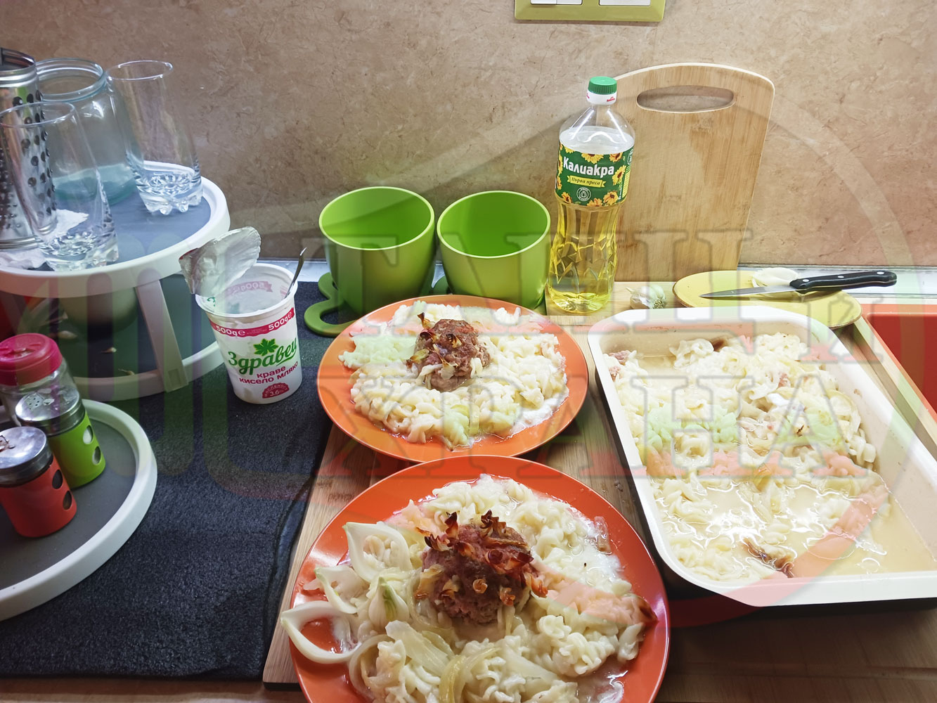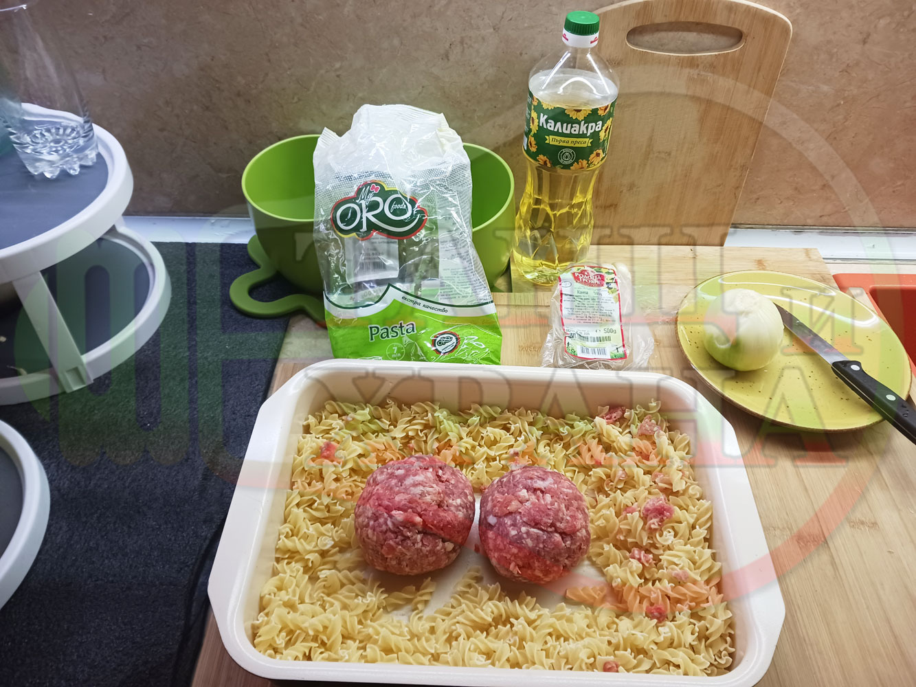Спретнах изключително вкусни макарони с каймяни топчести кюфтета от неовкусена кайма, които набодох с малка част от витите макарони. Сварих и леко запекох топчестите макарони на фурна с кромид лук и ги гарнирах с млечна основа с българско кисело мляко от България. Макароните се получиха изключително вкусни, обогатени от соковете на каймата и сладостта на леко карамелизирания кромид лук и отново се получи невероятна вкусно, вкусна, вкусотия (вкуснотия). ![]()